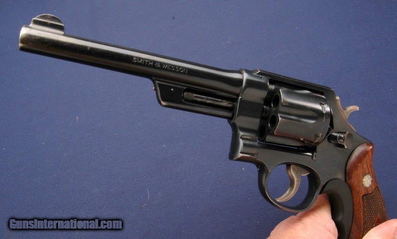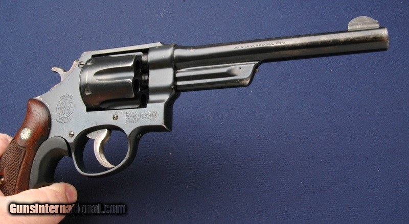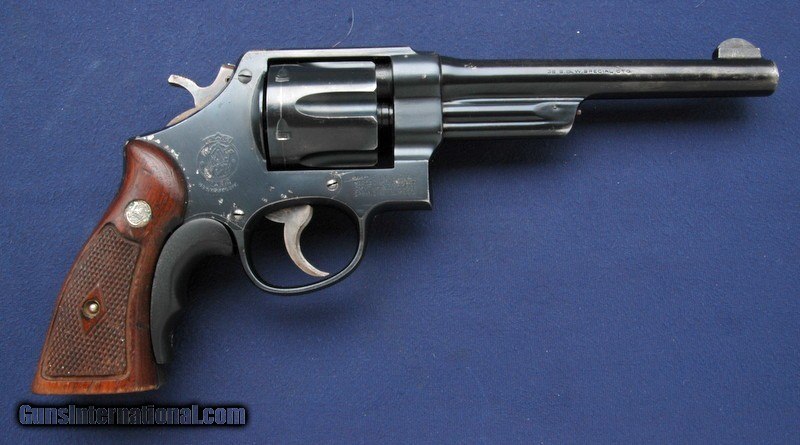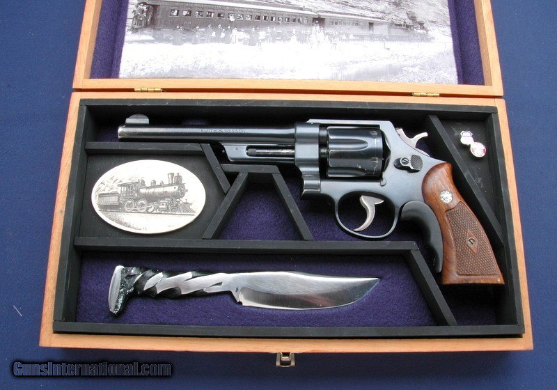 Description: Nice original S&W 38/44 with the original numbered grips. Finish has signs of age, flaking, patina and some high edge wear, etc, but still presents very will and is tight. Bright bore and cylinders, service width hammer and trigger. Cased in a train motif with some scrimshaw and a custom knife forged from a twisted railroad spike, maker appears to be "Engel". $55 shipping to the lower 48, 3% surcharge for using a CC. If you choose to pay with a personal check, we will hold the item for up to 10 days to make sure that it clears. Please expedite such pymts as we will hold an item on your word for 5 days. SOLD |