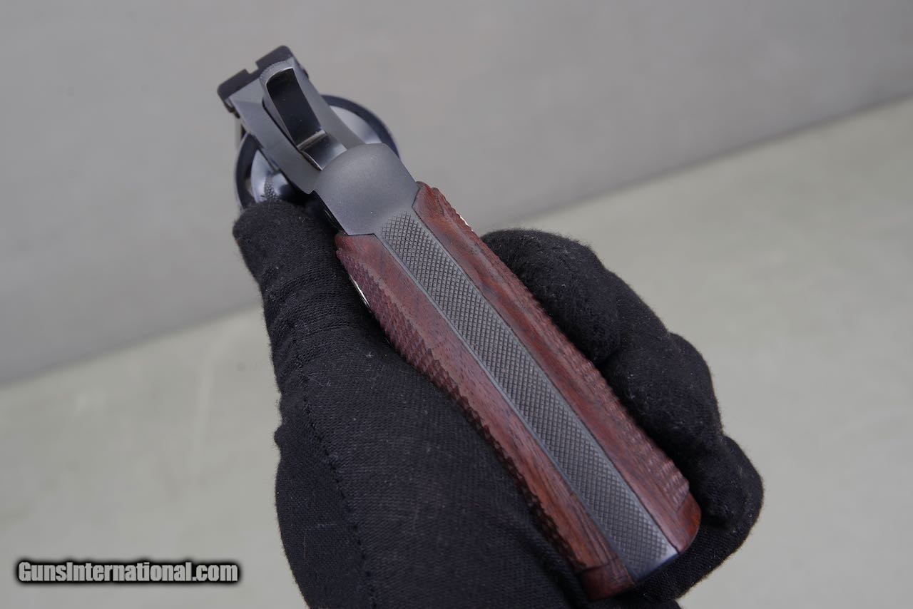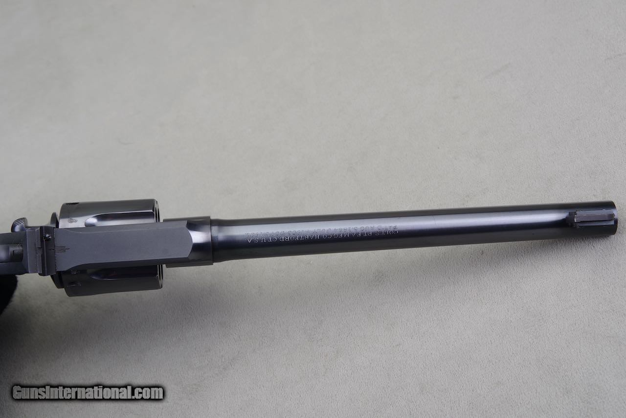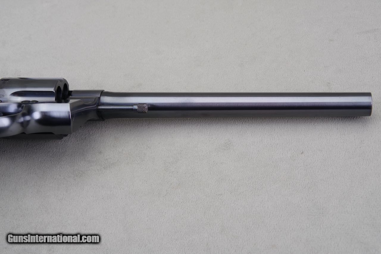 Description: 1940 Colt Officers Model Target chambered in 38 special with a 7.5 inch barrel and factory oven blue finish. This is a Battle of Britain gun. In 1940 the British Purchasing Commission was literally buying anything and everything they could to arm the civilian population in anticipation of a Nazi invasion as the air war was in full swing over England at the time. As the invasion never happened most of these were returned after the war un-issued. As seen in the photos this one has all of the proper British proof stamps on the frame, barrel, and cylinder. This is a no excuses collector grade gun. As seen in the photos it is near perfect and overall the finish rates a very strong 99%+. The cylinder face, recoil shield, and forcing cone are very clean. The action is crisp, the lock up is tight, and the boar is bright and shiny with strong lands and grooves. The factory grips are in the same excellent condition as the gun itself with sharp checkers throughout. SOLD Curio/Relic: Yes Handgun Caliber: .38 Special Manufacturer: Colt Model: Officers Model Target Serial Number: 646100 |