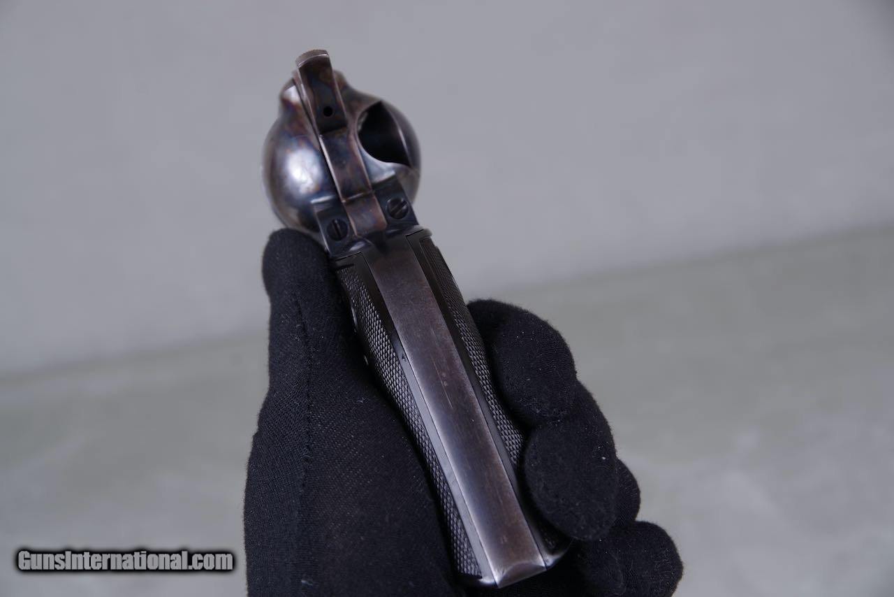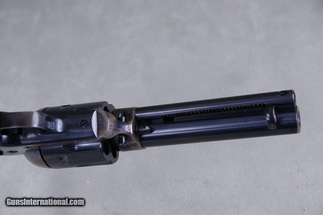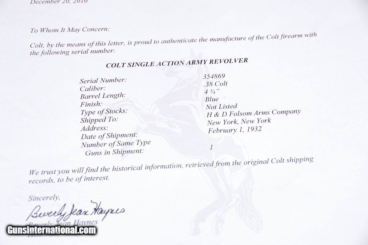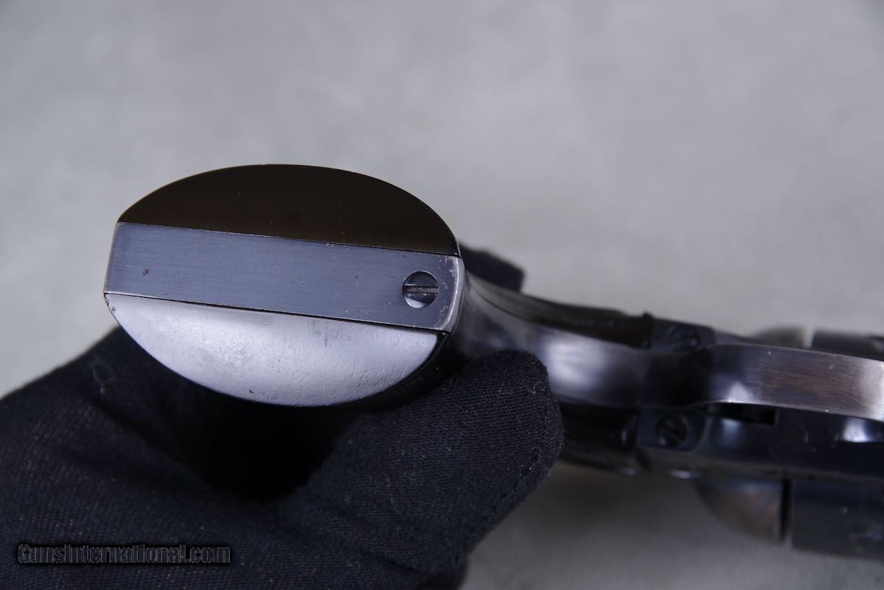 Description: 1932 Colt Pre War SAA chambered and 38 special with a 4.75 inch barrel and blue/color cased finish. Per the included Colt archive letter it was shipped February 1, 1932 to New York, New York. You will notice that the letter says 38 Colt as this is a common practice for them as they don't like to list S&W calibers on the letters. Also included is it's correct and authentic box but please note that the number on the bottom is too faded to read. It is also worth noting that any single action and 38 special is fairly scarce. This is a high condition all original survivor. All numbers match on the frame, grip frame, cylinder, and grips. The bluing still retains a deep dark shine throughout and most of the color casing is still fairly strong. There is some lighand scattered handling the most predominant being some minor thinning on the straps. Overall the finish rates 97%. The bore is bright and shiny with strong lands and grooves. All four clicks are crisp and the lock up is tight. The original grips are in very high condition with sharp checkers throughout. This is a very nice 91-year-old package. SOLD Curio/Relic: Yes Handgun Caliber: .38 Special Manufacturer: Colt Model: SAA |