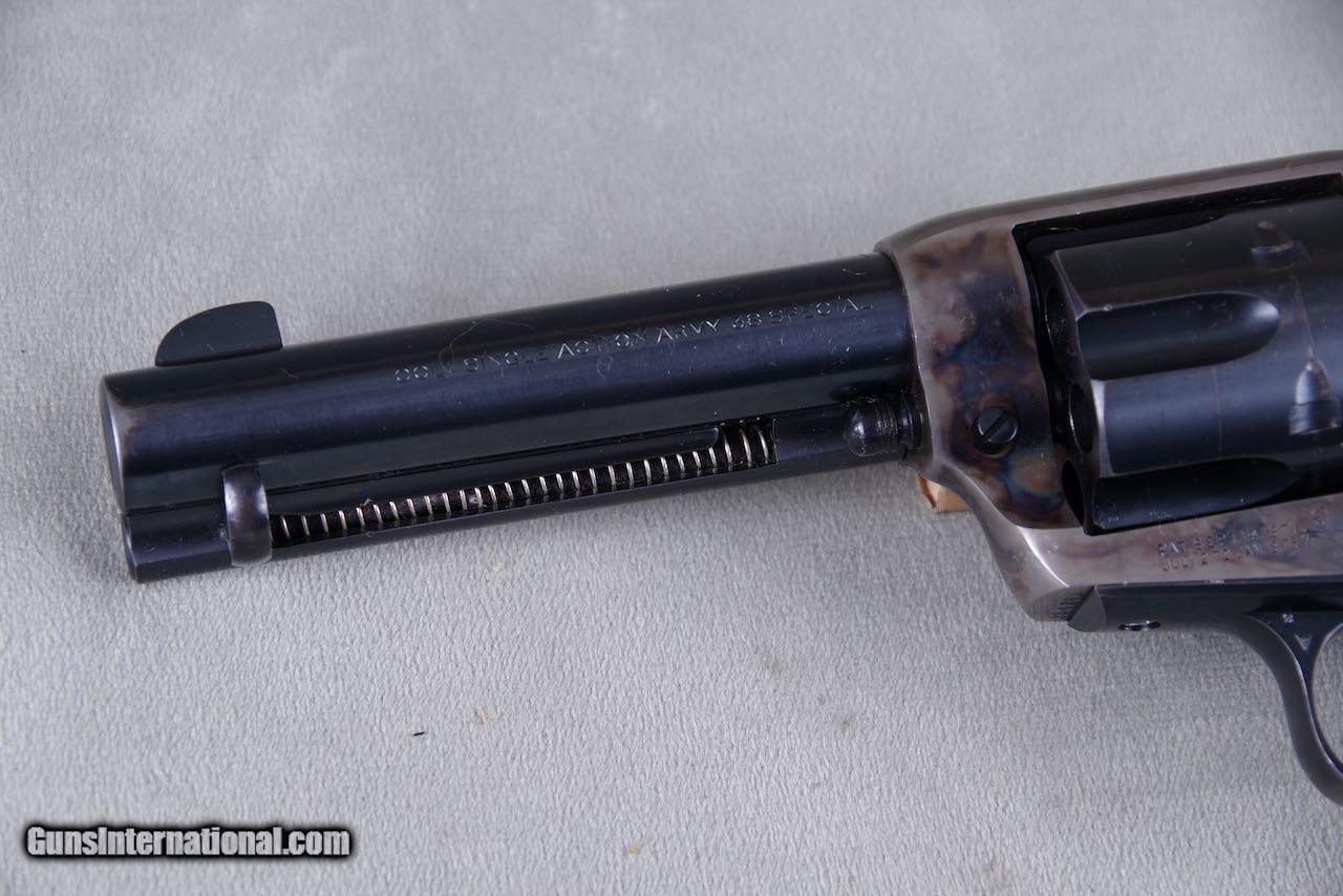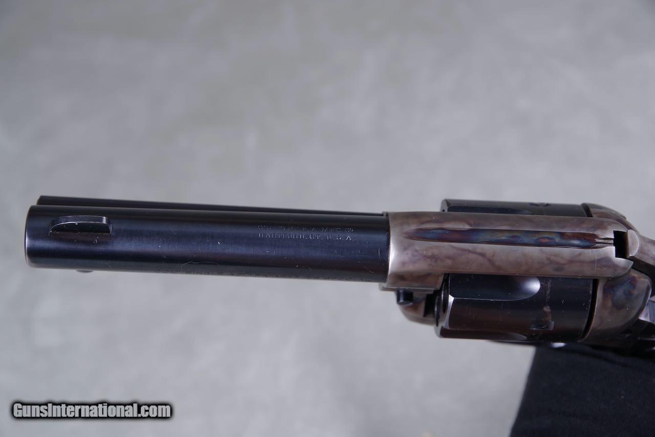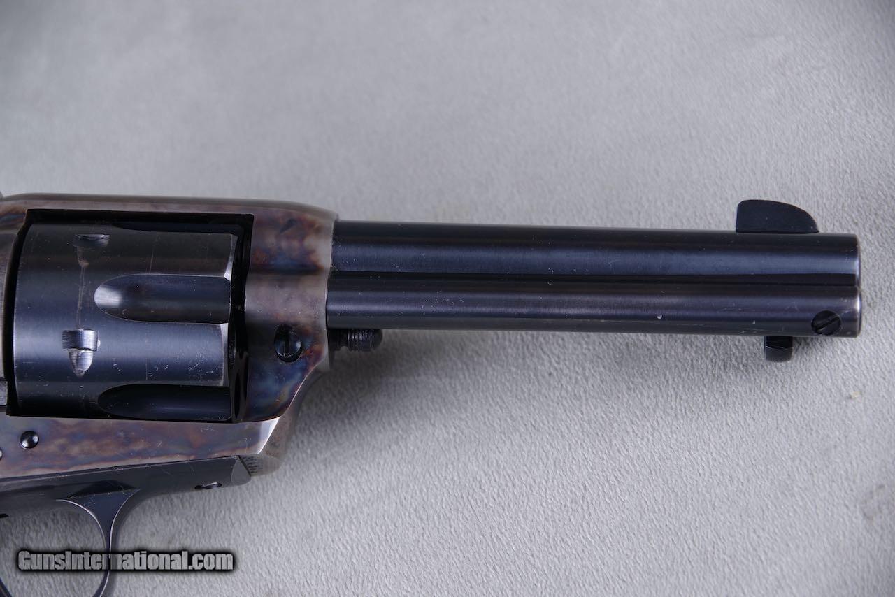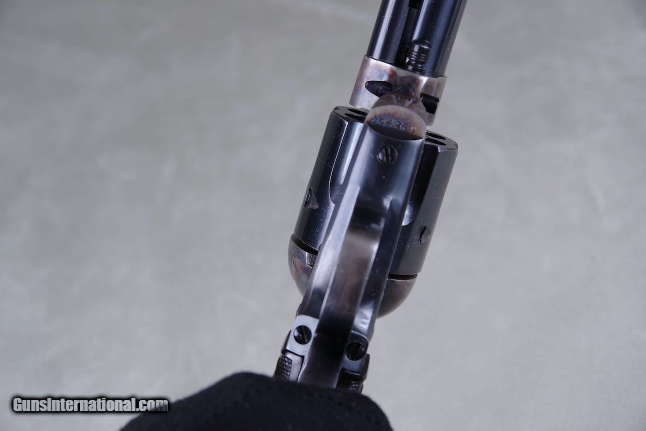Description: 1932 Colt Pre War SAA chambered and 38 special with a 4.75 inch barrel and blue/color cased finish. Per the included Colt archive letter it was shipped February 1, 1932 to New York, New York. You will notice that the letter says 38 Colt as this is a common practice for them as they don't like to list S&W calibers on the letters. Also included is it's correct and authentic box but please note that the number on the bottom is too faded to read. It is also worth noting that any single action and 38 special is fairly scarce. This is a high condition all original survivor. All numbers match on the frame, grip frame, cylinder, and grips. The bluing still retains a deep dark shine throughout and most of the color casing is still fairly strong. There is some lighand scattered handling the most predominant being some minor thinning on the straps. Overall the finish rates 97%. The bore is bright and shiny with strong lands and grooves. All four clicks are crisp and the lock up is tight. The original grips are in very high condition with sharp checkers throughout. This is a very nice 91-year-old package. SOLD Curio/Relic: Yes Handgun Caliber: .38 Special Manufacturer: Colt Model: SAA |