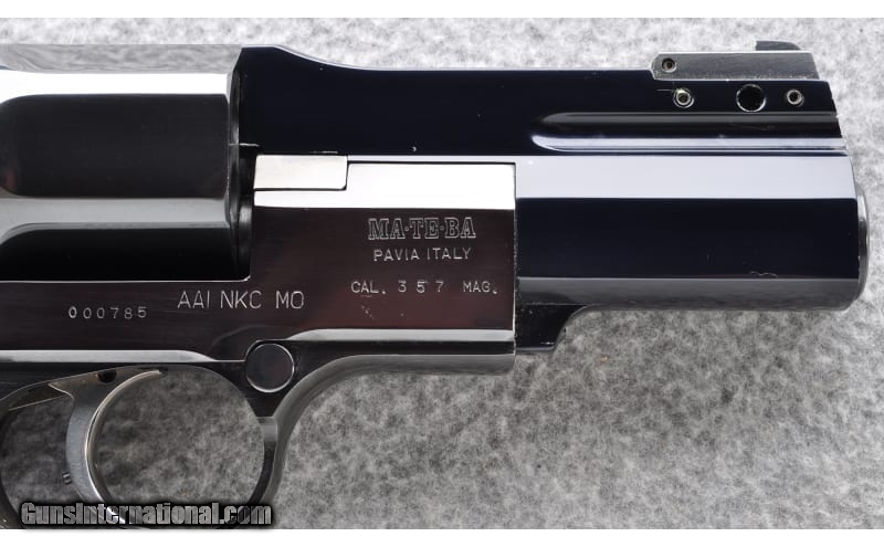 Description: This is a Mateba 6 Unica Autorevolver designed by Mechanical Engineer Emilio Ghisoni. The Date code BL on the left side of the frame indicates this revolver was manufactured in 1998. Importation marks show this revolver as imported by American Arms International, North Kansas City, Missouri. This Autorevolver appears in like new condition, retaining its highly polished blue finish. The bore is sharp and bright although appears to have been fired. Mr. Ghisoni was born in 1937 and passed in 2008. He also designed the Chiappa Rhino revolver. Ghisoni's firearm designs leaned toward competition shooting, and they are usually very high quality and rare, as the 6 Unica truly is. .357 Mag/.38 spl SOLD Chambers: .357 Smith & Wesson Magnum or .38 S&W Special in a six round revolving cylinder Metal Condition: Very good condition with no marks Wood Condition: Very good showing a couple of small marks on the left grip panel at the top. Bore Condition: Bright & Sharp Barrels: 4 Triggers: Single/Double action semi-automatic revolver Weight: 48 oz. Sights: "Adjustable blade front for elevation, Square notch leaf rear, both painted white Item Location: Grand Junction, CO |