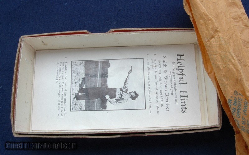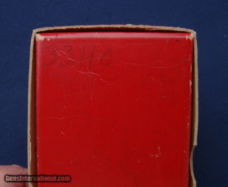 Description: I couldn't quite nail it down, but it looks like this little guy was produced in the very early 50's. Red box, square latch, diamond grips' right grip numbered to the gun. Diamond checkering very sharp so this has been handled very little. Grips did not want to come off- so it's prob the first time they've been removed since they were installed at the factory. Finish wear is virtually non-existent, only the lightest shadows on the face of the cylinder tell me its been fired. One cylinder full? 2? Very, very difficult to upgrade this one. $35 shipping to the lower 48, 3% surcharge for using a CC. If you choose to pay with a personal check, we will hold the item for up to 10 days to make sure that it clears. Please expedite such pymts as we will hold an item on your word for 5 days. SOLD Handgun Caliber: .38 Special |