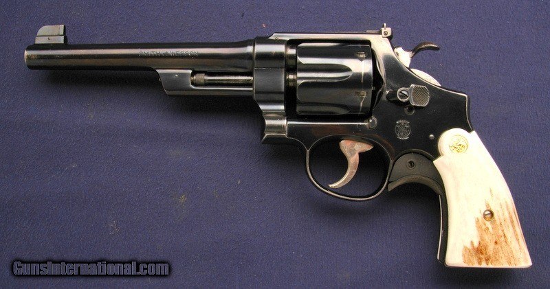 Description: Very nice, lightly customized .38 HD Outdoorsman. Appears to be 1934/35 production. Appears to be original bluing, it's very nice, the right color and all the markings are strong. 6 1/2" barrel with what I believe is a Kings front sight blade. The hammer has been jeweled and the hammer spur has been offset to the left, re contoured and re checkerd. Trigger has been nickeled and a nice set of stags with the S&W spacers and rubber knuckle pad installed. Clean, bright minty bore. Comes in an original period factory box that is not numbered. Tight lock up as well. $45 shipping to the lower 48, 3% surcharge for using a CC. If you choose to pay with a personal check, we will hold the item for up to 10 days to make sure that it clears. Please expedite such pymts as we will hold an item on your word for 5 days. SOLD |