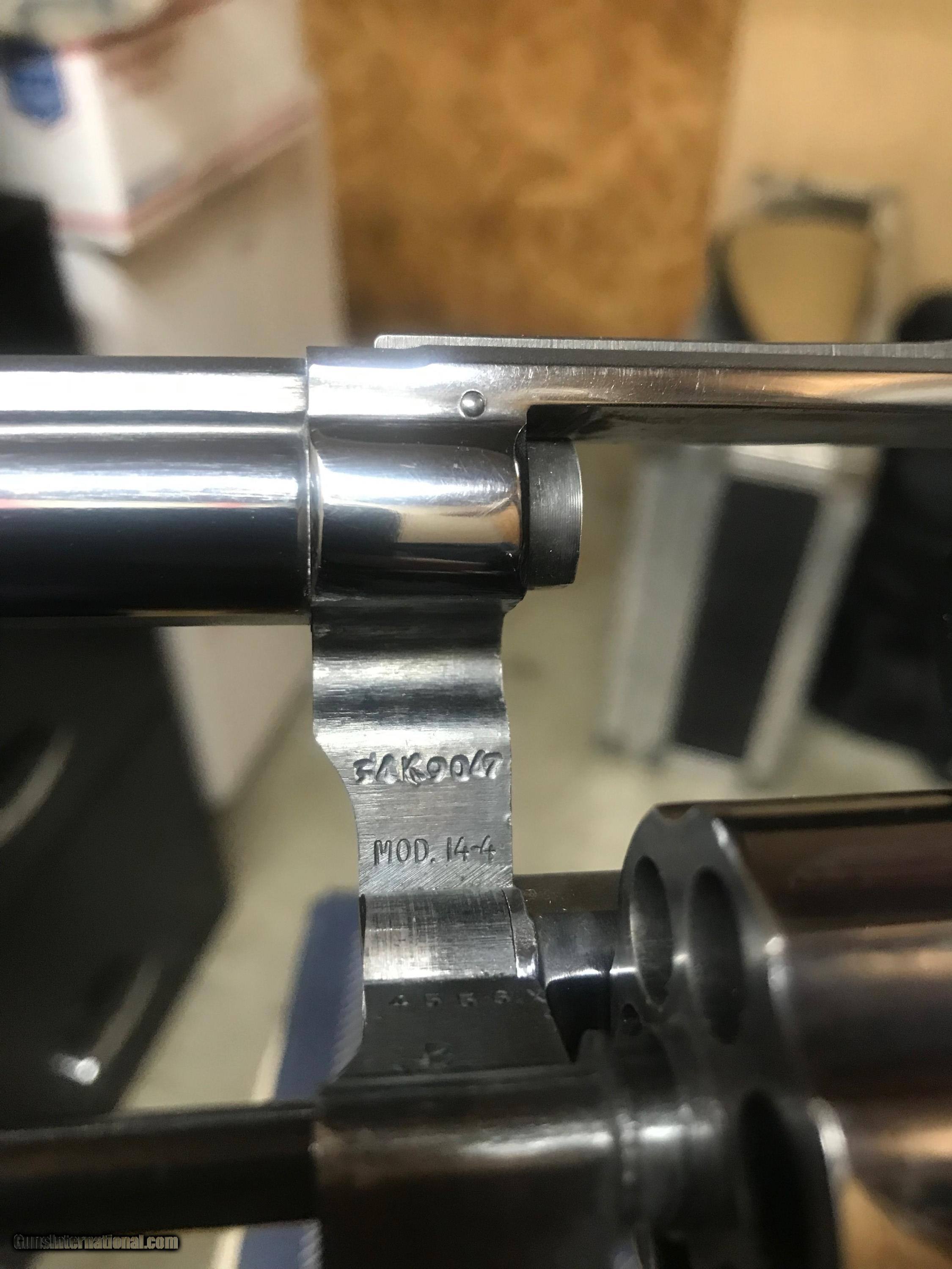 Description: My goodness what a nice 14! .38 special, 6 inch pinned barrel, blue finish, target hammer, trigger, sights, original numbered box, paper, and screwdriver. Beautiful set of target goncalo alves grips with just a touch of wear. Also includes a set of standard service k frame grips. A beautiful piece! Please email with questions. Shipping included. Cards add 3% SOLD Manufacturer: Smith and Wesson Model: 14-4 Barrel Length: 6 inch Condition: Used Metal Condition: Excellent Wood Condition: Excellent Bore Condition: Excellent Action: Double Finish: Blue Sights: Target Item Location: 37075 |