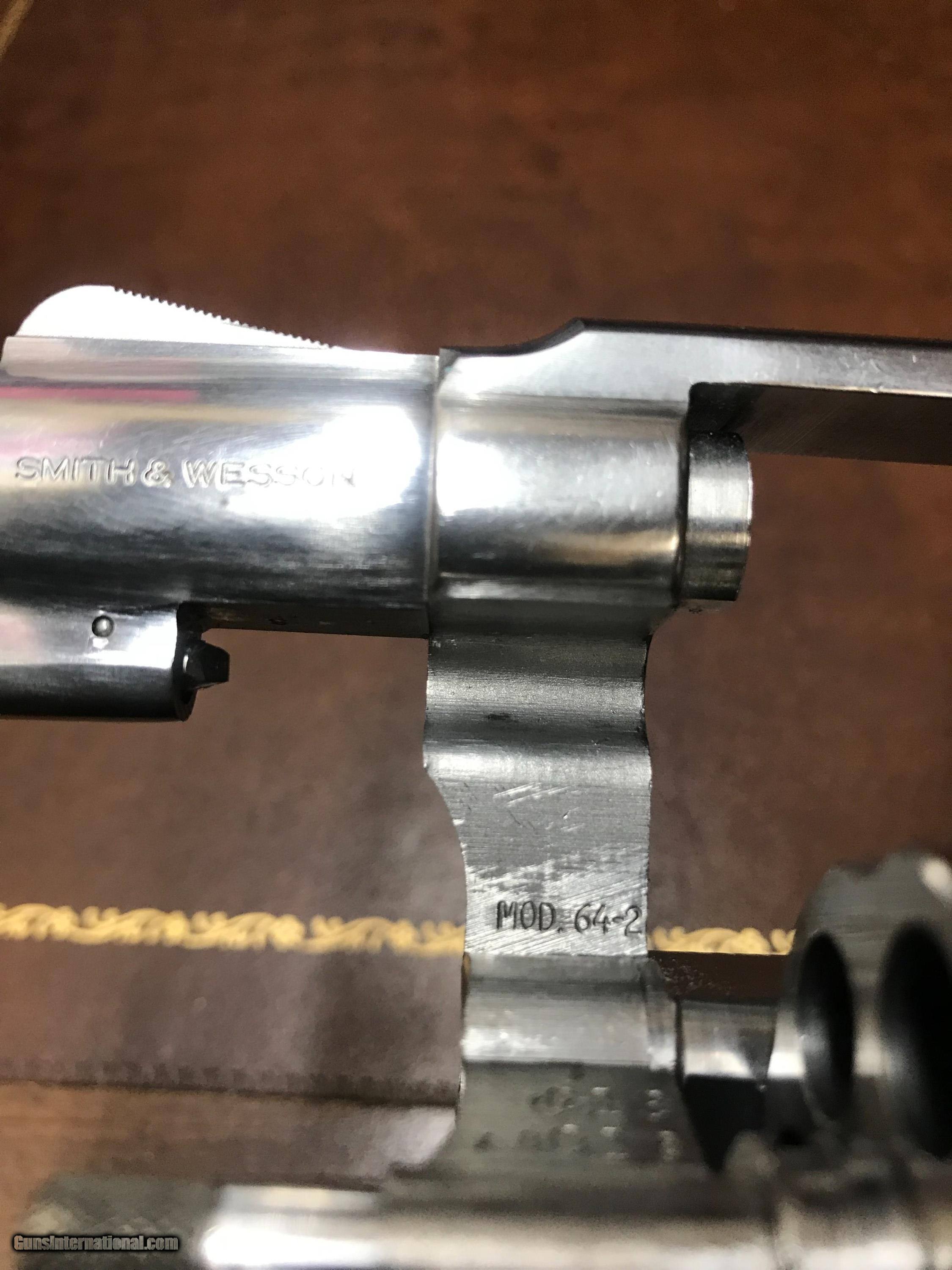 Description: It is very hard to find a 64 in 2 inch barrel without a department stamping. Here it is! This 64 features stainless finish, round butt wood service grips, and fixed sights. Very nice condition. NO BOX. Please email with questions. Shipping included. Cards add 3% SOLD Manufacturer: Smith and Wesson Model: 64-2 Barrel Length: 2 in Condition: Used Metal Condition: Excellent Wood Condition: Excellent Bore Condition: Excellent Action: Double Finish: Stainless Sights: Fixed Item Location: 37075 |