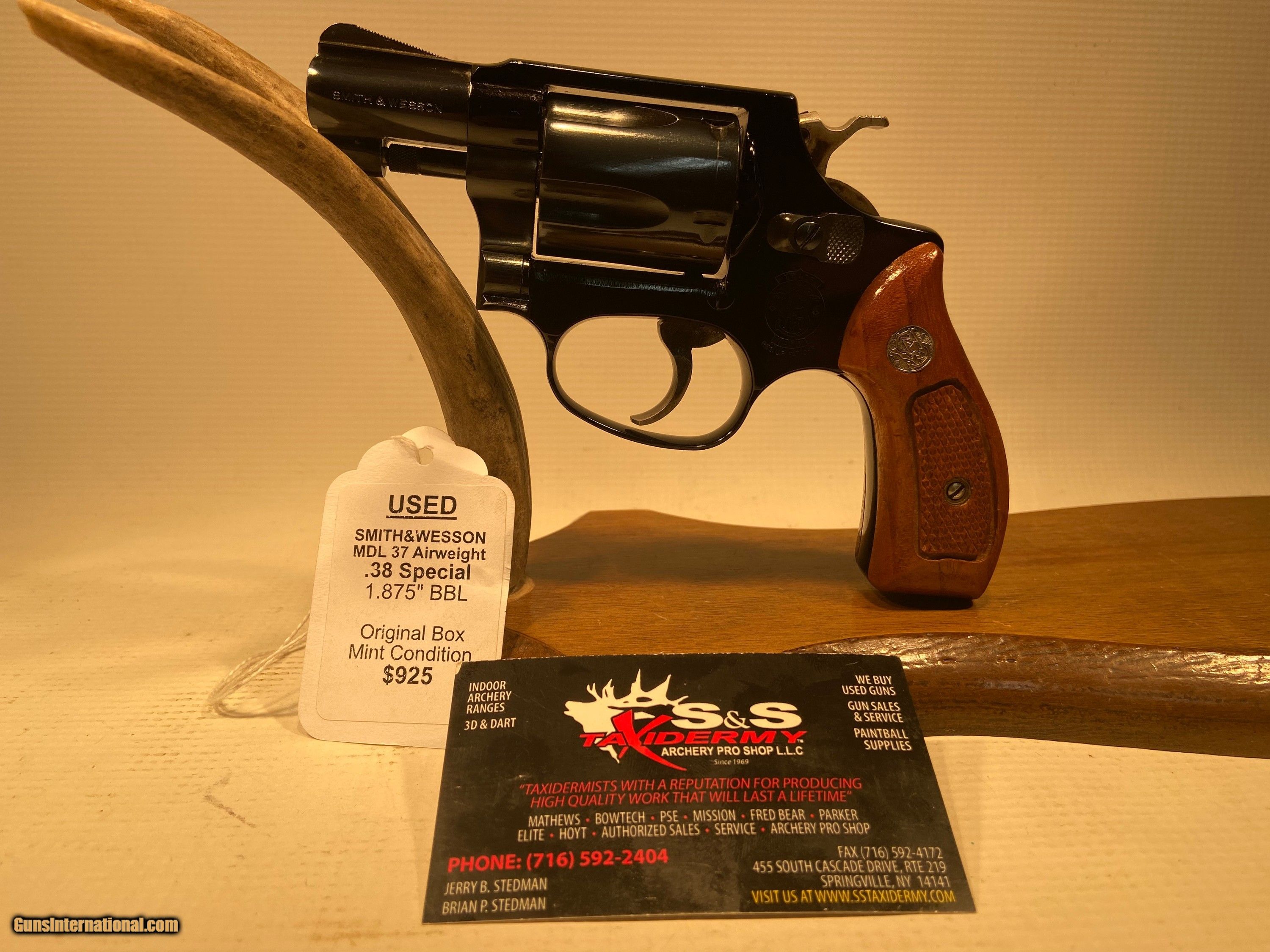 Description: Here is a great item for you! We have a Smith and Wesson Model 37 Chiefs Special Airweight in .38 Special. This J-frame handgun has a 5 shot cylinder, alloy frame and a 1 7/8" barrel length. This handgun comes with the original box and all the original paperwork as well! This Smith is in MINT condition withonly a slight nick on the frame and some scratches on the handle. The bore is in excellent condition as well! All sales are final! Please call with questions before purchasing. (716) 592-2404 SOLD Handgun Caliber: .38 Special, .38 Manufacturer: Smith and Wesson Model: 37 Chiefs Special Airweight Serial Number: AND3955 Barrel Length: 1.875 Condition: 95 Wood Condition: 95 Bore Condition: 95 Action: Single/Double |
