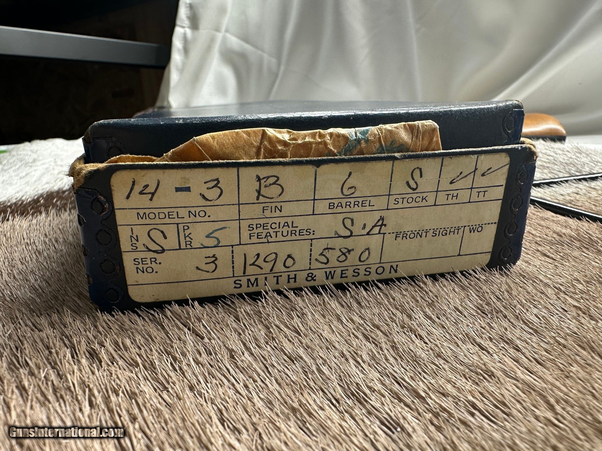 Description: Guns Listing ID: 598446 Awesome model 14 K- masterpiece 38 SINGLE ACTION ONLY with the box and everything . We don’t see these very often. Made in 1973 Manufacturer: SMITH & WESSON Model: 14-3 Caliber Info: .38 SPL Condition: Used - Non-Certified Barrels: 6" BARREL Action: REVOLVER Finish: blued Price: $899.99 Contact Seller |