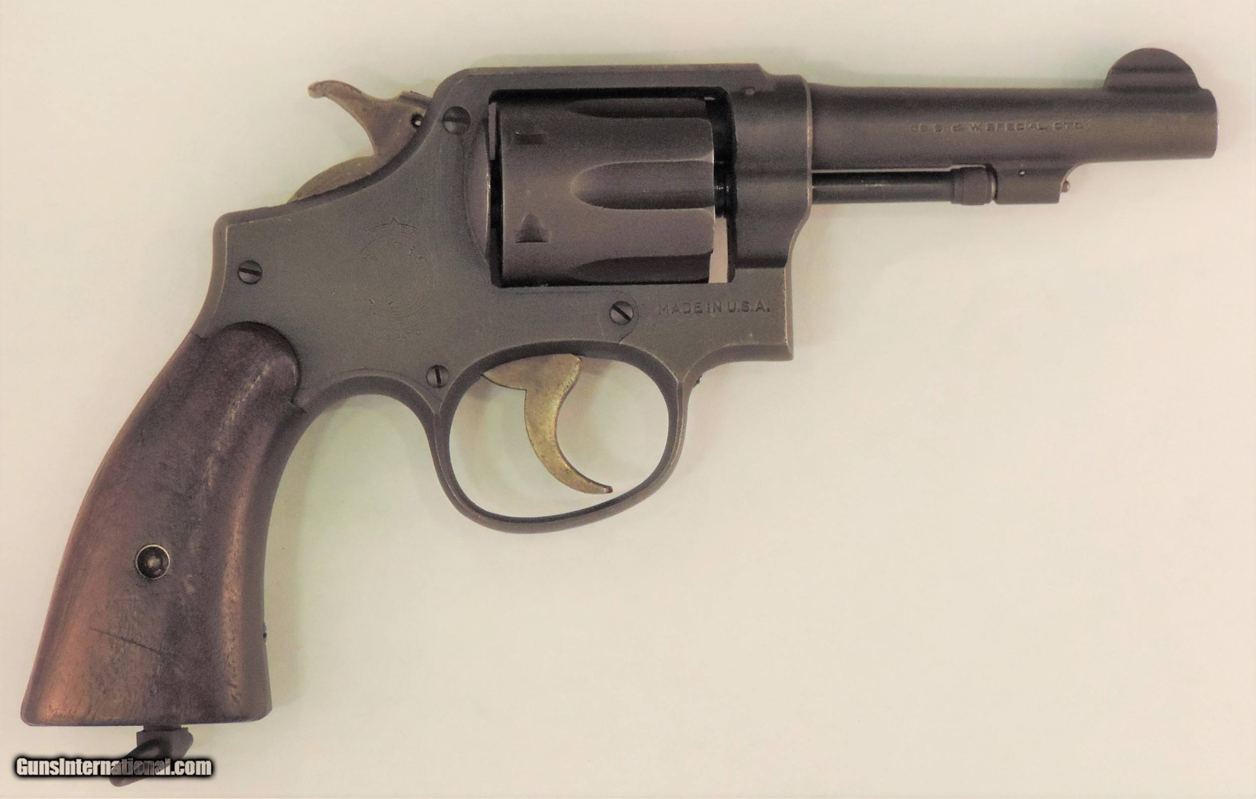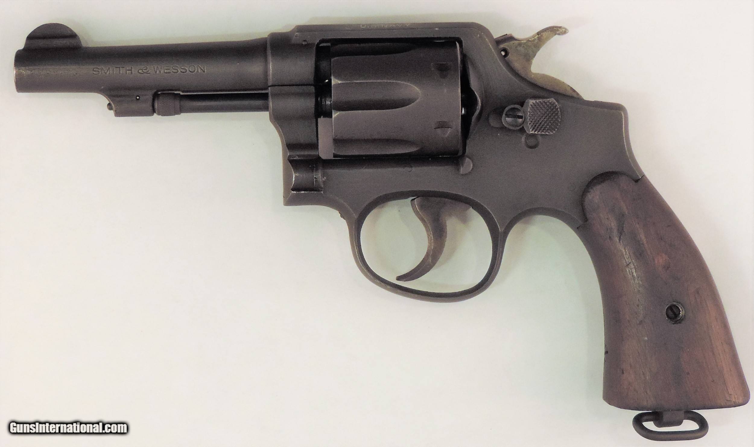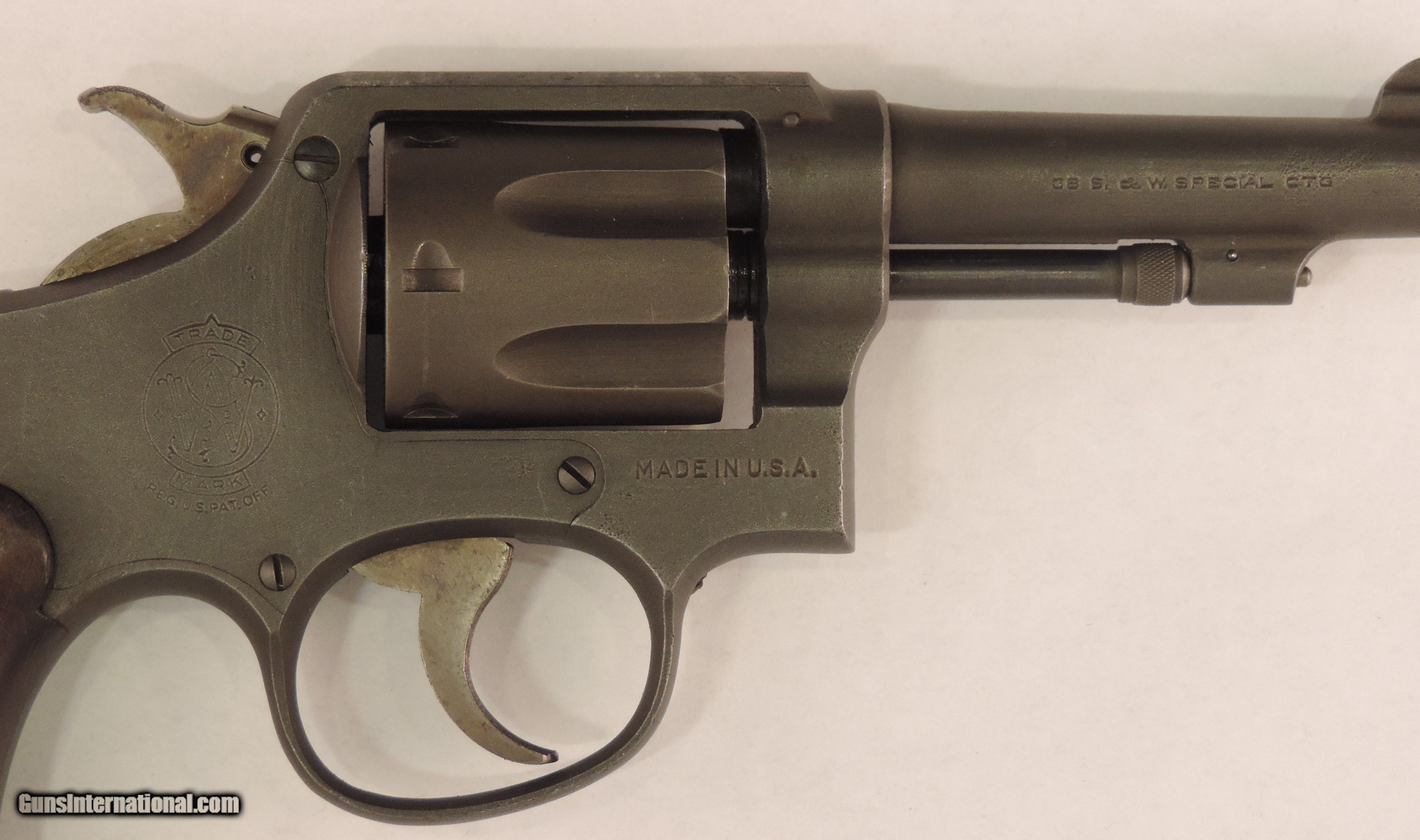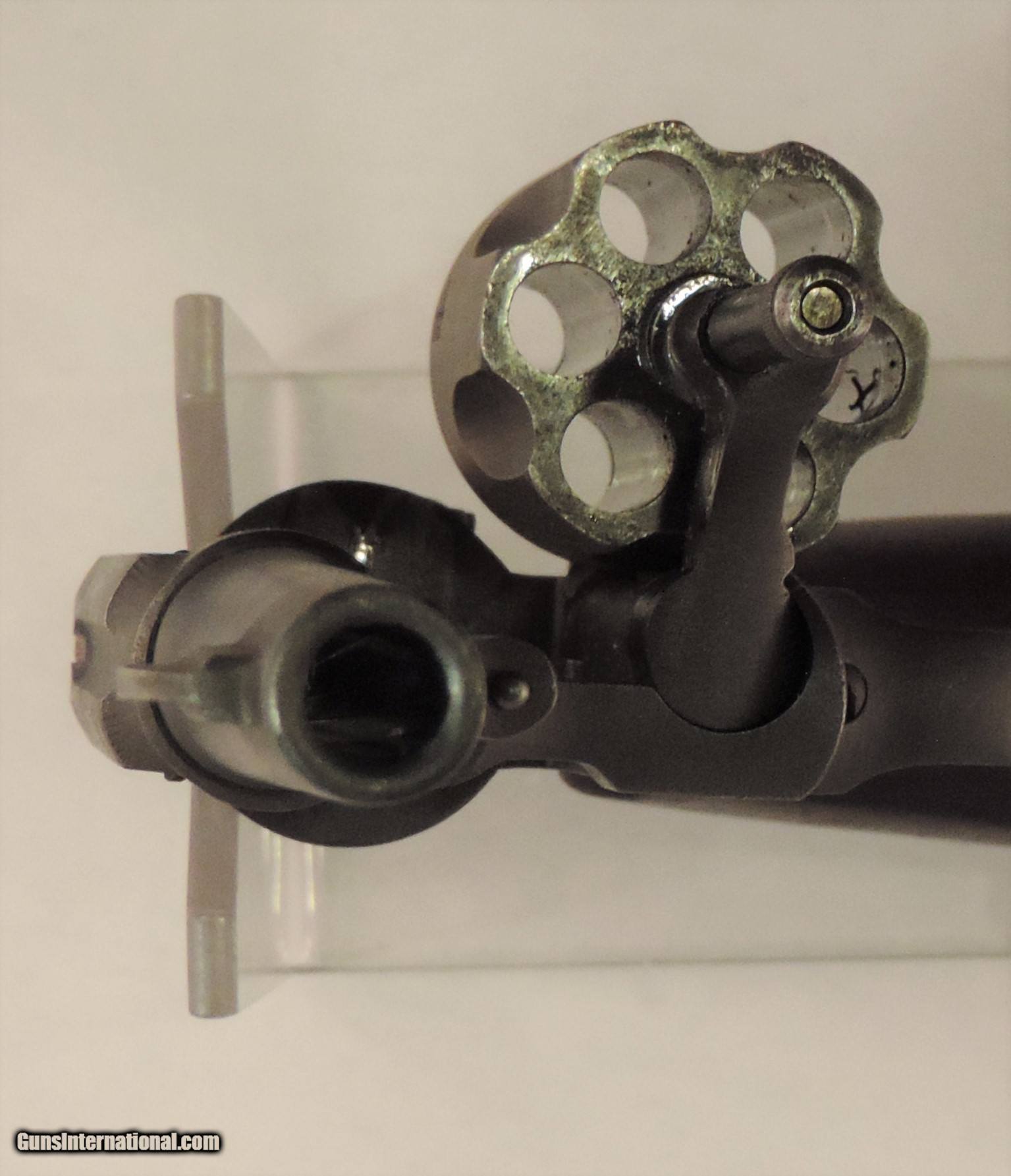 Description: Inv. 6859 Smith & Wesson Vcitory U.S.Navy Cal. .38 Spec., Ser. V191884. A really great find for the military collector. A beautiful condition Victory model with original U.S. Navy markings on the top strap. The original Parkerizing is conservatively 98%. The only little loss there is from sharp edge silvering and some flaking on the topstrap from holster wear. That's about it. Typically these were issued to pilots and this one does not look like it was ever fired. The case colored trigger and hammer are also at least 98%. The cylinder drag ring is almost non-existant, All parts are correct and original to the gun. The wood grips have about 85+% of the original factory finish with no chips or spits. The chambers, force cone and recoil plate have show no indication of wear. The barrel like the rest of the gun is pristine. The bore is mirror bright, razor sharp without the slightest touch of frost. A no regrets purchase for your collection.......$899. Shipped. SOLD |