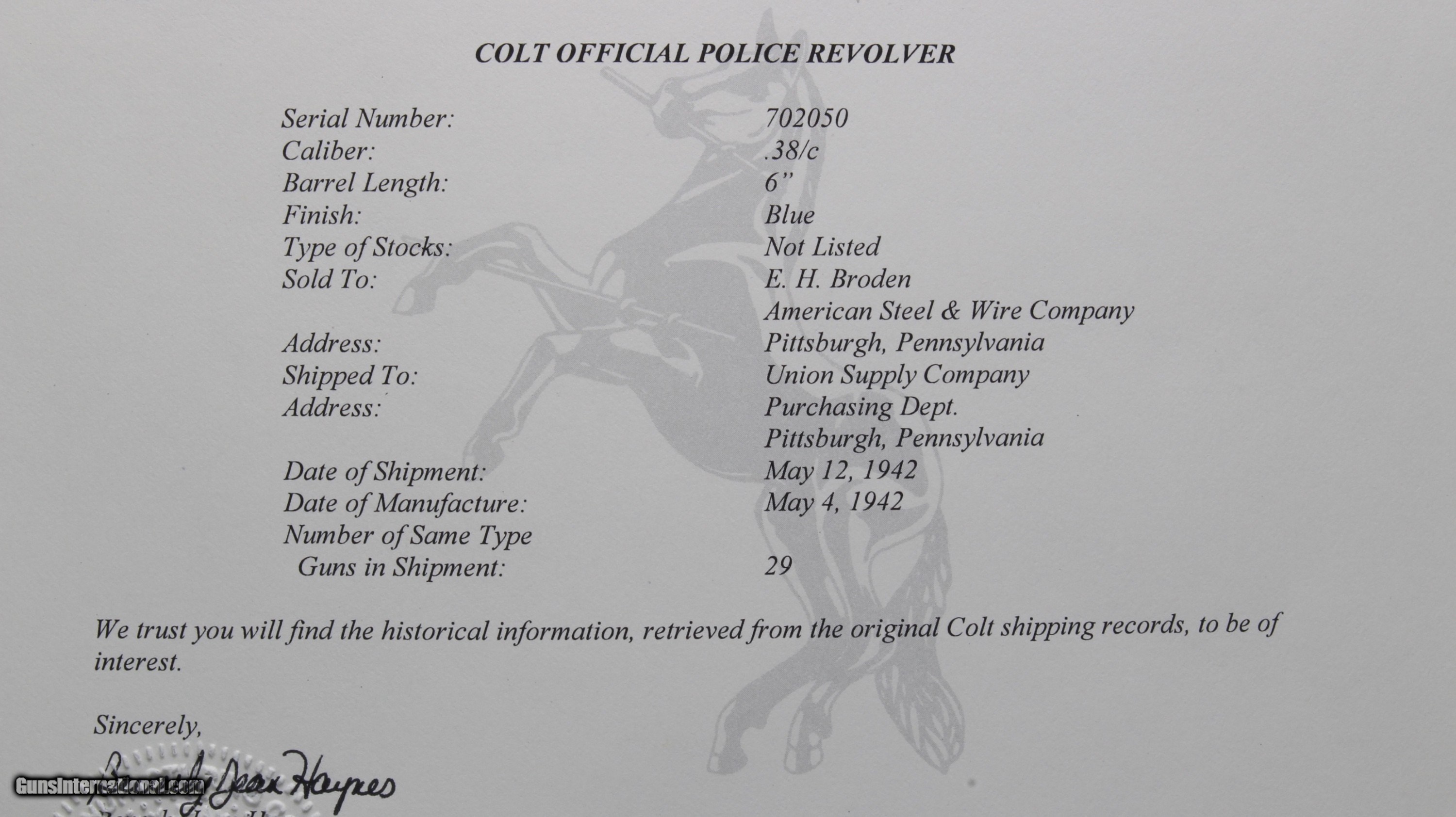 Description: WWII era shipped Colt Official Police with 6" heavy barrel, original box, and Archive Letter. This revolver remains in very high condition. The original finish still retains all of its deep dark shine throughout. All of the leading edges are sharp and the grip straps are exceptional. Overall the finish rates are very conservative 98%. The cylinder face, recoil shield, and forcing cone are very clean. The action is crisp, the lock up is tight, and the bore is mirror bright with strong lands and grooves. The factory grips are exceptional with sharp checkers throughout. The original serial number matching box is included but please note there is some damage and tape repair. A Colt Archive Letter is also included showing a manufacturing and shipping date of May 1942 to the American Steel & Wire Company, who played a a vital role in the "Arsenal of Democracy", producing steel and wire, for ships, tanks, and other military hardware during the war years. Price includes shipping CONUS. Curio/Relic: Yes Handgun Caliber: .38 Special Manufacturer: Colt Model: Official Police Barrel Length: 6 Condition: Excellent Metal Condition: Excellent Wood Condition: Excellent Bore Condition: Excellent Barrel Type: Heavy Barrel Manufacture Date: 1942 Item Location: Arizona Grips: Walnut Price: $1,395.00 Contact Seller |
