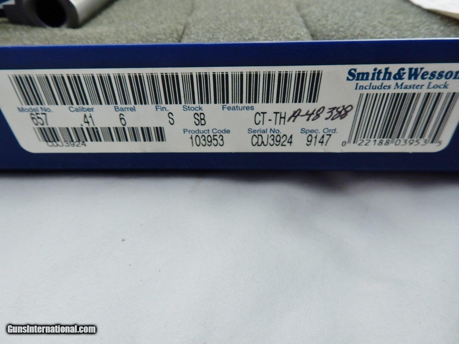 Description: This is a Smith Wesson 657-4 41 magnum with a 6 inch barrel. This gun is 100% new in the box. Serial # is CDJ39xx. Buyer pays 35.00 shipping. Thank you. 43-10-14 SOLD |