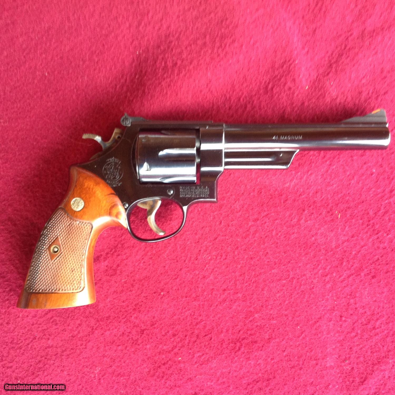 SMITH & WESSON M-57 NO DASH, 41 MAG. CAL. 6" BLUE, COMES IN ORIGINAL PRESENTATION WOOD BOX WITH CLEANING TOOLS, 99% COND. [SOLD PENDING FUNDS]