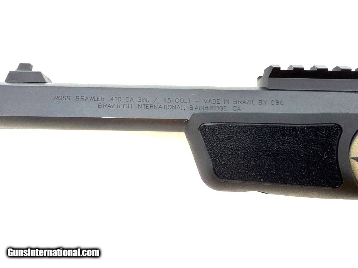 Description: Guns Listing ID: 573019 EL1118859 The CBC Brawler .410 is a single-shot, break-action pistol manufactured by Companhia Brasileira de Cartuchos (CBC) in Brazil for Rossi. It is a versatile and affordable firearm chambered to fire both .410 bore shotshells (2.5\" and 3\") and .45 Colt revolver cartridges. Manufacturer: ROSSI Model: BRAWLER Caliber Info: .45 colt / .410 Condition: Used - Non-Certified Barrels: 9" BARREL Action: SINGLE SHOT Finish: black Price: $384.99 Contact Seller |