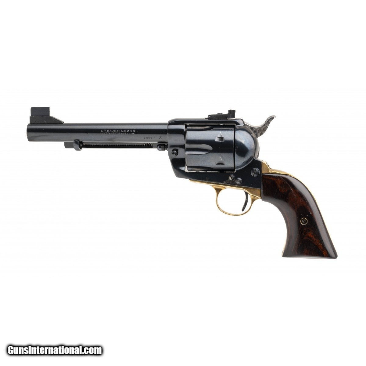 SN: 659014. Single-action revolver made by J.P. Sauer & Sohn c. 1980. 6"" .44 caliber barrel with .44 Magnum cylinder. Great condition overall with some finish wear on the frame above the lock plate and along the ejector rod tube. Bore is excellent. Features jeweled hammer, adjustable rear sight and brass backstrap and lockplate.