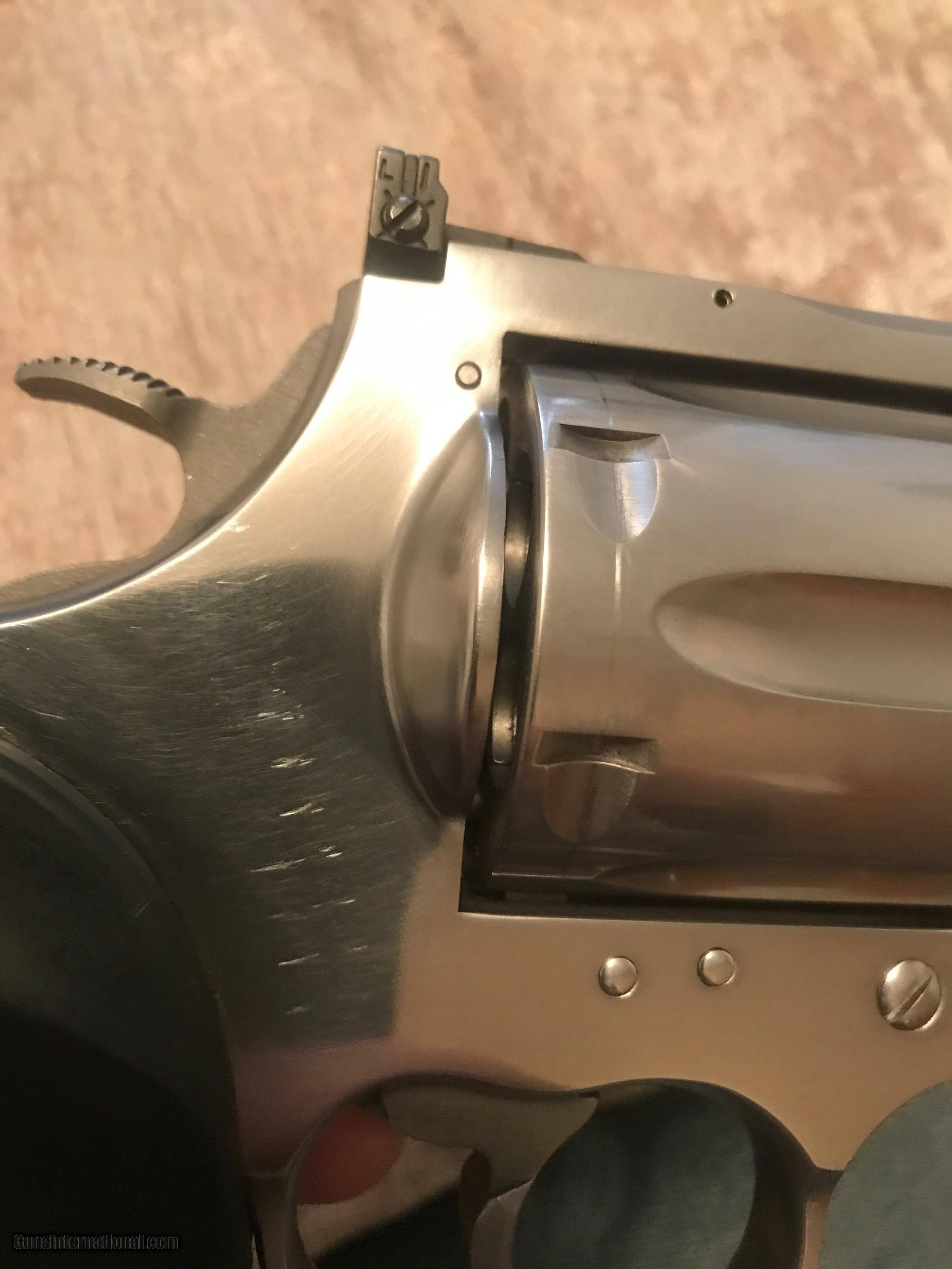 Description: This is the second Anaconda we've had. This is a nice one! Stainless finish, 44 magnum, 6 inch barrel, white outline rear, red ramp front sights, original Colt grips, box, and papers. The gun has some fine scratches that were hard to photograph. See the photo. Other than that, really nice! Made in 1995. SOLD Manufacturer: Colt Model: Anaconda Barrel Length: 6 Caliber Info: .44 magnum Condition: very good Metal Condition: very good Wood Condition: n/a Bore Condition: excellent Action: double Rib: ventilated Finish: stainless Sights: target Manufacture Date: 1995 Item Location: 37075 |