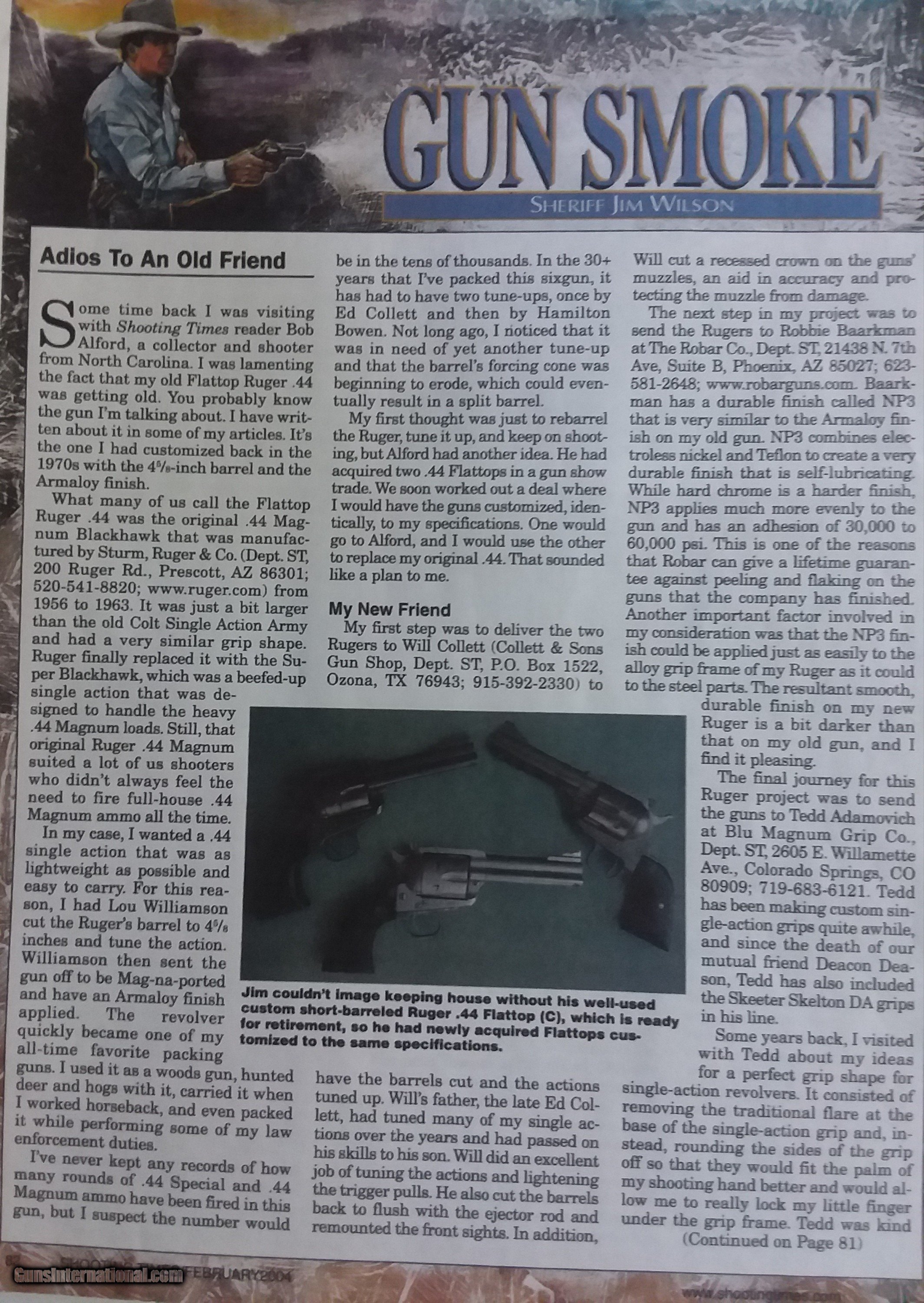 Description: Custom 3 screw original Ruger Flat Top 44 magnum Blackhawk. Judging by the serial number the gun was made1959-1960. This gun was written up in Shooting Times magazine, February 2004 in an article by Sheriff Jim Wilson. Article is included in photos and will be sent with the gun. Highly customized with a 4.62 barrel and NP3 finish. Trigger job, forcing cone cut to 11 degrees, throats at .431, minimal cylinder gap, and African Blackwood grips.To much to list, please read the article. Not mentioned in the article, is a locking Belt Mouton base pin, Bowen Rough Country rear sight, and a recessed crown. Included is an extra set of Maga tusk ivory grips. Buyer pays shipping. SALE PENDING SOLD Curio/Relic: Yes Handgun Caliber: .44 Remington Magnum Manufacturer: Ruger Model: Flat Top Blackhawk Serial Number: 15470 Barrel Length: 4.62 Condition: Excellent Metal Condition: Excellent Wood Condition: Excellent Bore Condition: Excellent Action: Single Action Finish: NP3 Manufacture Date: 1959-1960 |