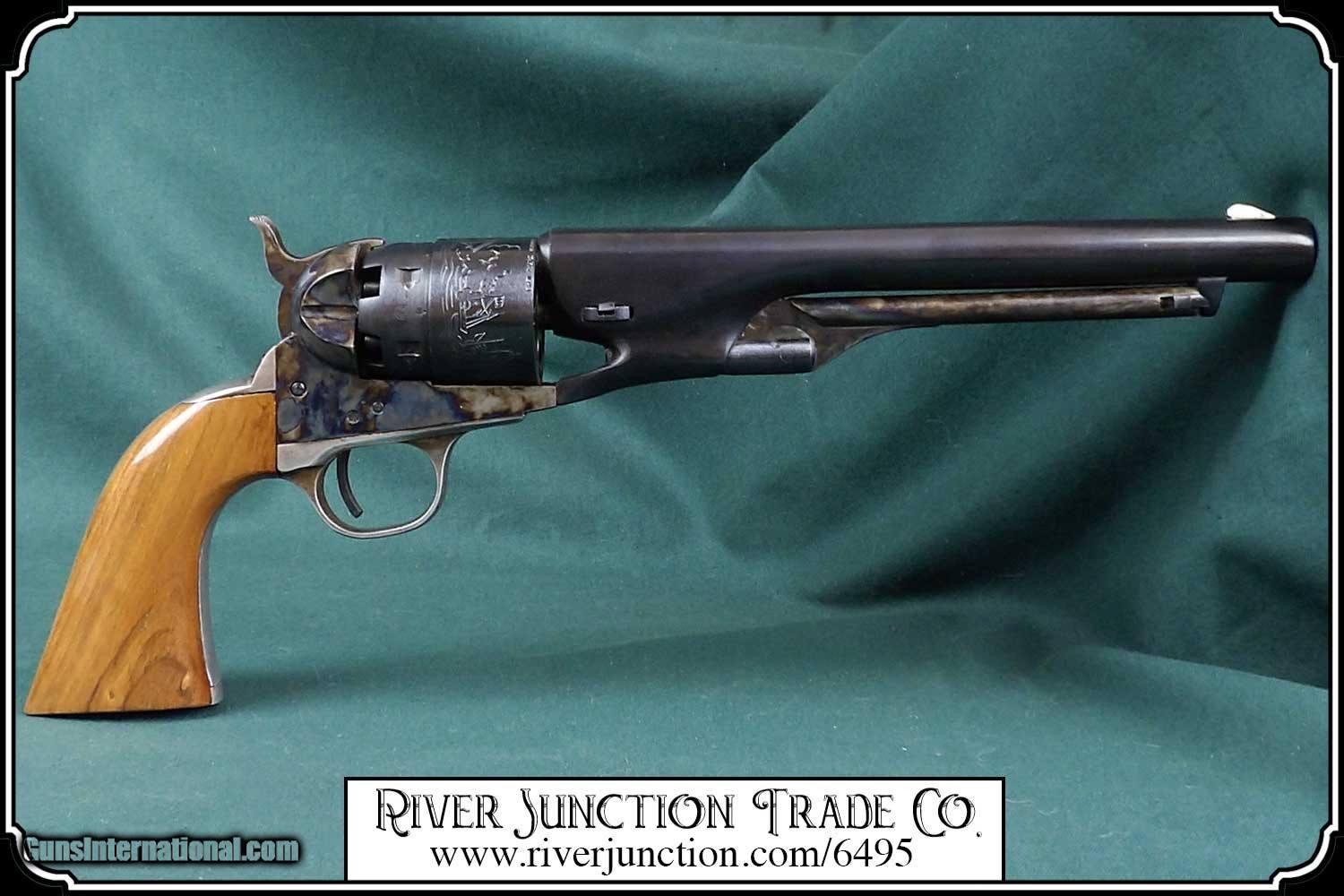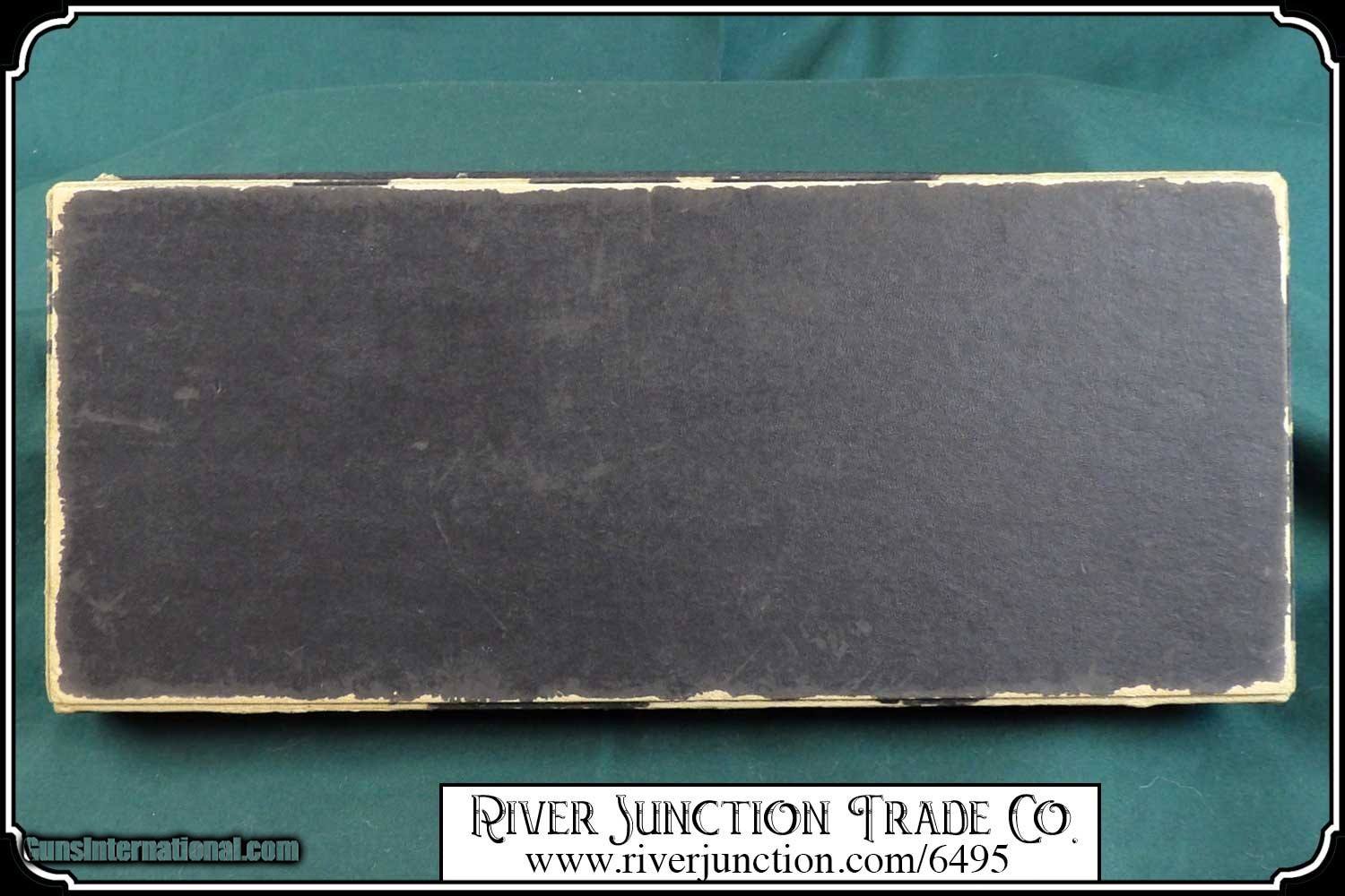 Description: Very RARE highly collectable Belgium made CIVILIAN model COLT serial number (C1) (C1) means it was the first civilian model produce in 1960. Collectors consider this a direct-line descendant from the original Civil War era .44 caliber, 1860 Colt. They feel these are more authentic in that this was the 1st production of the 1860 Colt Army since the originals used in the Civil War. In 1853 Samuel Colt traveled overseas and licensed Belgian gun manufacturers to produce his revolvers. Then one hundred years later, these companies regrouped and began producing this six shooter with modern steel. Others have copied and followed since then including the so called 2nd and 3rd generation percussion 1860 Army. The new pistols were marketed as 1960 New Model Army and were stamped Made in Belgium. At that time the upcoming centennial of the American Civil War, and no safe usable arm was available for reenactors, that all pointed to an obvious need. There to answer that need were two important ingredients, original Colt equipment waiting silently in Belgium for nearly a century and a young man by the name of William B. Edwards. Edwards was one of the principals of Centennial Arms Corp. of Chicago. Edwards realized there was a ready market for a second issue of the Colt Army. Edwards entrusted Fabriques de Armes Unies de Li_ge in Belgium with the production of the 1860 dubbed, the1960 NEW MODEL ARMY. This 1960 NMA is mechanically perfect, the finish is MINT. The bore is mint UNFIRED. The action positive and locks up tight. This gun is serial number (C1). The (C) stands for CIVILIAN MODEL. The back strap and trigger guard are SILVER PLATED and show only very light tarnish, I will leave that for you to polish if you like. The the frame, hammer, and loading leaver are color case hardened. I believe this gun has never been fired. It shows marks such as, made in Belgium on the butt, and on the top of the barrel “1960 NEW MODEL ARMY”. Payment: Item, can be ordered on line with a credit card or paypal on our sight. Just Google (riverjunction) and type in the River Junction Trade Co. item number (6495) in the search box. Before you checkout you will see shipping cost and total. OR If you prefer: Pay by cash, postal money order, cashiers check, personal & business checks. We wait for checks to clear. We always answer questions and entertain offers. Have questions? Call me 563-880-4588. Jim SOLD |