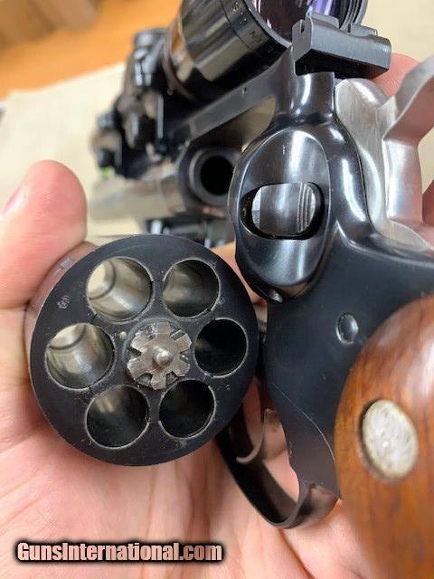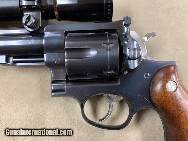 Description: Yes it shows a little bit of blue wear from holster use but this is still one nice .44 Mag revolver, and equipped with a Leupold M8 2x Long Eye Relief Pistol Scope. I don't think they make the blued versions of this revolver any more, or if they do you sure don't see 'em. Sorry, I'm just a sucker for a blued firearm and this stainless stuff just does not cut it with me. This a great outfit for deer hunting with a handgun. Barrel is 7.5 inches in length and bore is excellent as are the chambers. SOLD Handgun Caliber: .44 Remington Magnum |