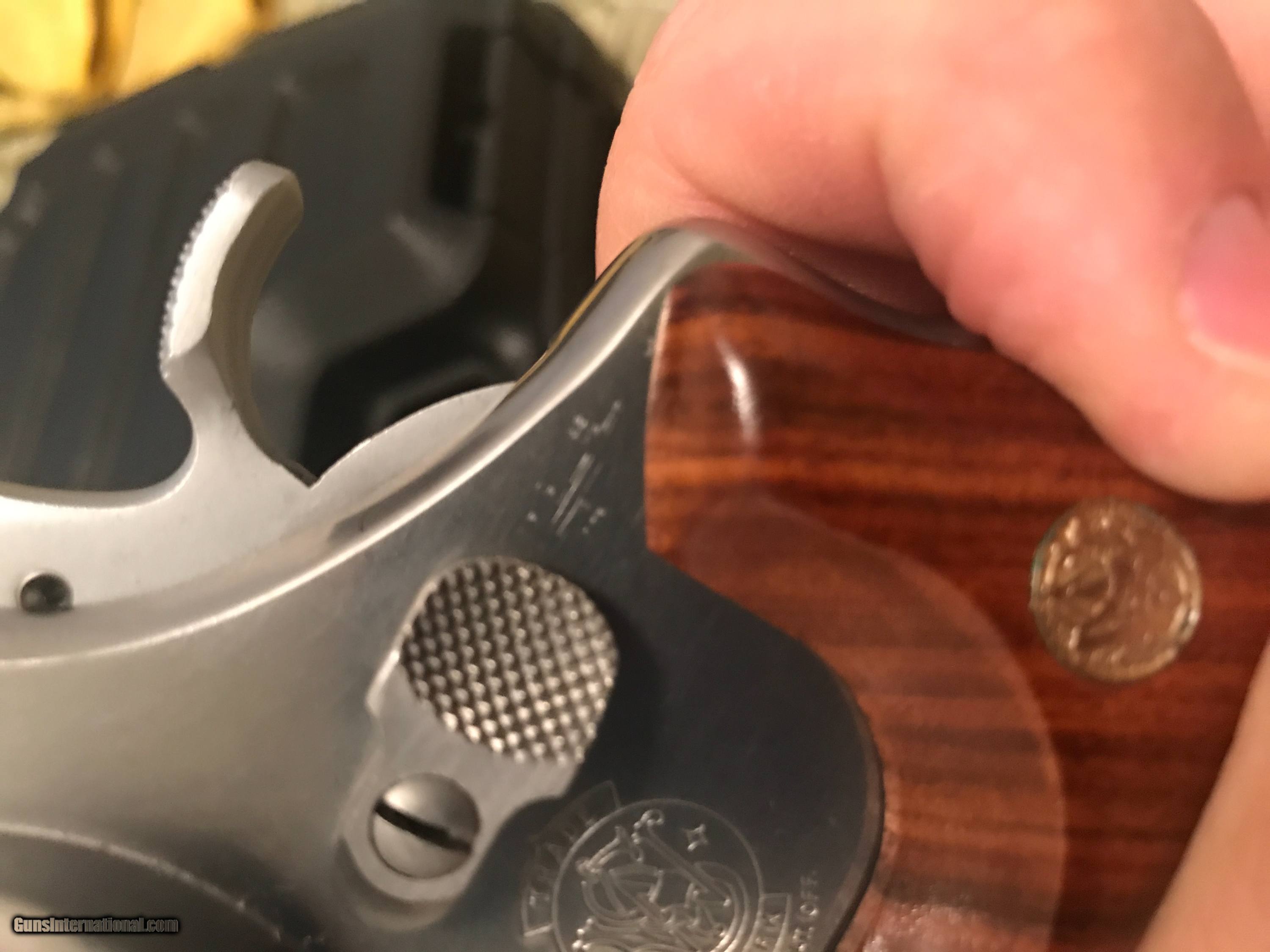 Description: What a rare find! Full lug, full target, combat gripped 629-1! Stainless finish. Wide target hammer and trigger. Full lug 3 inch barrel. Red ramp front sight and white outline rear sight. Unfluted cylinder. No box. Is it a Lew Horton? I don't know. I do know it's nice! The only other one I've seen is listed at $2500 with no box. You can own this one for much less. Has a slight scratch behind the cylinder release. Please email with questions. Price includes shipping. SOLD Manufacturer: Smith and Wesson Model: 629-1 Caliber Info: .44 Magnum Condition: used Metal Condition: excellent Wood Condition: excellent Bore Condition: excellent Finish: stainless Sights: target Manufacture Date: 1988 Item Location: 37075 |