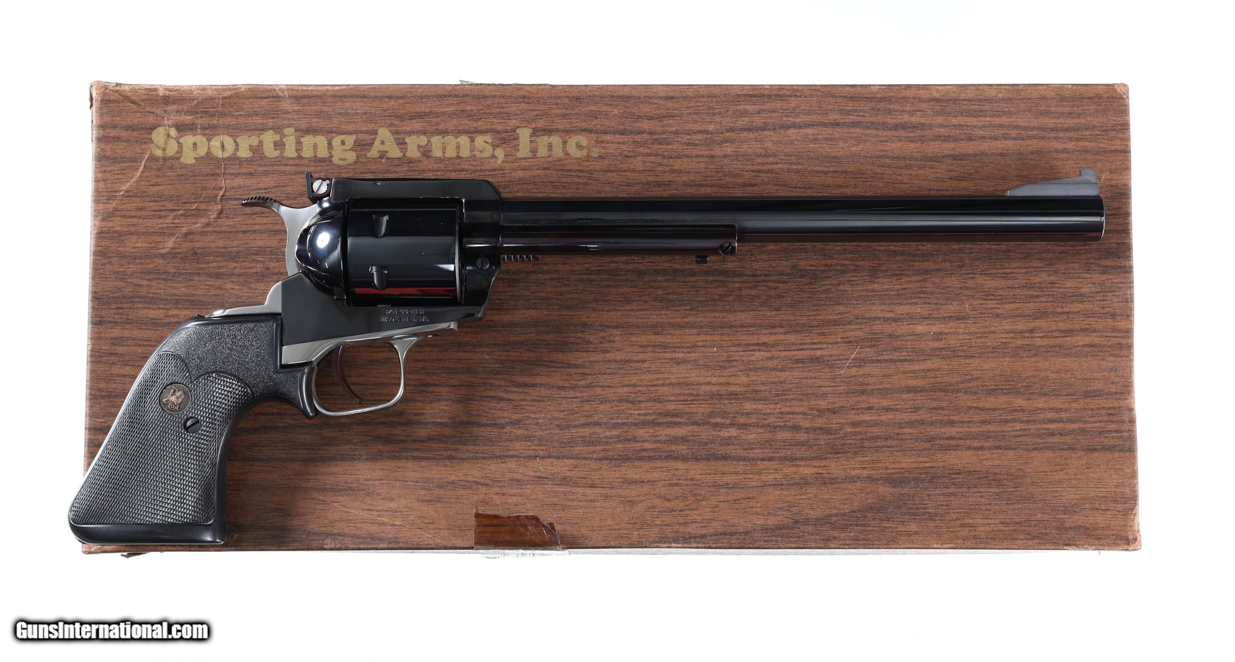 Description: Excellent overall condition with a factory woodgrain box. J. D. Jones is an American firearms and cartridge designer, firearms writer and retired former owner of SSK Industries. Jones founded SSK Industries (now SSK Firearms), a company focused on cartridges and barrels for high-power handgun hunting and target shooting – and suppressed sub sonic military cartridges known as Whispers. Jones also founded Handgun Hunters International. • Free Shipping, No Credit Card Fees. • Lay-a-way available for this firearm. • 1/3 Down, a 1/3 in 30 Days 1/3 in 60 Days. SOLD Manufacturer: Sporting Arms Model: Seville Serial Number: 44-2131 Barrel Length: 10 1/2 |