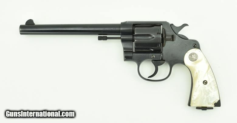 Colt New Service .44-40 caliber revolver. Manufactured approximately 1909. Barrel length 7 ½”. Bore is very good with deep sharp rifling. Action works perfectly. Gun has an old but good looking blue. We think this gun had some overall surface wear but no pits or abuse and was “dip” blued long ago. The blue has a “rust” blue look more associated with Colts of the 1930’s period. Gun has a fine pair of Colt Medallion Steer Head pearl grips. Left side has a chip at the toe. These grips look great and are factory pearl grips but not original to this gun and do not fit perfectly. Gun comes with a well-used Old West loop holster that came with the gun when we bought it. Very colorful rig.