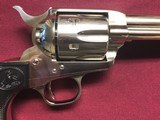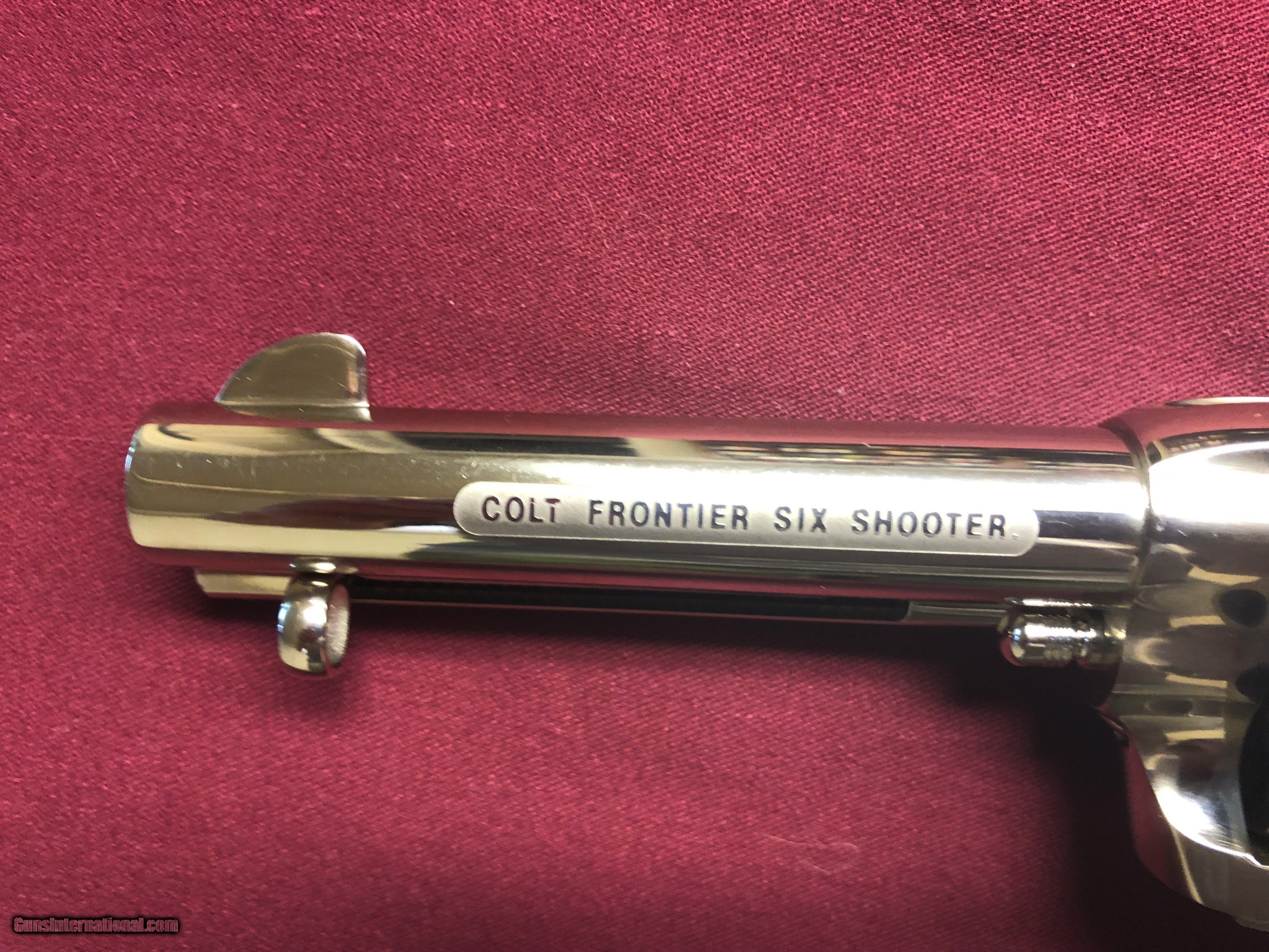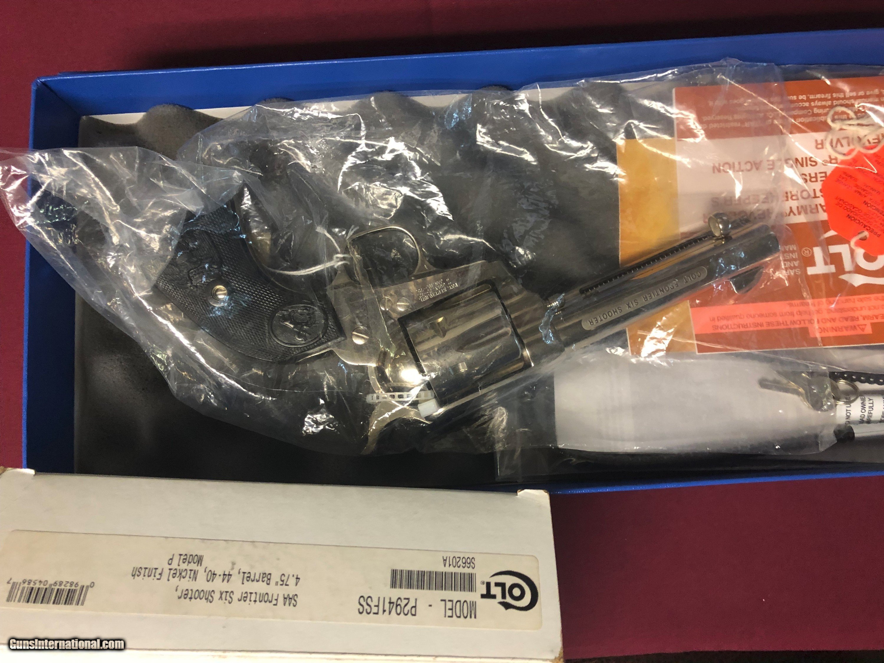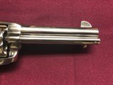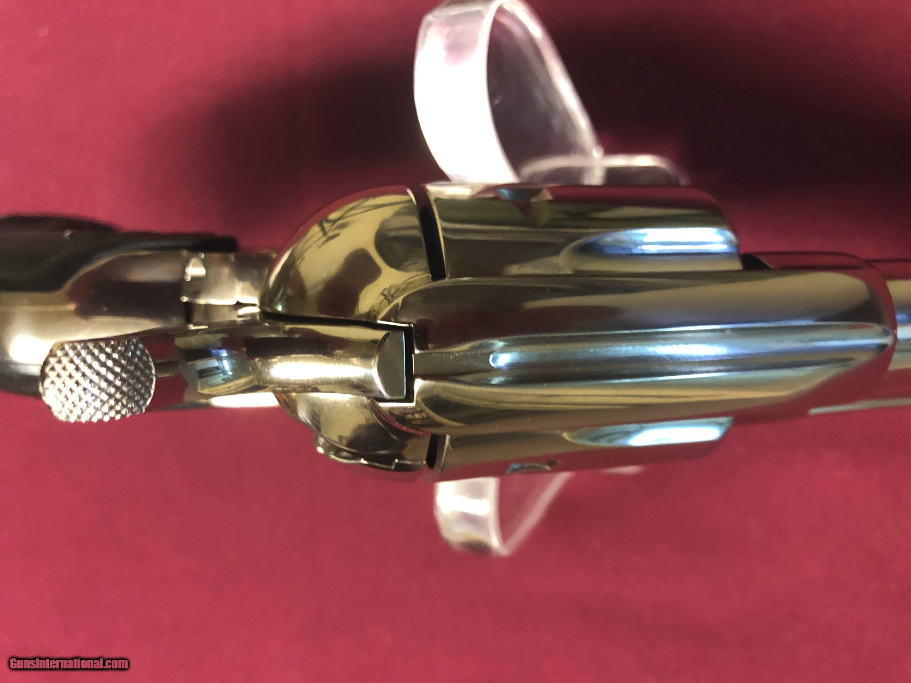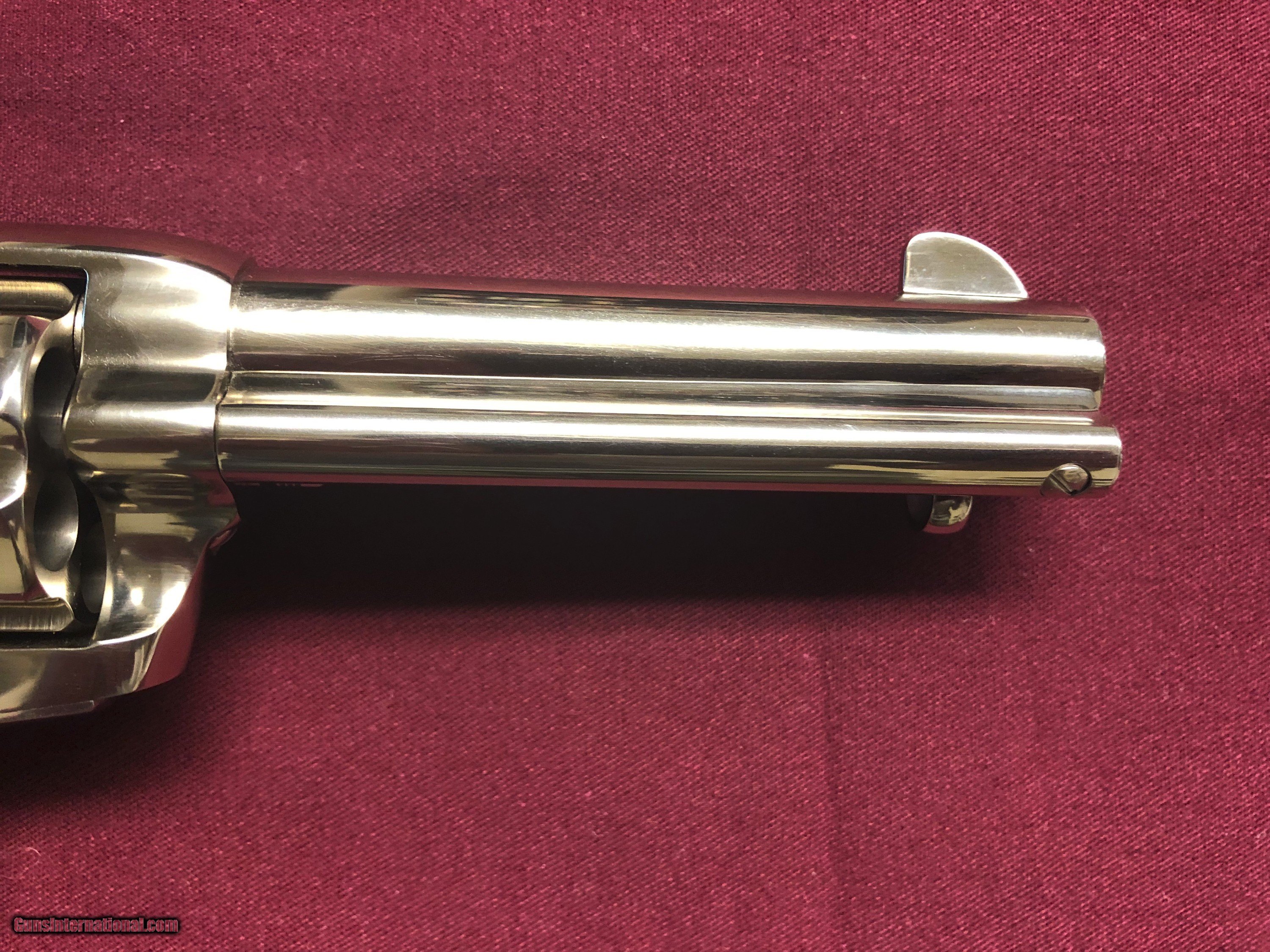 Description: These Etched Panel guns were made about 1993 and again in 2011, This one was made in 2011. Probably Colts most sought after SAA new and old (1st generation). Black Powder frame in full Nickel, with black eagle grips, bulls eye ejector rod and base pin retained by screw in front of frame. This example is NIB (New in box), not even a faint turn line, comes with all paper work and white sleeve.These are very hard to find and a must for serious collectors. Shipping $50.00 lower 48 no CA Cashiers Check. Call or e-mail with any questions and check out my odther listings. SOLD |