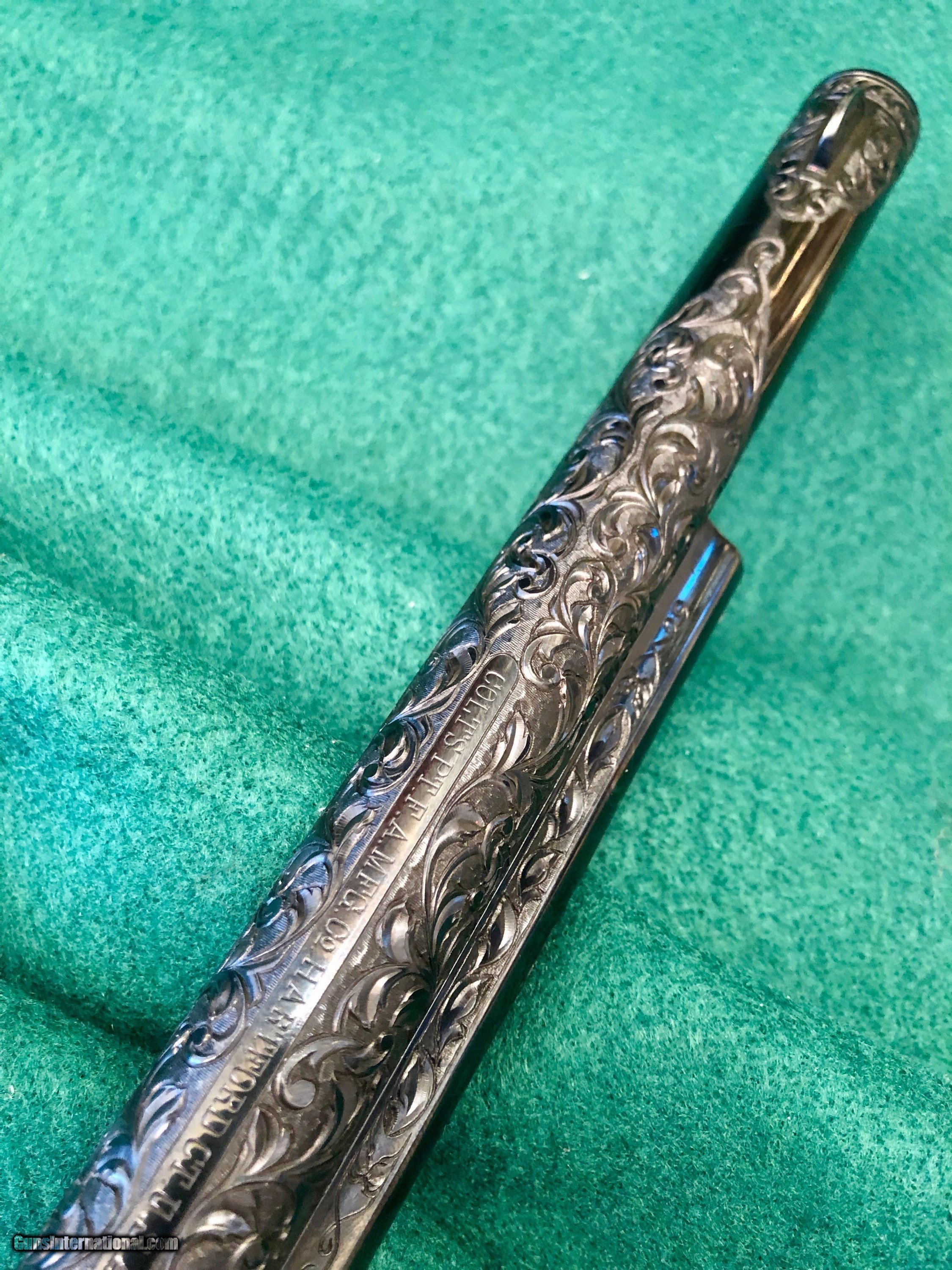 Description: Colt 1st Gen SAA Frontier Six Shooter, fabulously custom engraved pre- WW2. 7.5" barrel. Appears unfired. Extreme deep relief engraving, sadly anonymous! Inexplicable why someone didn't take credit for this fantastic piece of artwork. Beautifully blued with straw accents. SOLD Manufacturer: Colt Model: SAA Generation 1 Frontier Six-Shooter Engraving: Deep Relief Scroll Motif |