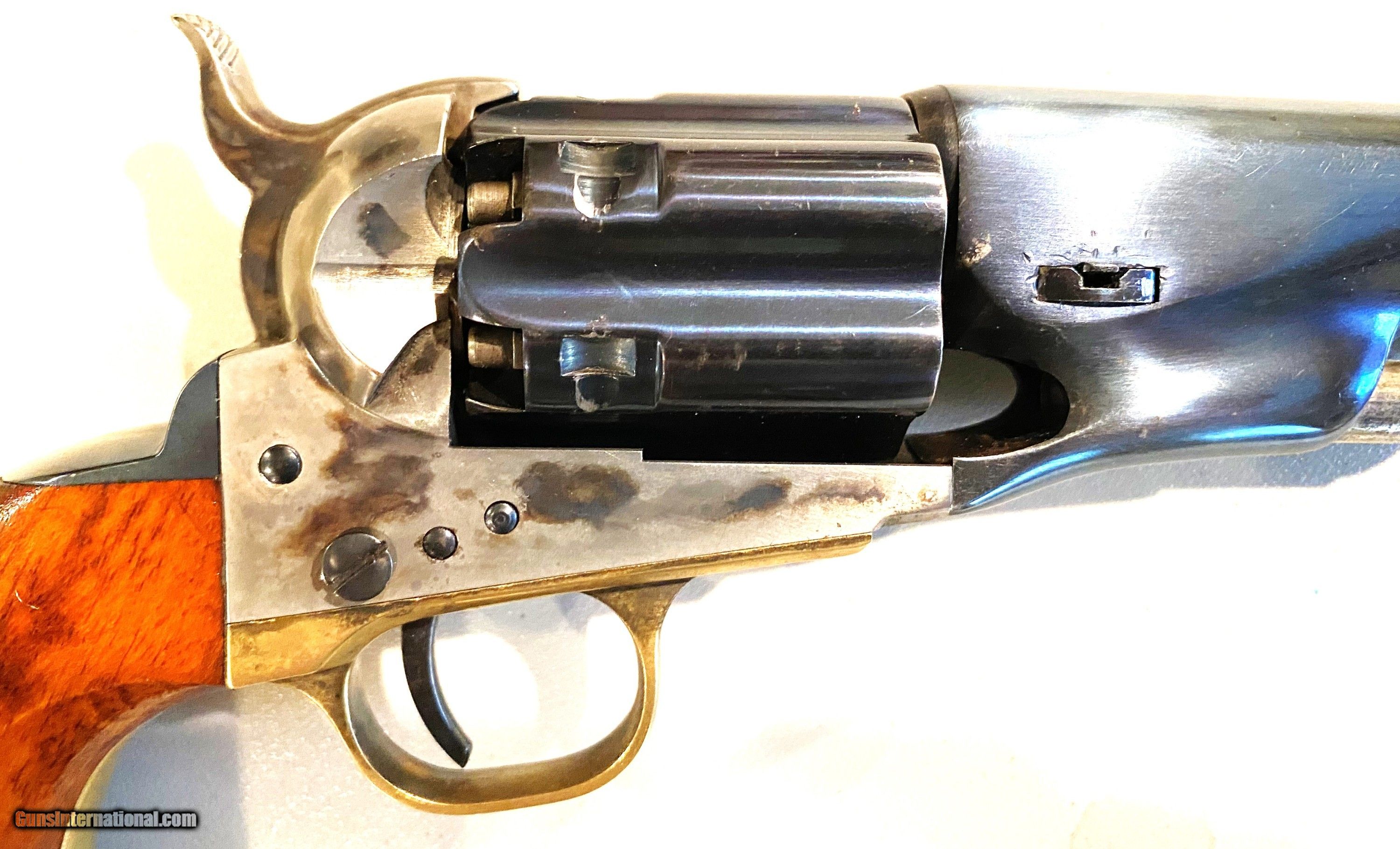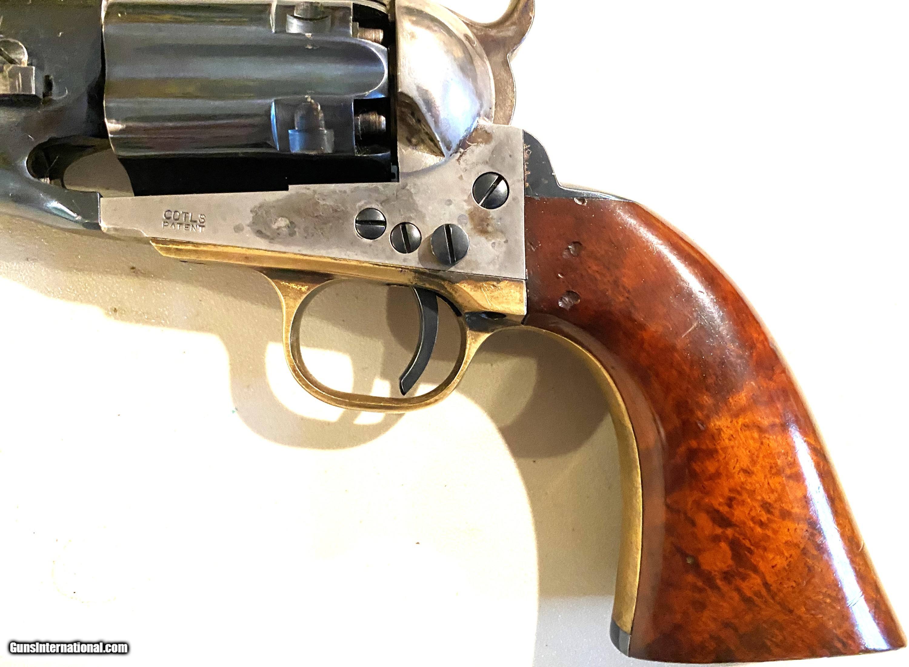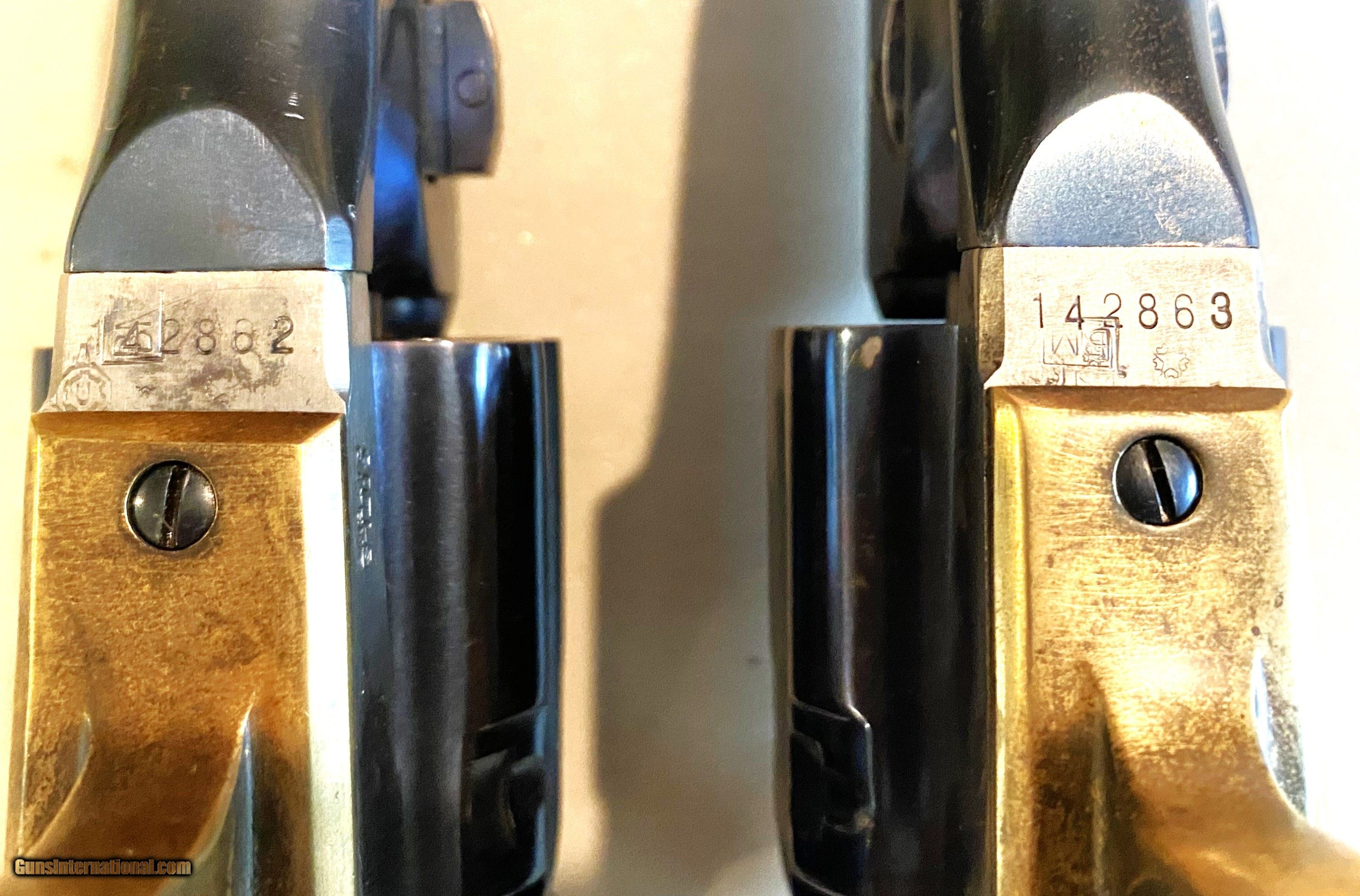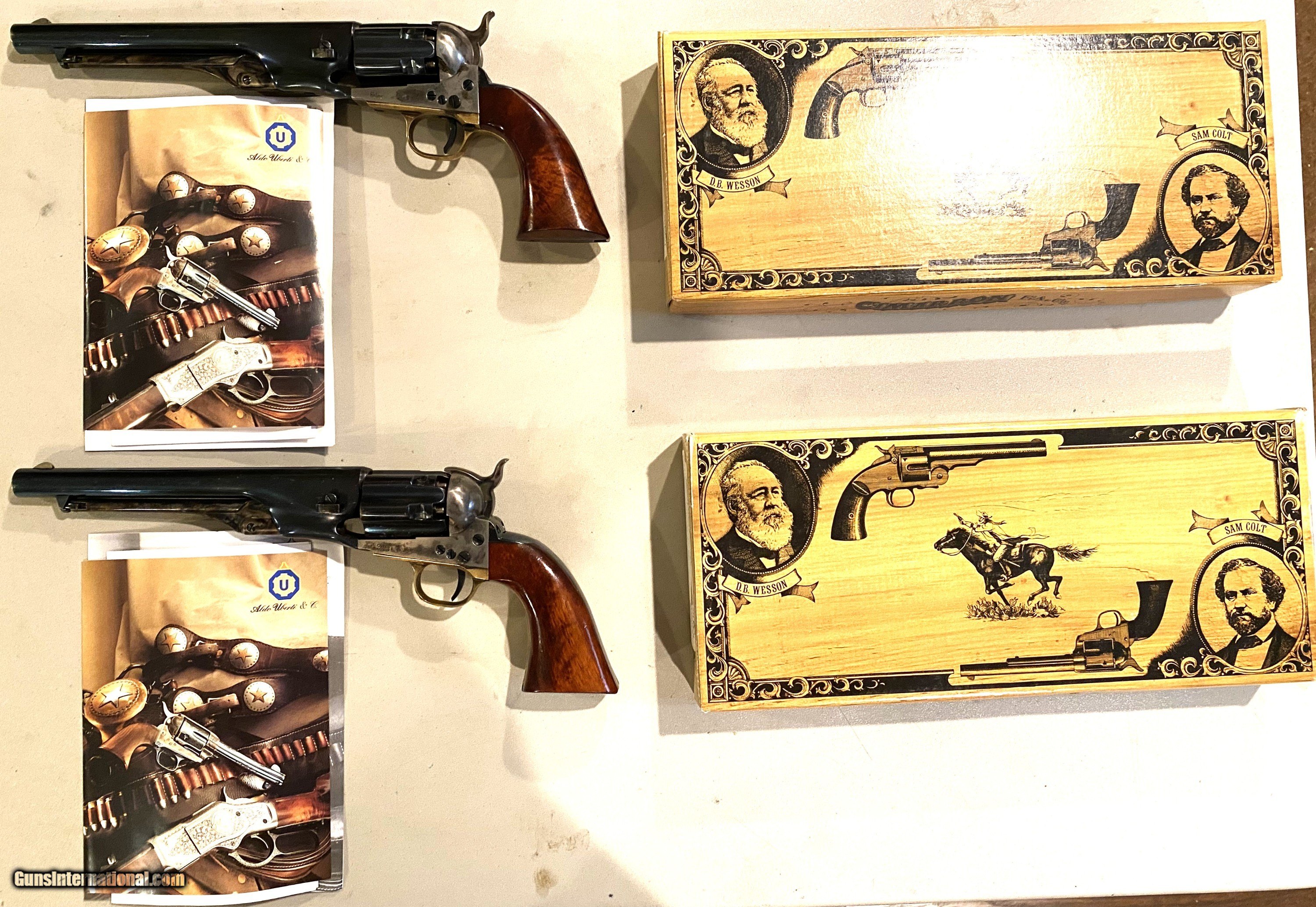 Description: These fine revolvers are from years of collecting by a private collector. This listing is for a pair (2) of consecutive serial numbered revolvers in Excellent condition. The 1860 Army revolver was adopted by the U.S. Ordnance and became very popular with mounted troops because of its easy handling, superior balance, and excellent ballistics. These authentic reproductions are 44 Caliber percussion revolvers with round barrels, brass trigger guards, 6-shot fluted cylinders, case colored frames, fixed sights, and one-piece walnut grips. Features