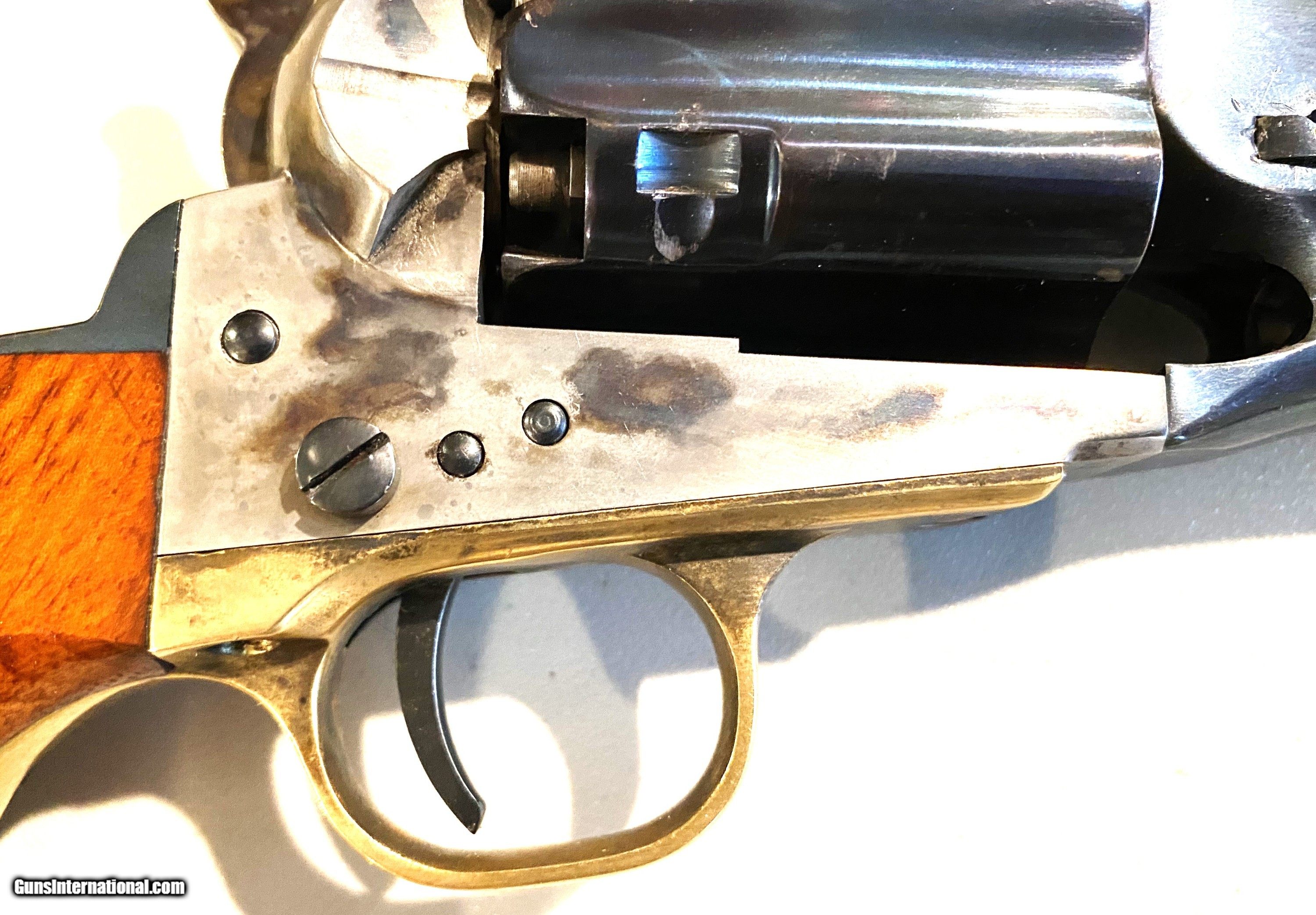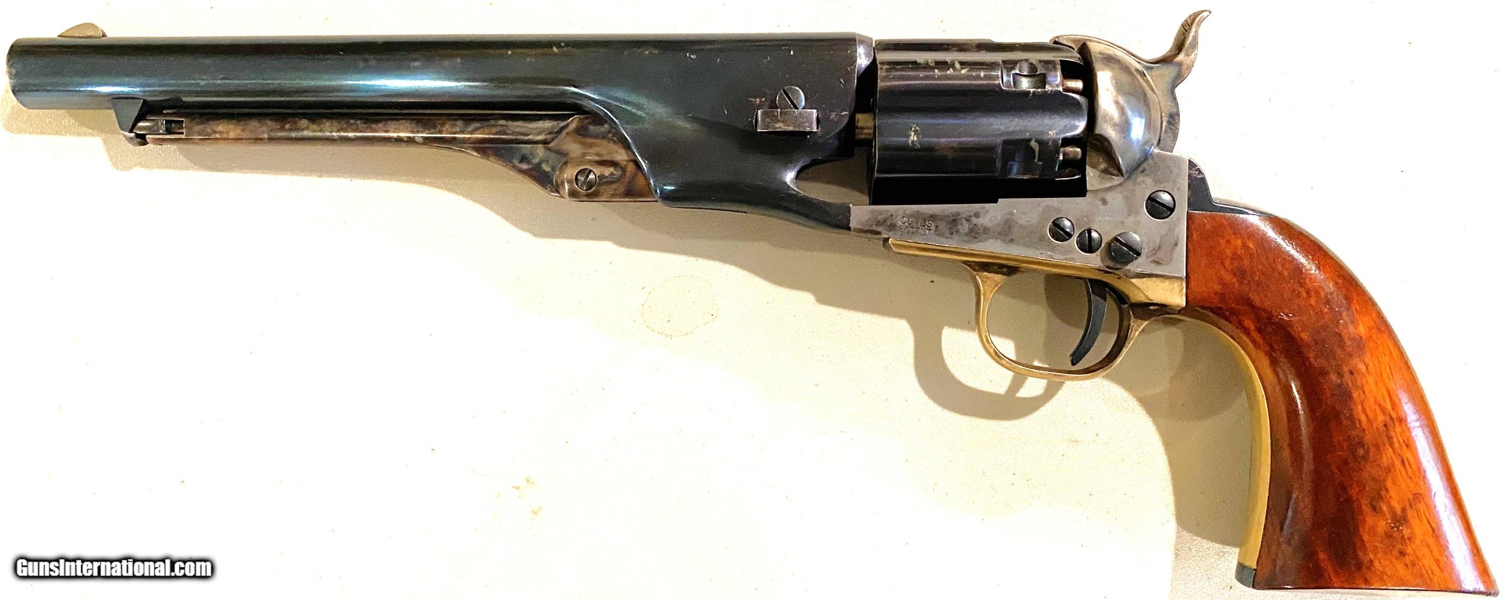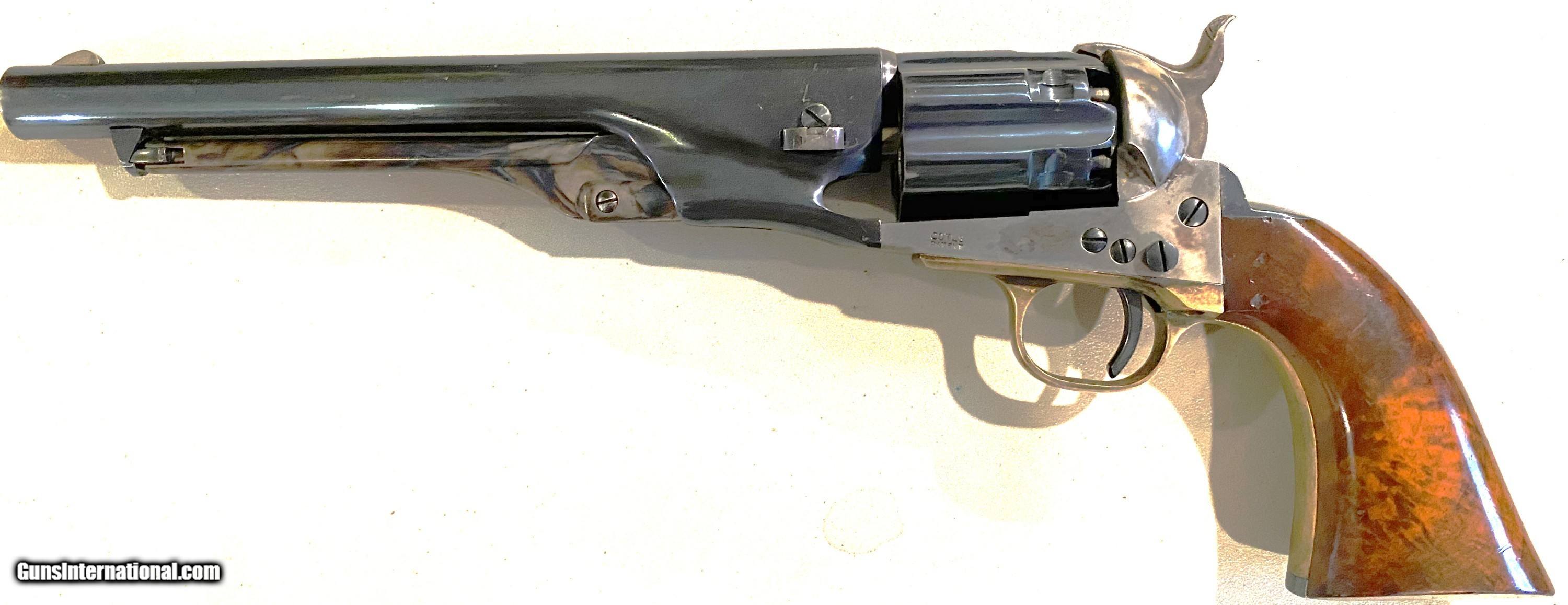 Description: These fine revolvers are from years of collecting by a private collector. This listing is for a pair (2) of consecutive serial numbered revolvers in Excellent condition. The 1860 Army revolver was adopted by the U.S. Ordnance and became very popular with mounted troops because of its easy handling, superior balance, and excellent ballistics. These authentic reproductions are 44 Caliber percussion revolvers with round barrels, brass trigger guards, 6-shot fluted cylinders, case colored frames, fixed sights, and one-piece walnut grips. Features