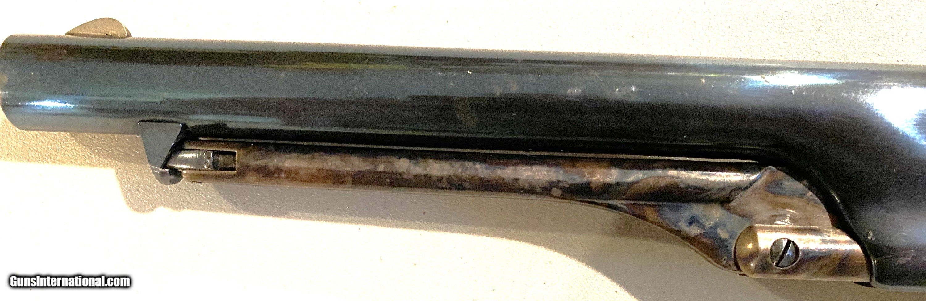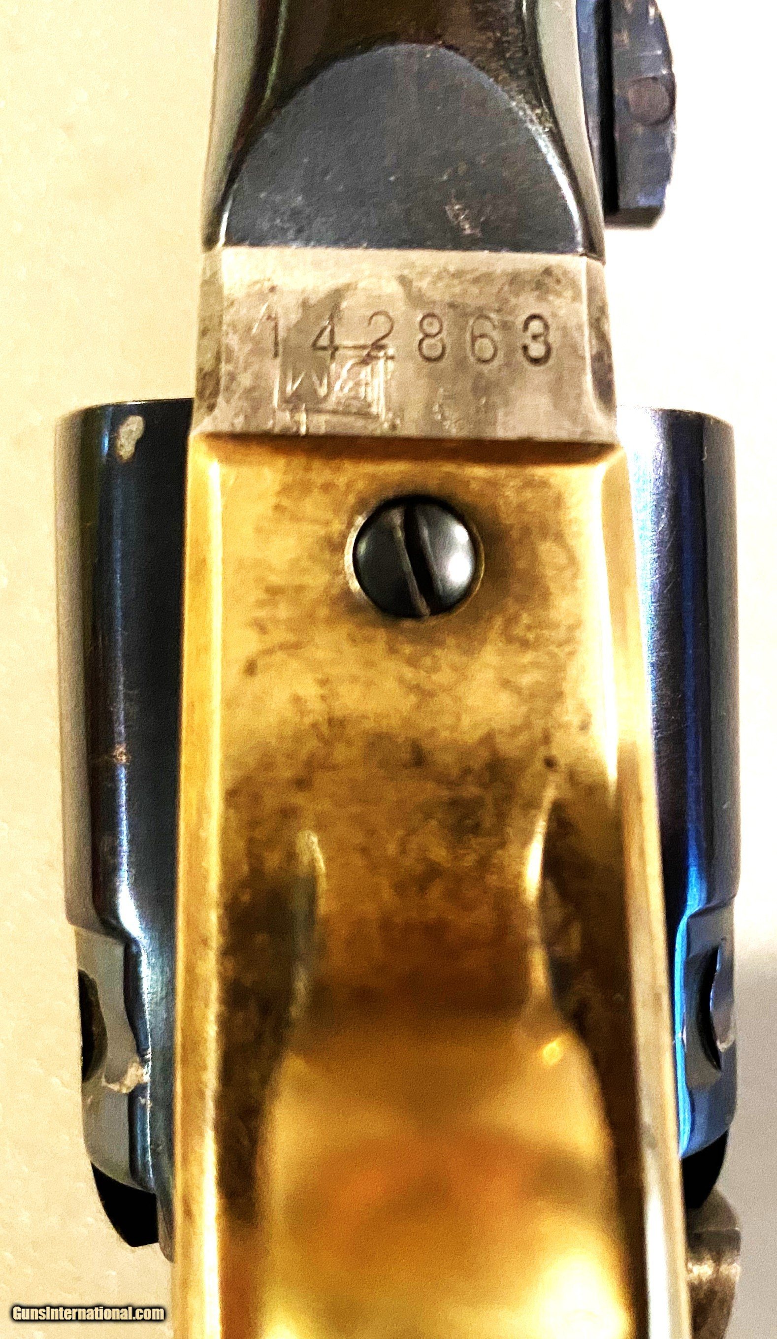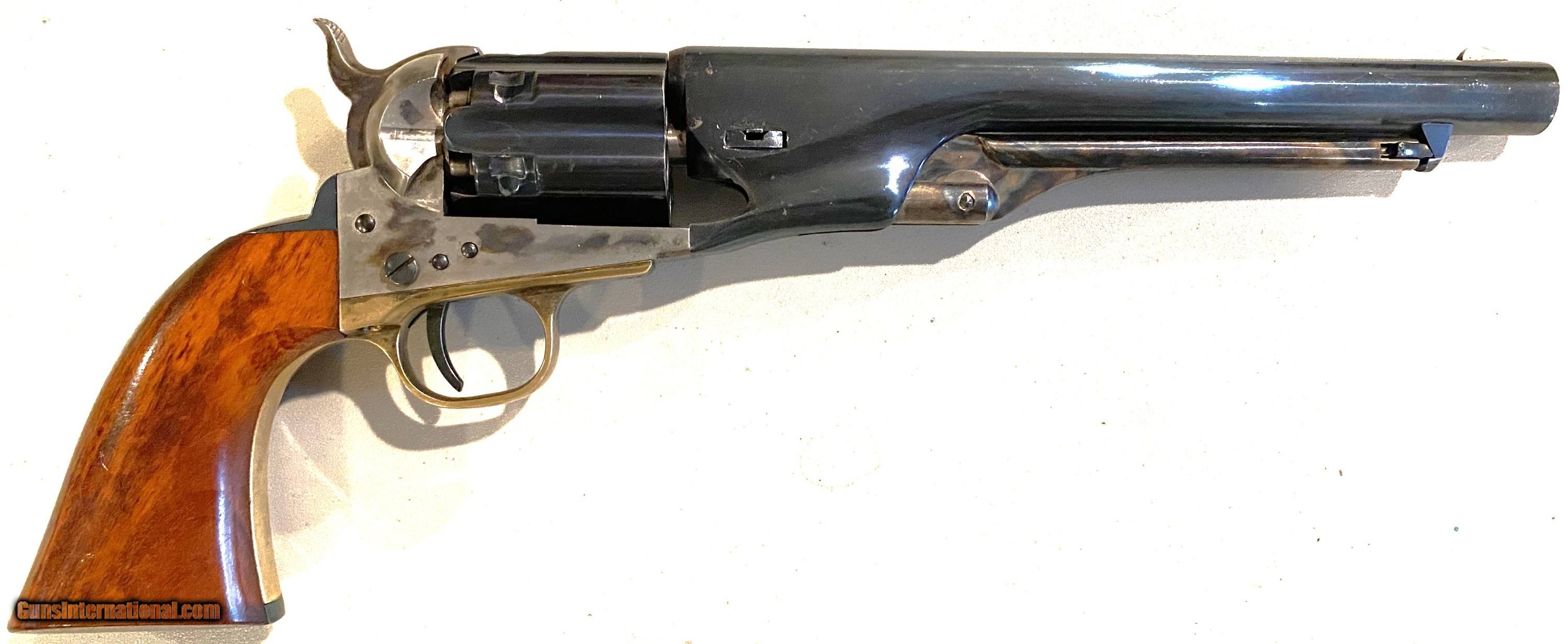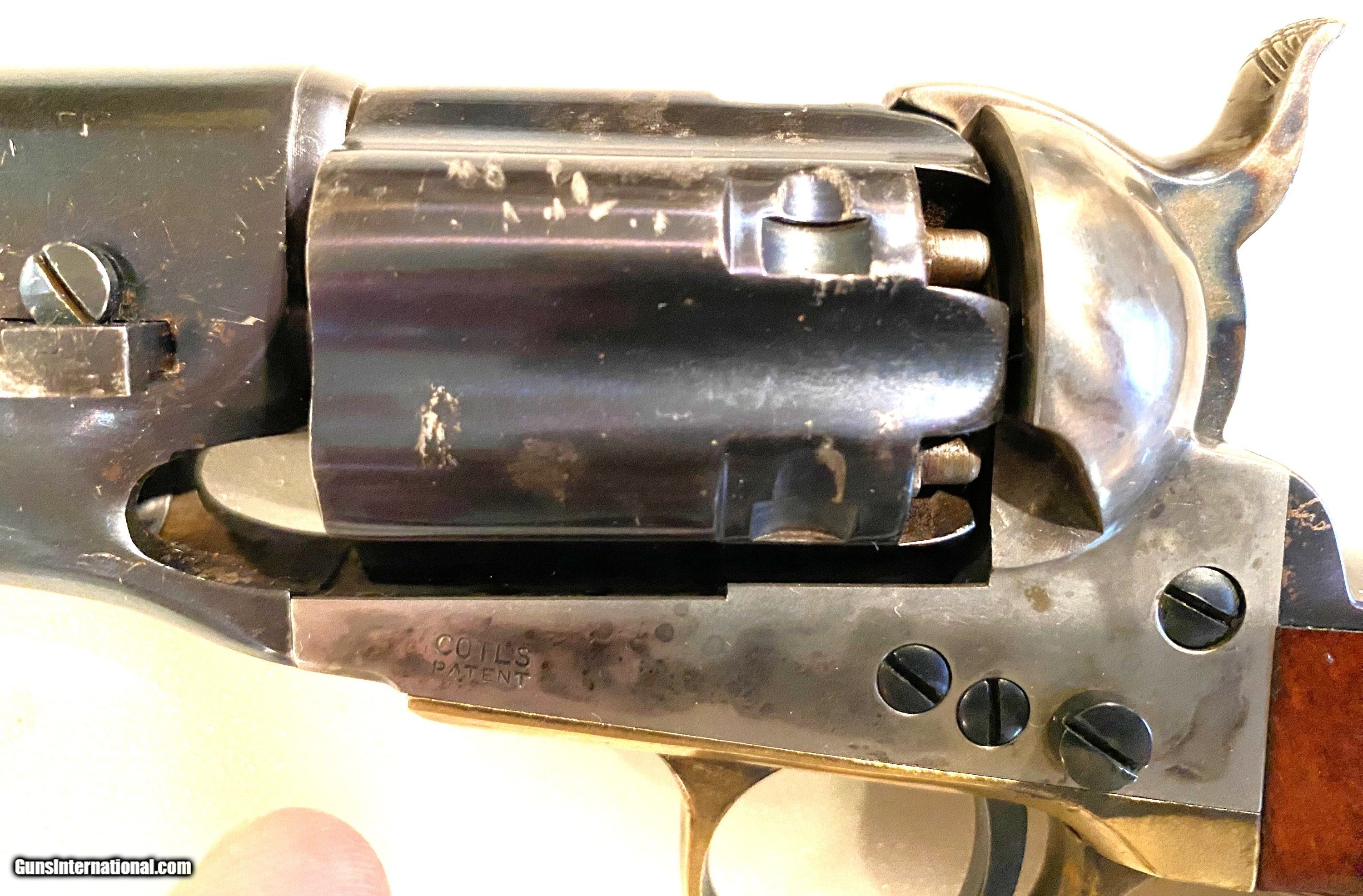 Description: These fine revolvers are from years of collecting by a private collector. This listing is for a pair (2) of consecutive serial numbered revolvers in Excellent condition. The 1860 Army revolver was adopted by the U.S. Ordnance and became very popular with mounted troops because of its easy handling, superior balance, and excellent ballistics. These authentic reproductions are 44 Caliber percussion revolvers with round barrels, brass trigger guards, 6-shot fluted cylinders, case colored frames, fixed sights, and one-piece walnut grips. Features