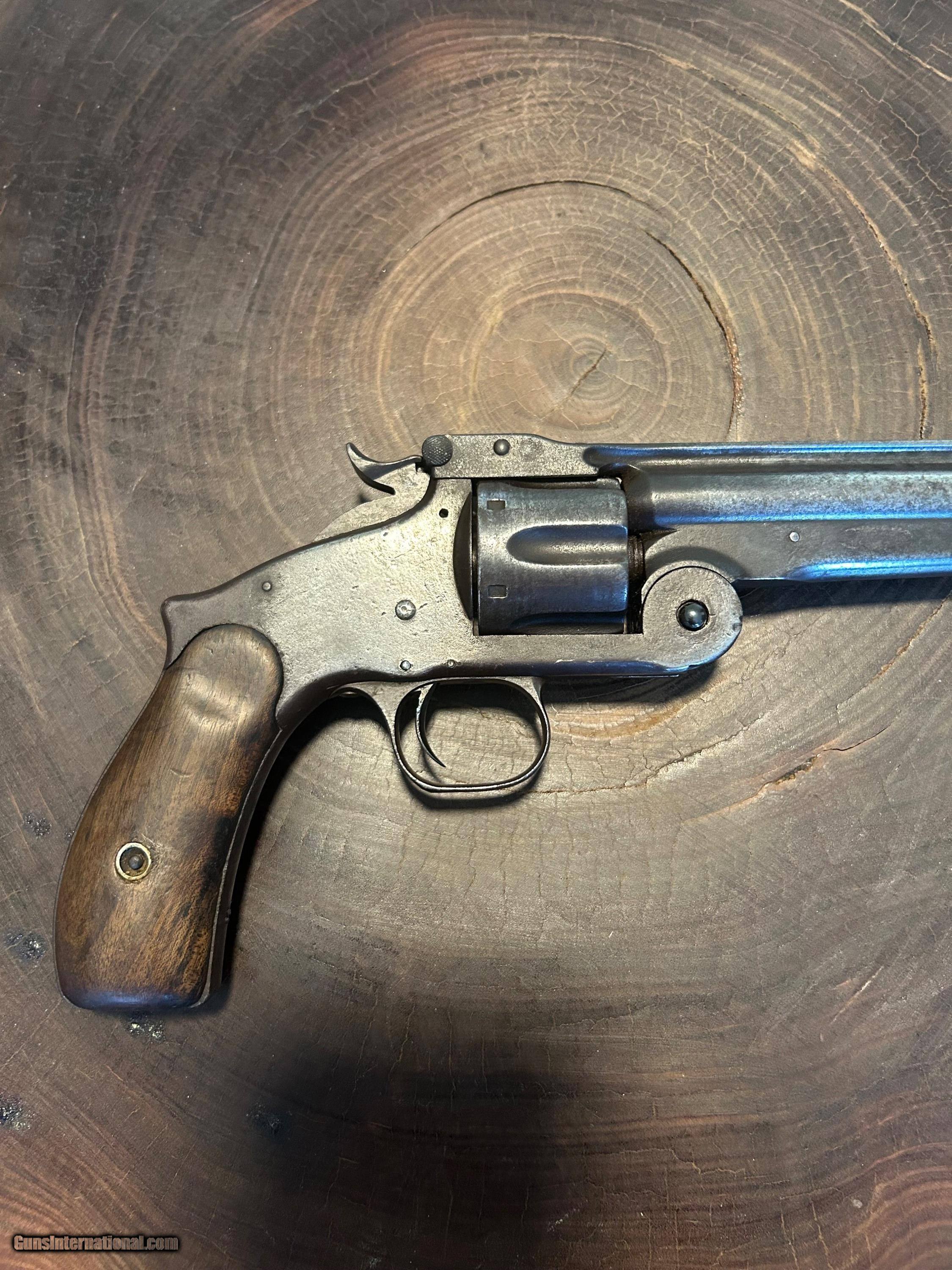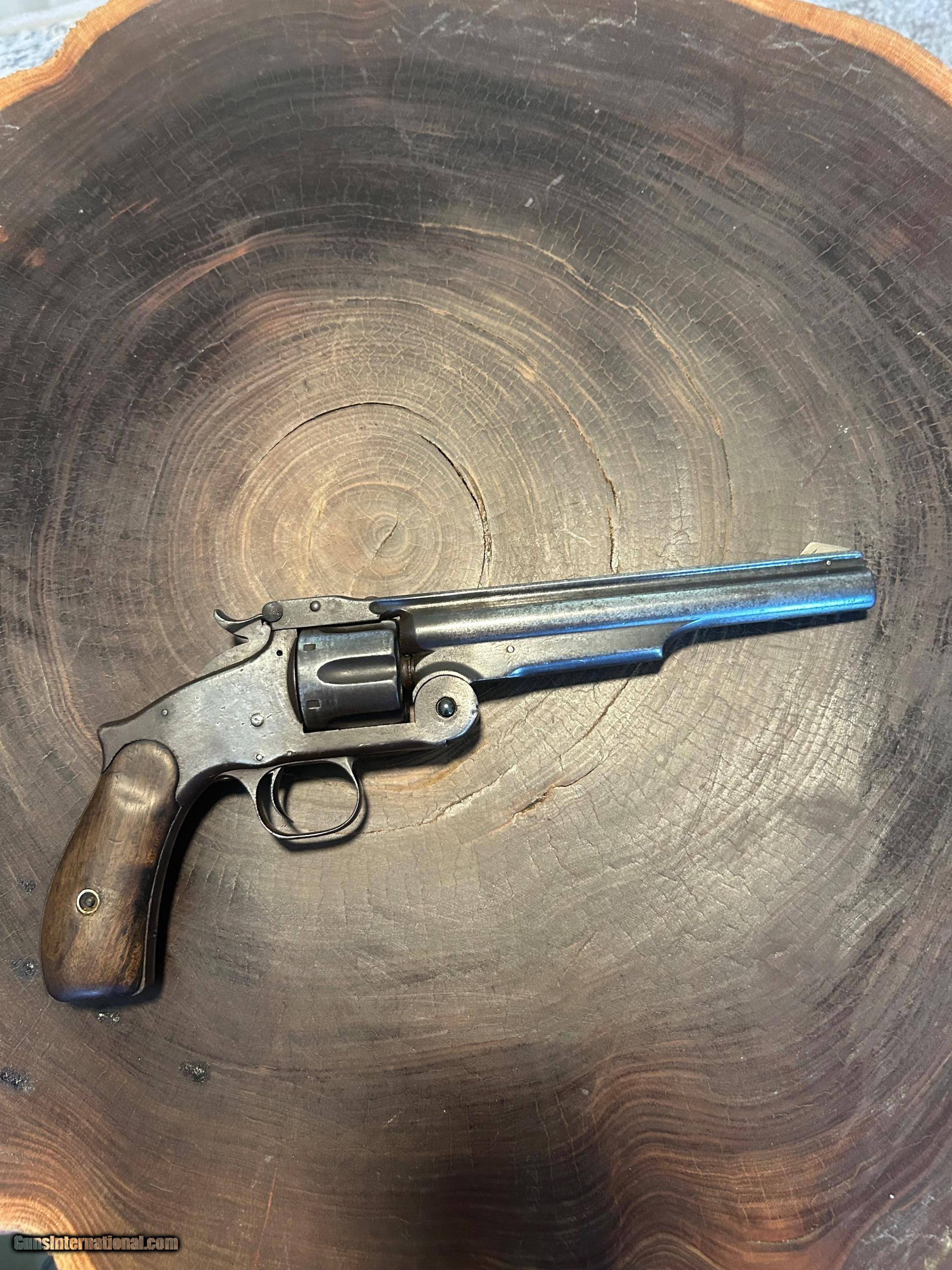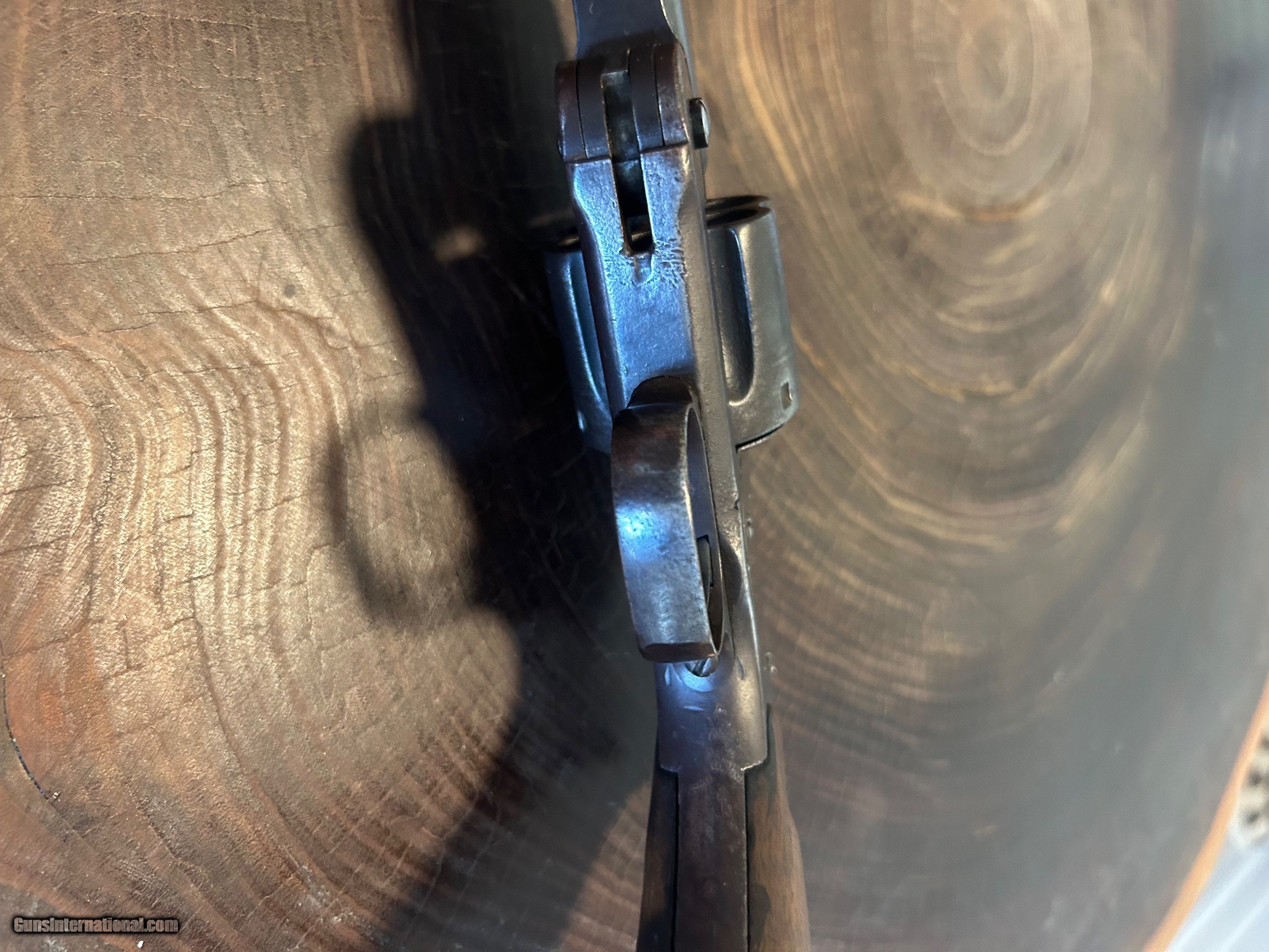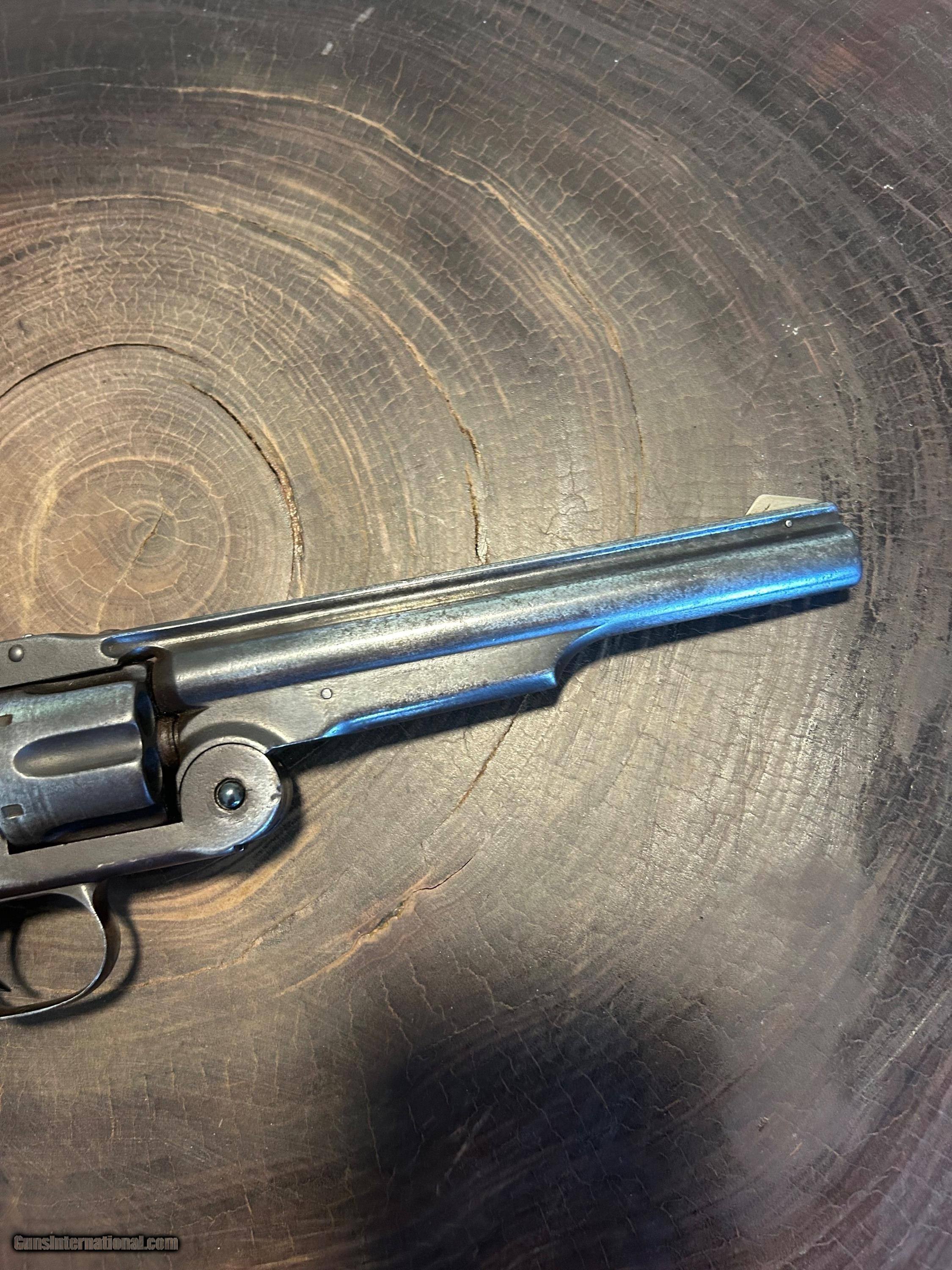 Description: Reduced!!! Good Price. Fair condition antique Smith & Wesson Model 3 Russian Second Model Revolver in .44 Russian caliber. Mechanically needs work as the hammer does not hold at half cock and the extractor does not work. Gun has matching serial numbers on the frame and barrel latch. Cylinder does not match. The barrel hinge screw is a replacement and one frame screw is missing. Triggerguard spur has been removed. Metal has brown patina. 7” barrel has a fair to good bore with good rifling and some pitting. Wood grips show some wear. A classic Smith & Wesson Russian revolver. SOLD Antique: Yes |