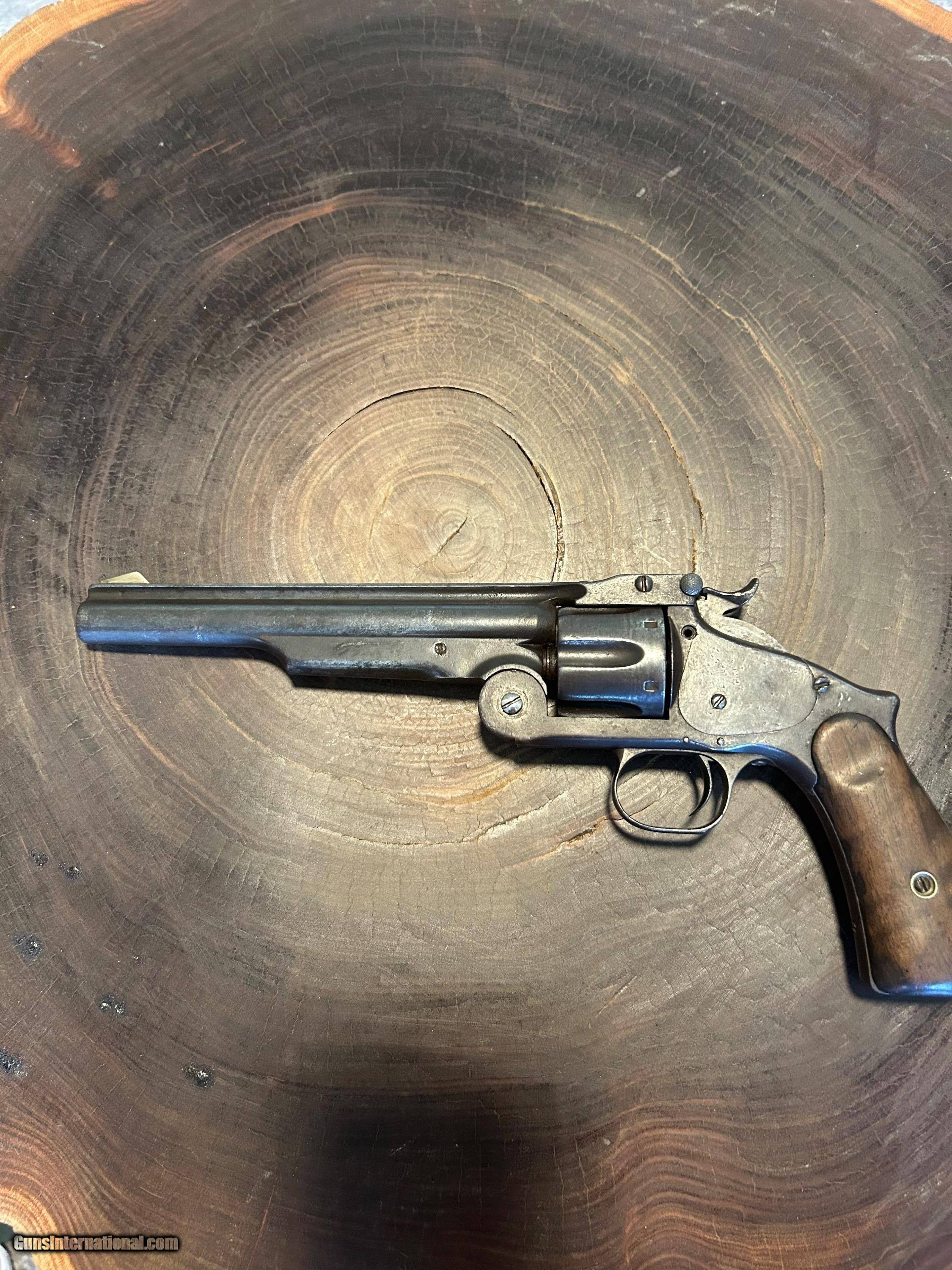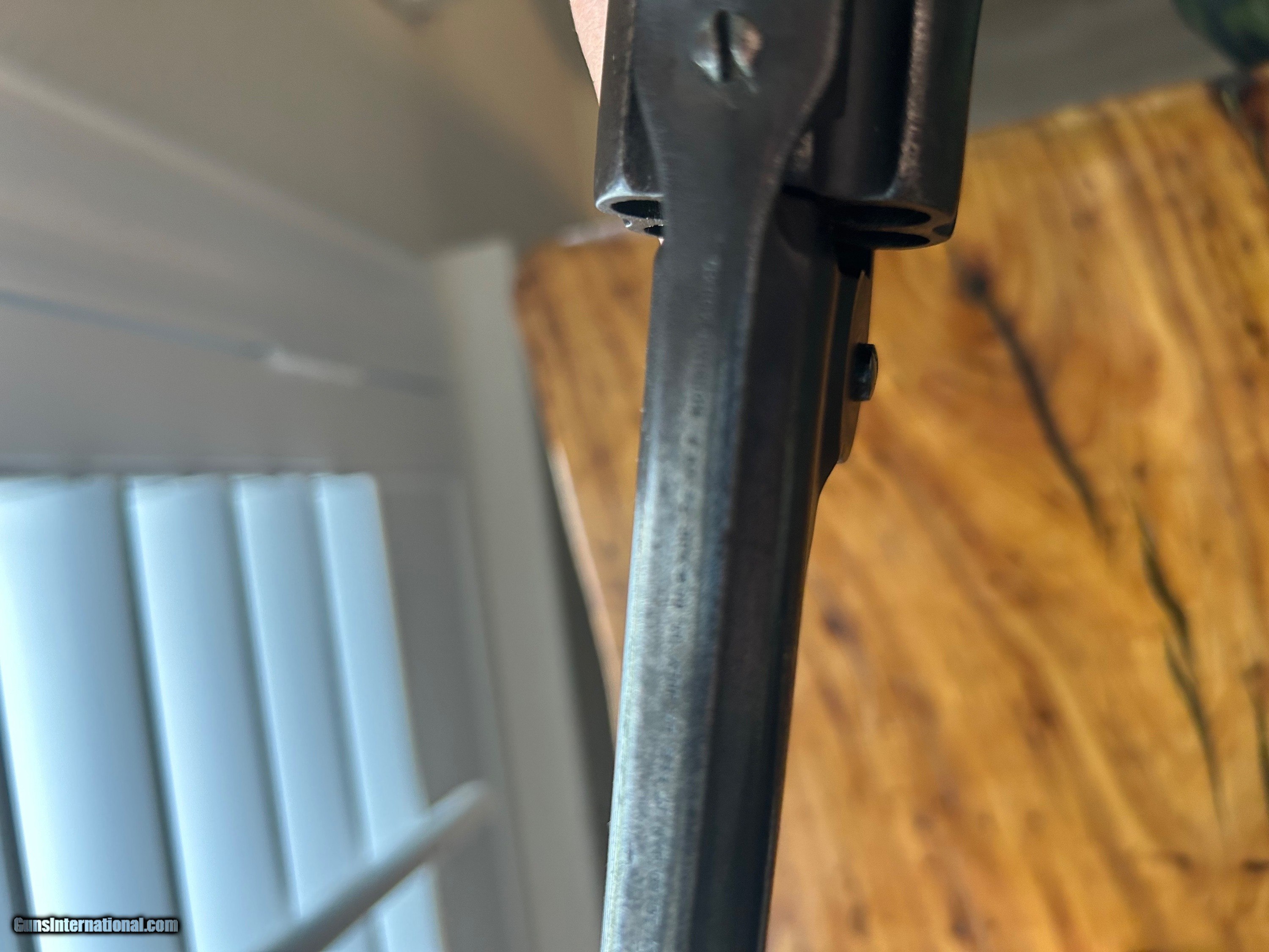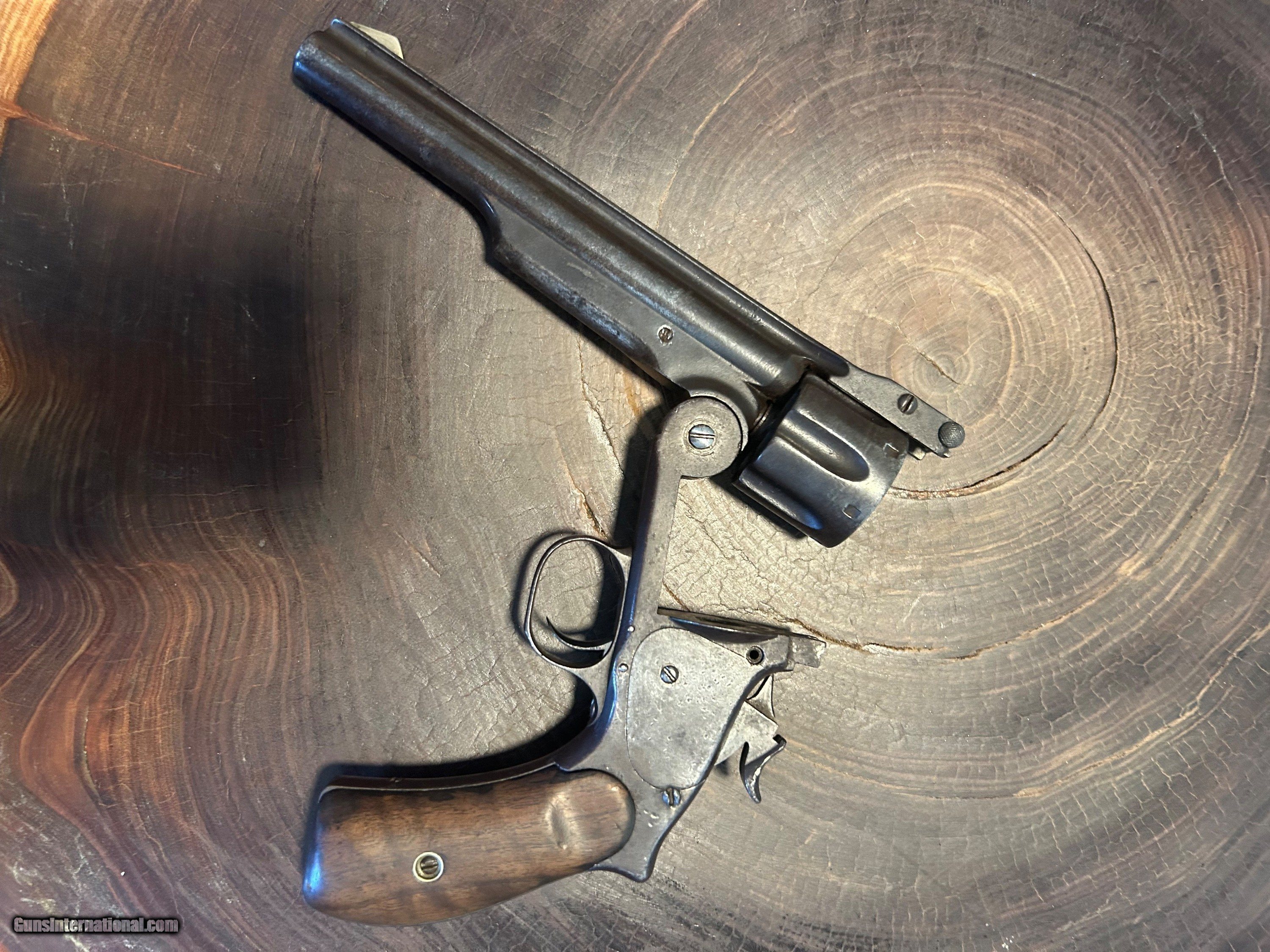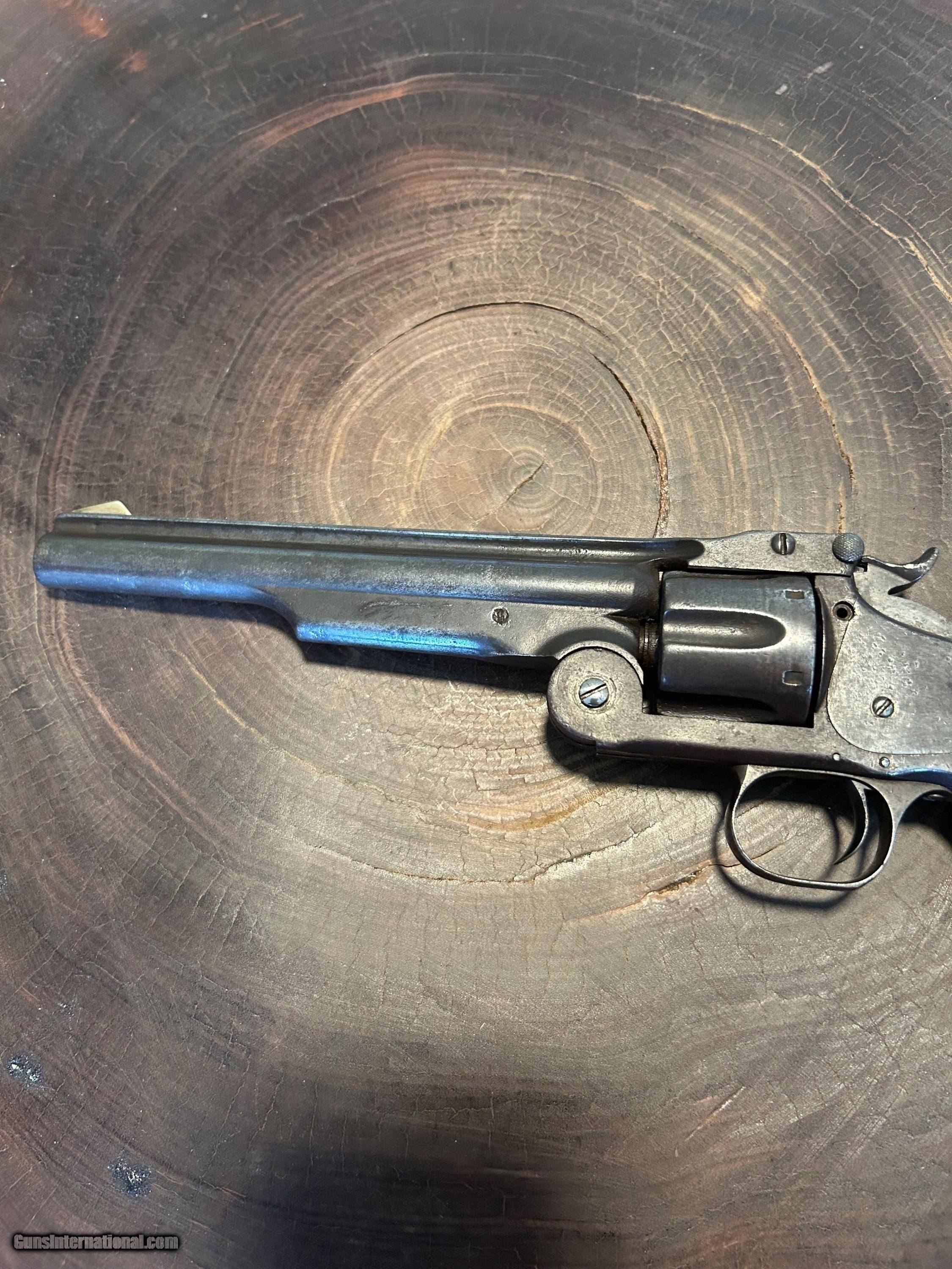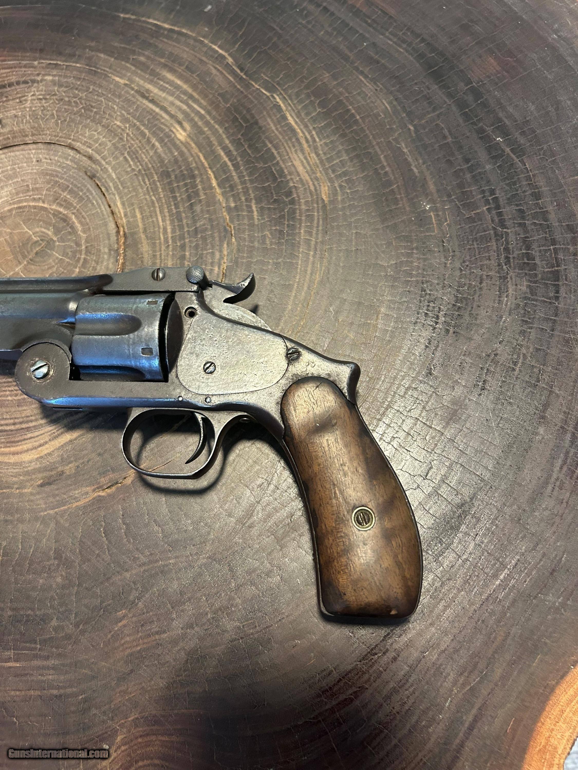 Description: Reduced!!! Good Price. Fair condition antique Smith & Wesson Model 3 Russian Second Model Revolver in .44 Russian caliber. Mechanically needs work as the hammer does not hold at half cock and the extractor does not work. Gun has matching serial numbers on the frame and barrel latch. Cylinder does not match. The barrel hinge screw is a replacement and one frame screw is missing. Triggerguard spur has been removed. Metal has brown patina. 7” barrel has a fair to good bore with good rifling and some pitting. Wood grips show some wear. A classic Smith & Wesson Russian revolver. SOLD Antique: Yes |
