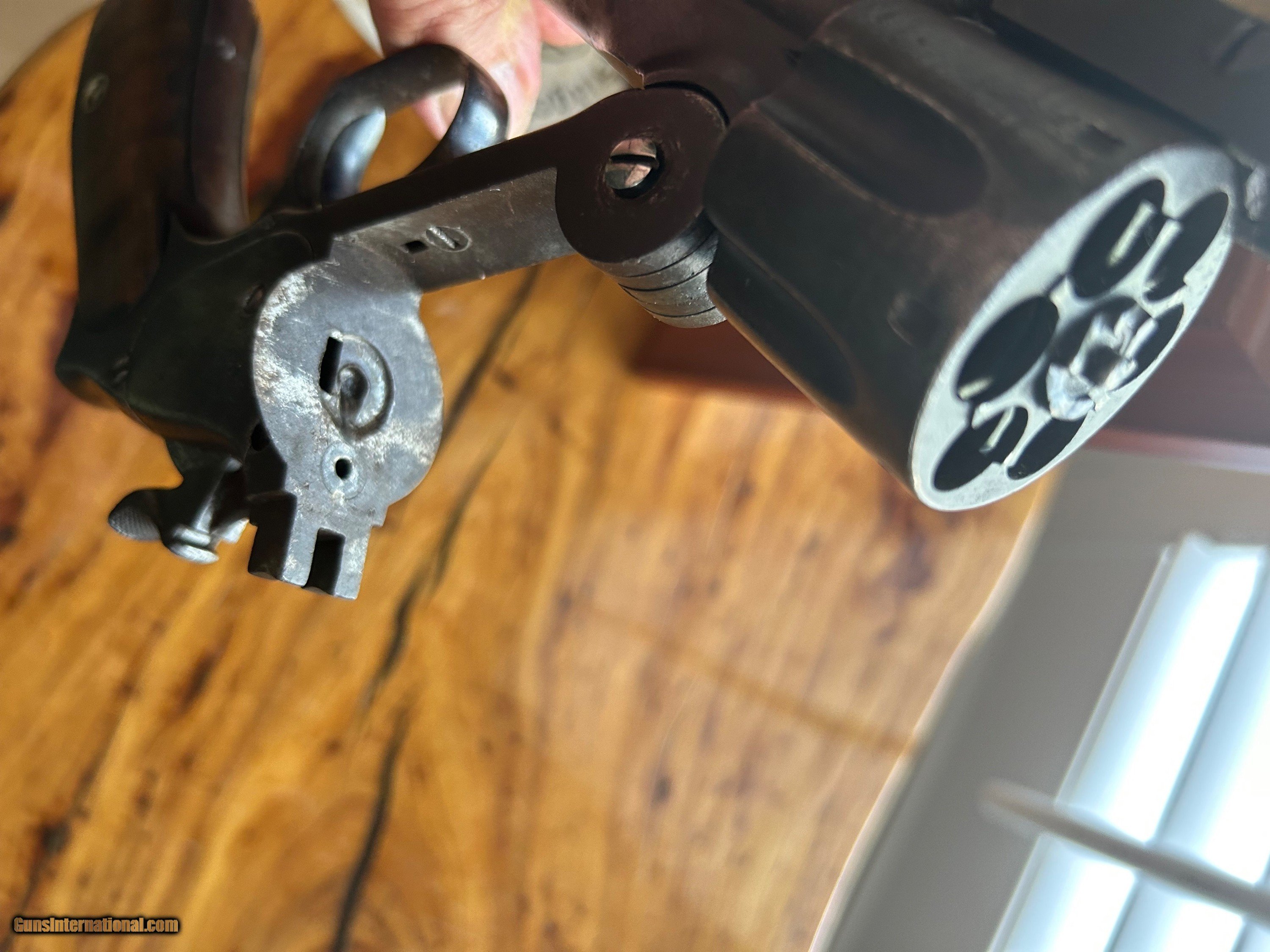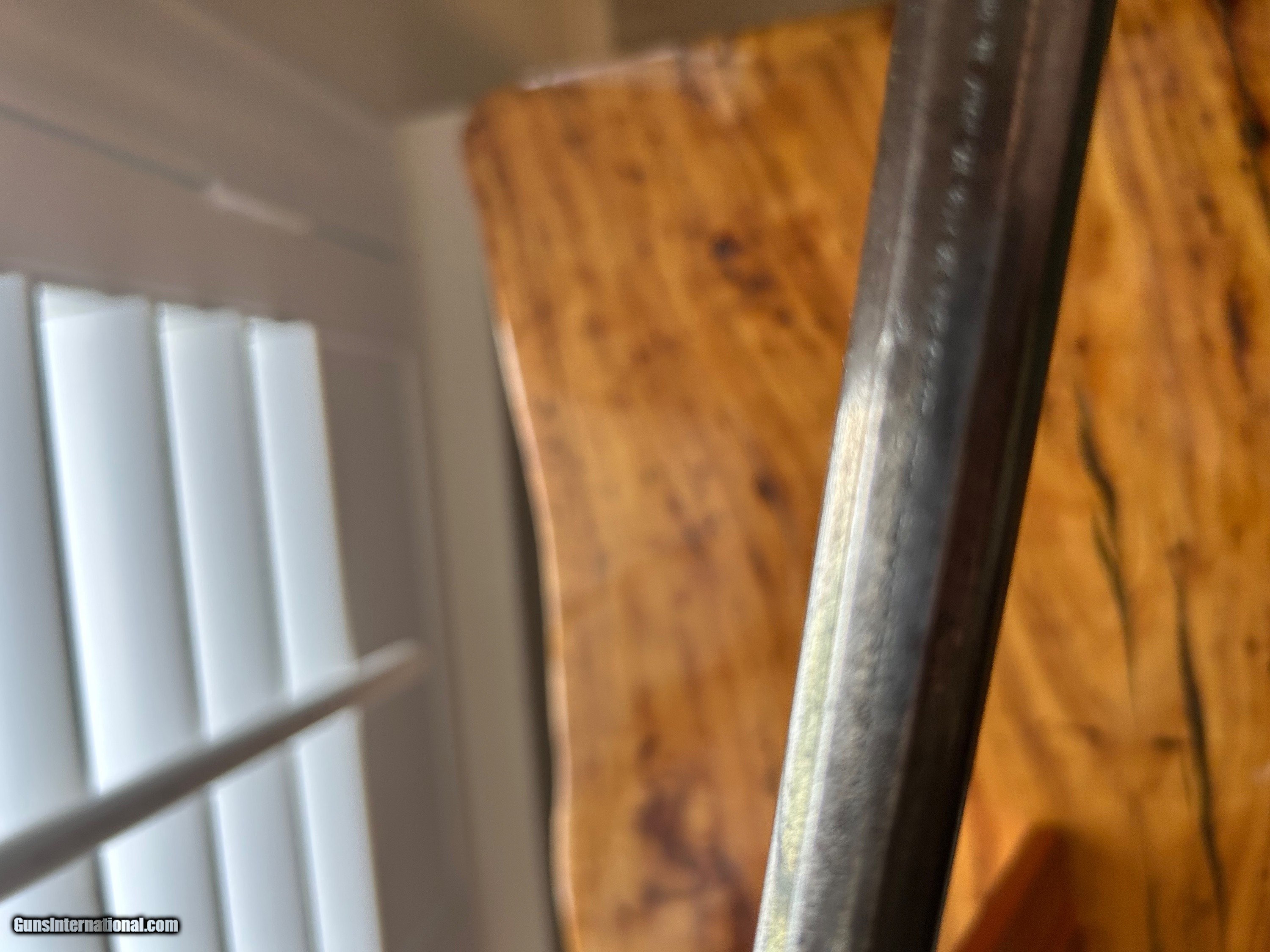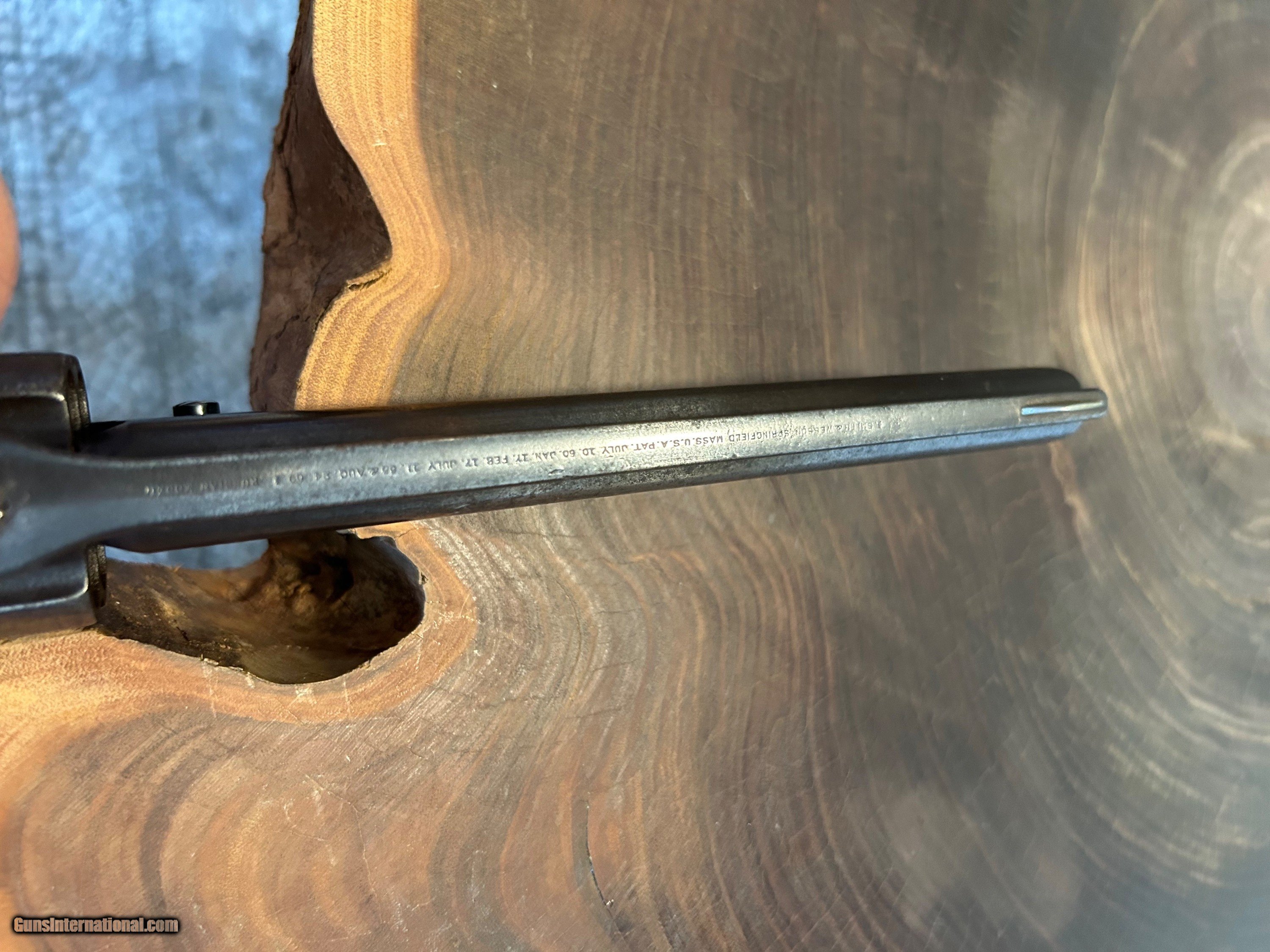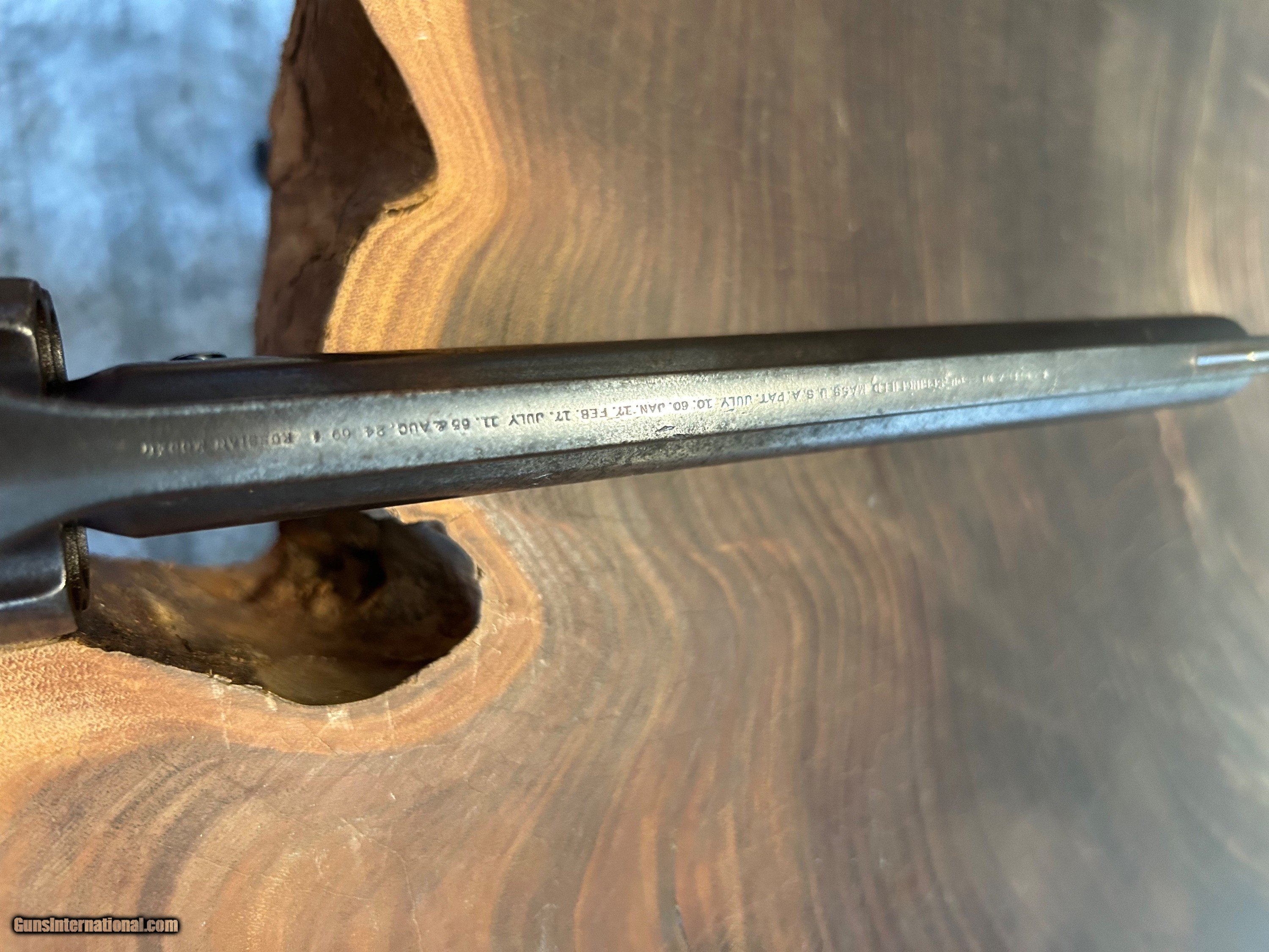 Description: Reduced!!! Good Price. Fair condition antique Smith & Wesson Model 3 Russian Second Model Revolver in .44 Russian caliber. Mechanically needs work as the hammer does not hold at half cock and the extractor does not work. Gun has matching serial numbers on the frame and barrel latch. Cylinder does not match. The barrel hinge screw is a replacement and one frame screw is missing. Triggerguard spur has been removed. Metal has brown patina. 7” barrel has a fair to good bore with good rifling and some pitting. Wood grips show some wear. A classic Smith & Wesson Russian revolver. SOLD Antique: Yes |