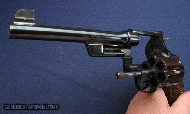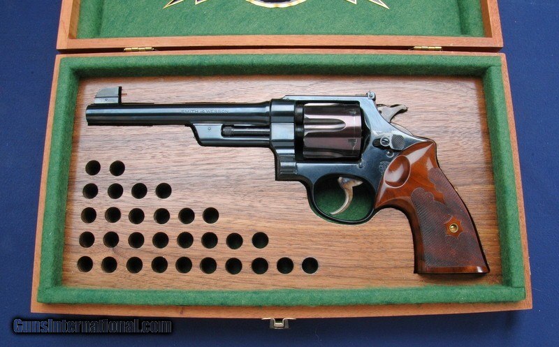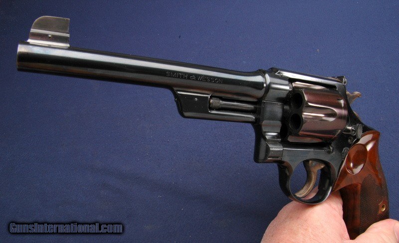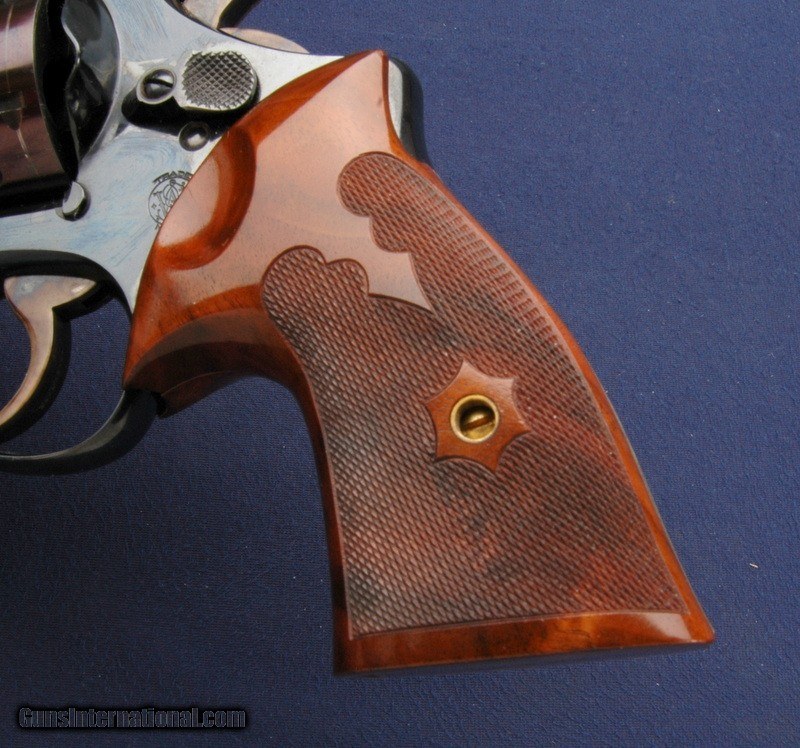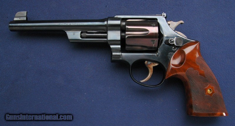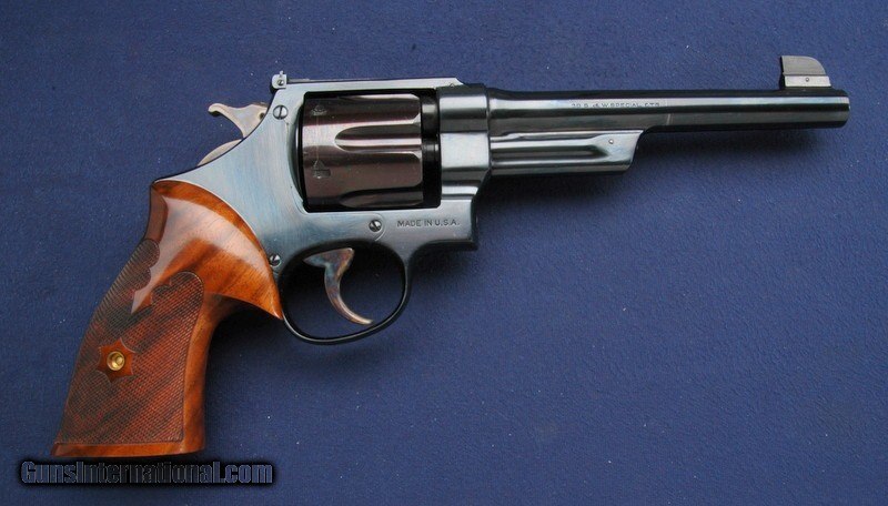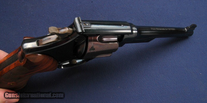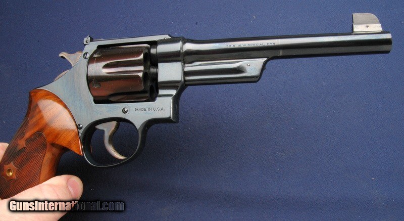 Description: This revolver was originally a prewar S&W Outdoorsman chambered in .38 Special. It was sent in to Andy Horvath for a conversion to .44 Special. 6.5" barrel with a custom tall blade front sight pinned on. The rest of the gun is in original configuration other than the fantastic trigger job, which Andy is know for the reblue and color case on the hammer and trigger. The grips are absolutely killer and even though they end at the bottom of the grip frame, they are stunning and perfectly fit. I have no support for my pinkie, yet the gun feels stable in my hand because of the shape of these grips. The caliber markings on the barrel were not altered, so it still says.38 Special. The cylinder is turning plum. The custom case was built for this revolver and of course is included. $55 shipping to the lower 48, 3% surcharge for using a CC. If you choose to pay with a personal check, we will hold the item for up to 10 days to make sure that it clears. Please expedite such pymts as we will hold an item on your word for 5 days. SOLD |