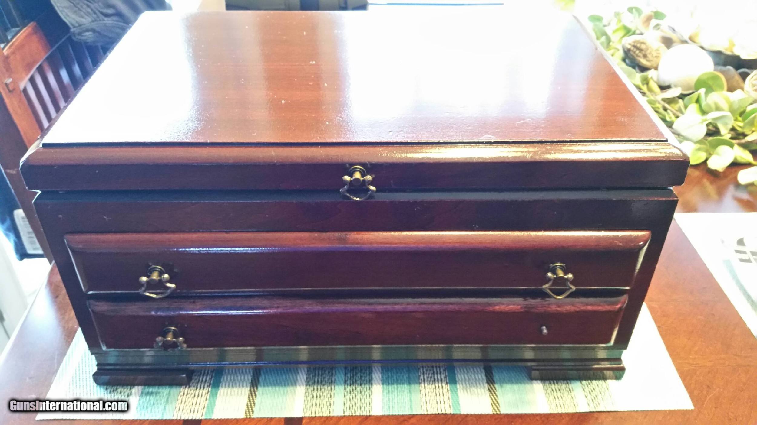 Description: COLT SAA NEW FRONTIER WITH THE MANS JEWLRY BOX 71/2 BARREL IN GREAT CONDITION THERE IS A PLACE ON BARREL WHERE ITS FADING FROM BEING IN THE BOX SO LONG TIMING AND LOCKUP ARE SPOT ON RARE 44 SPECIAL CALIBER PAPERWORK IS IN DRAWER AND ONE OF THE DRAWER PULLS IS MISSING PART OTHER THAN THAT ITS A NICE REVOLVER FOR THE SAA FANS BORE IS FANTASTIC CASE HARDENED FRAME 44 SPECIAL IS A RARE SAA SOLD Handgun Caliber: .44 Special Manufacturer: COLT Model: SAA NEW FRONTIER Serial Number: 06024NF Barrel Length: 7 1/2 Condition: GREAT Metal Condition: GOOD Wood Condition: GREAT Bore Condition: PRISTINE |