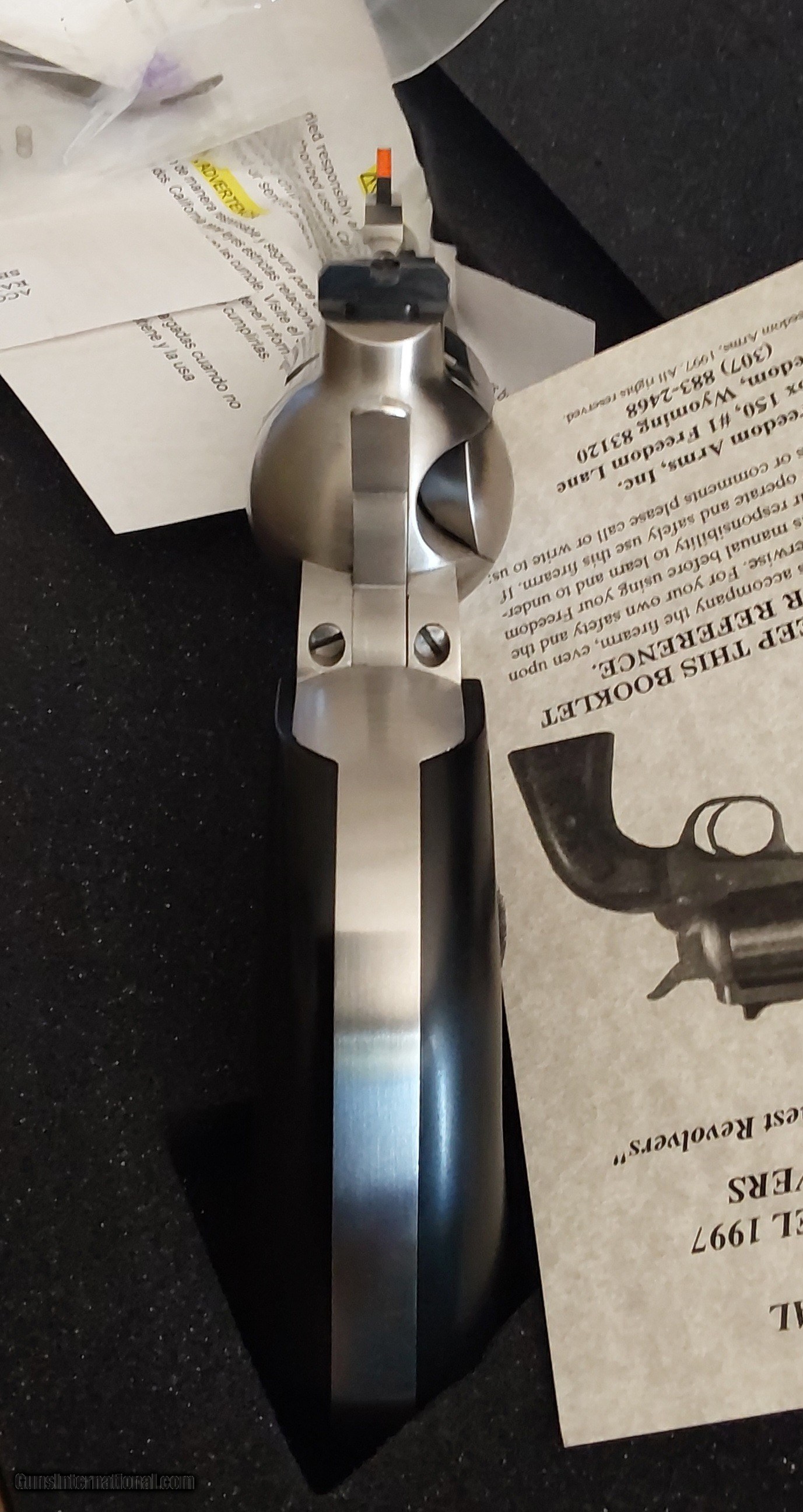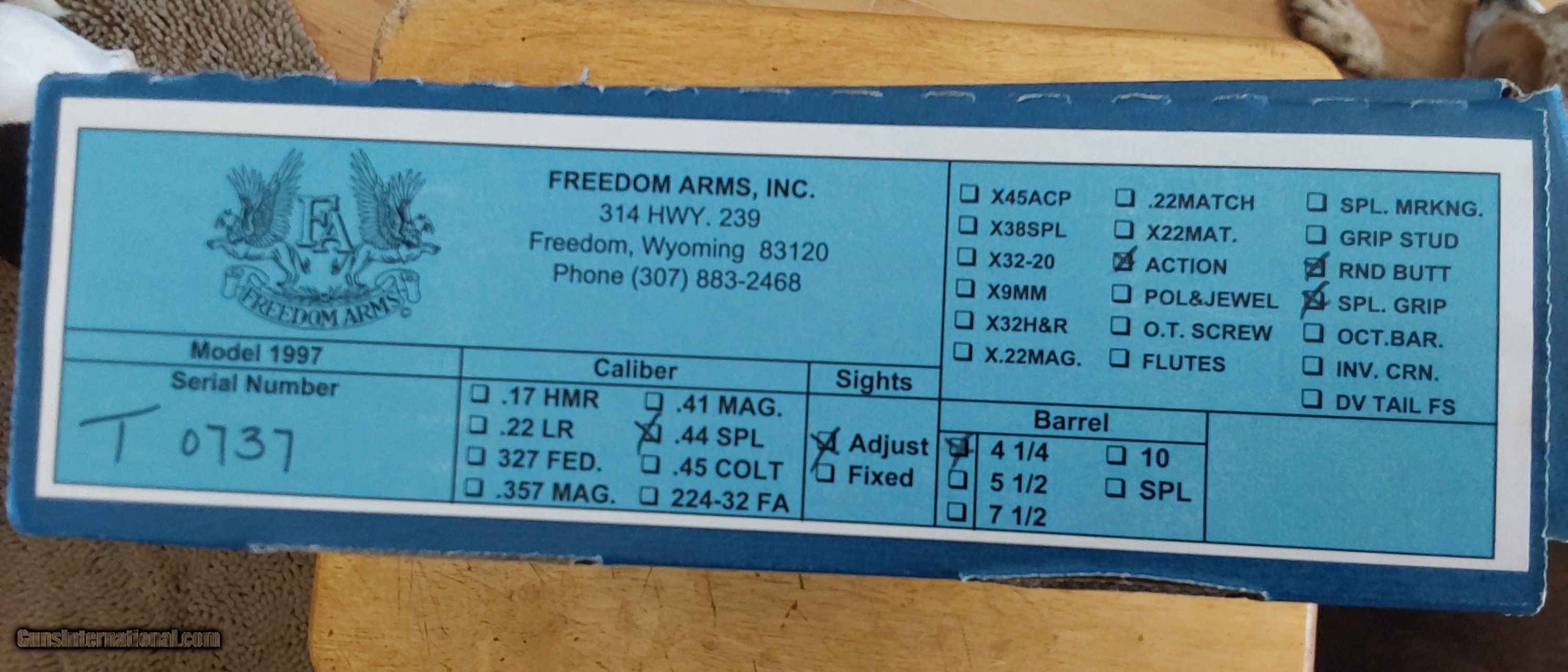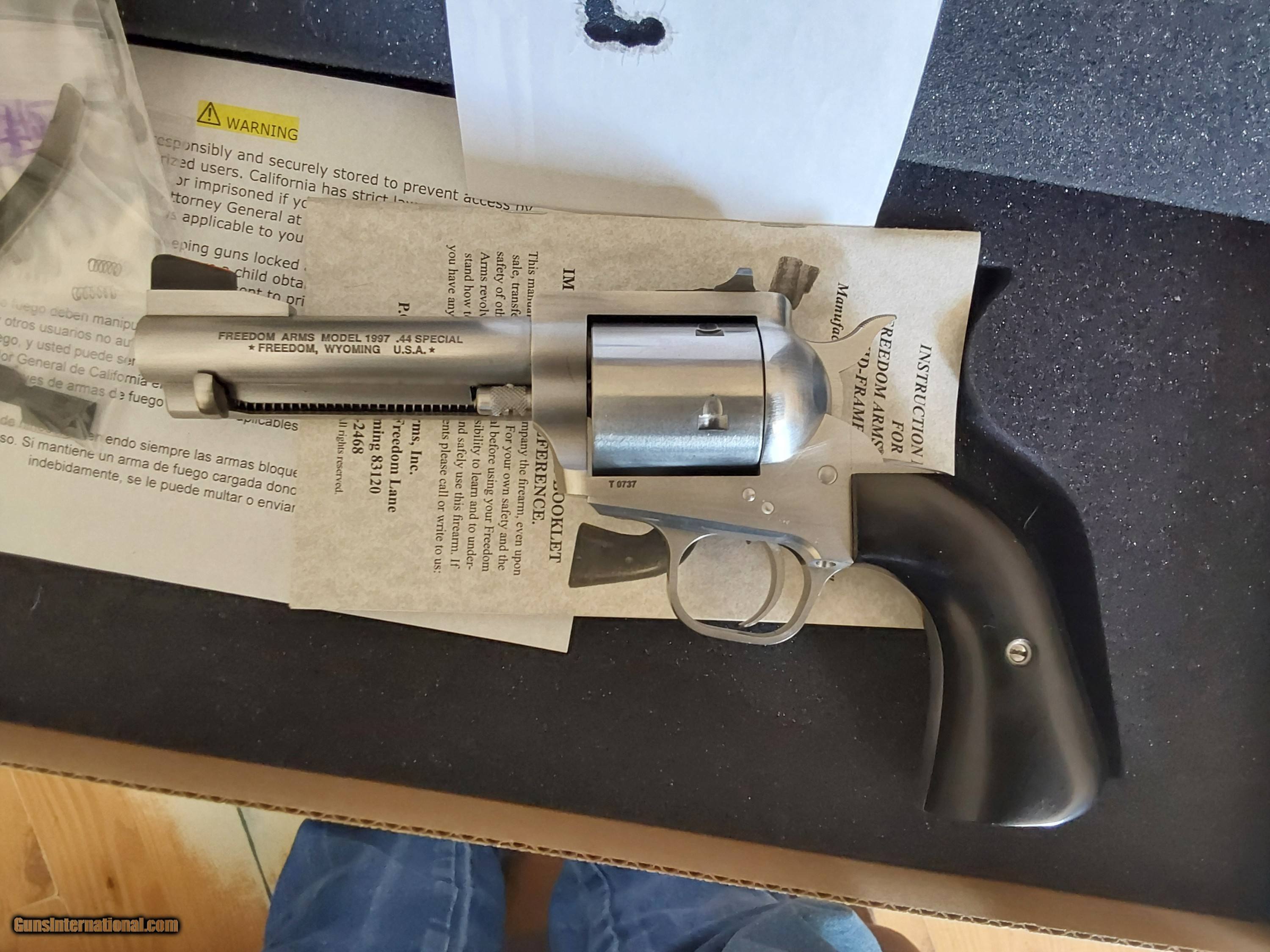 Description: As new, never fired, in box, Freedom Arms 97, .44 special. Health issues force sale. 4.25 barrel, Round butt, black micarta grips, factory 3lbs trigger job, standard notch and blade adj. sight. Included is a secong set of bead express sights. Also included is a complete set of factory springs. SOLD Handgun Caliber: .44 Special Manufacturer: Freedom Arms Model: 97 Serial Number: T0737 Condition: New |