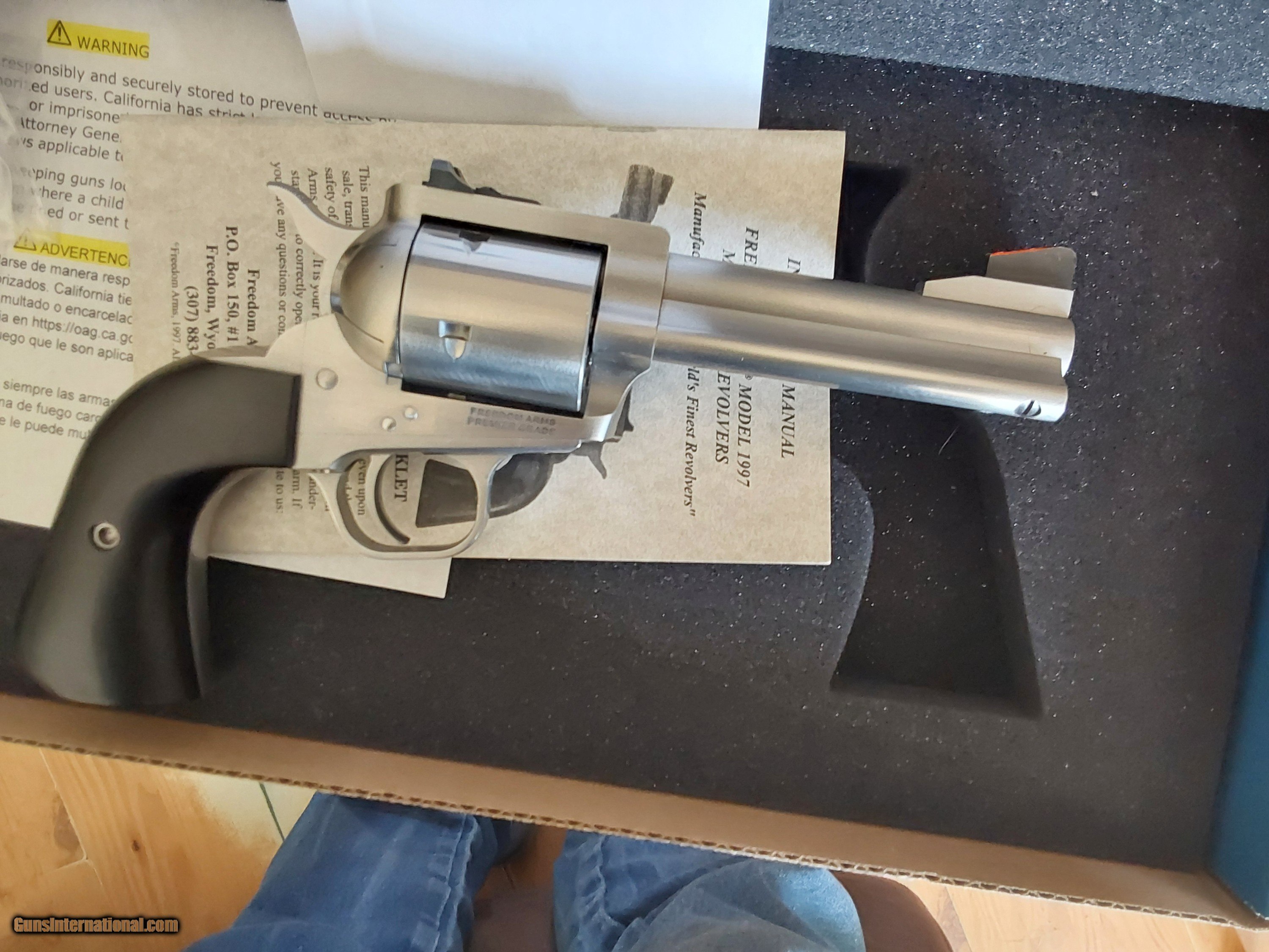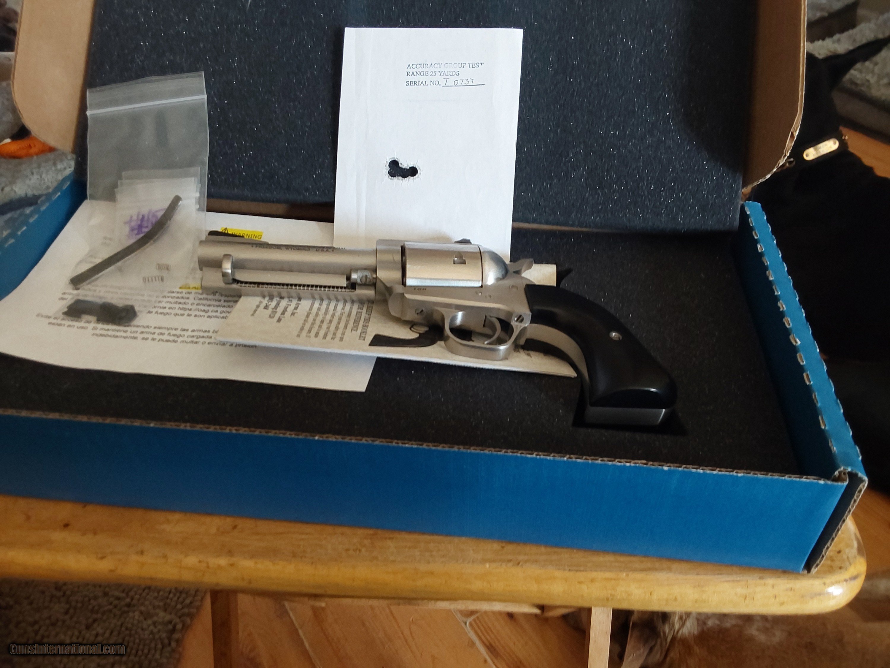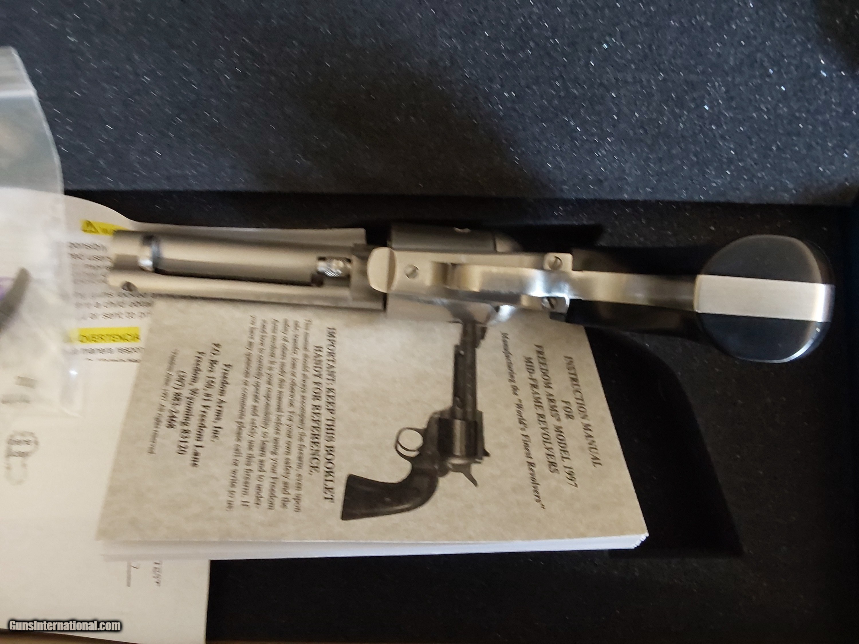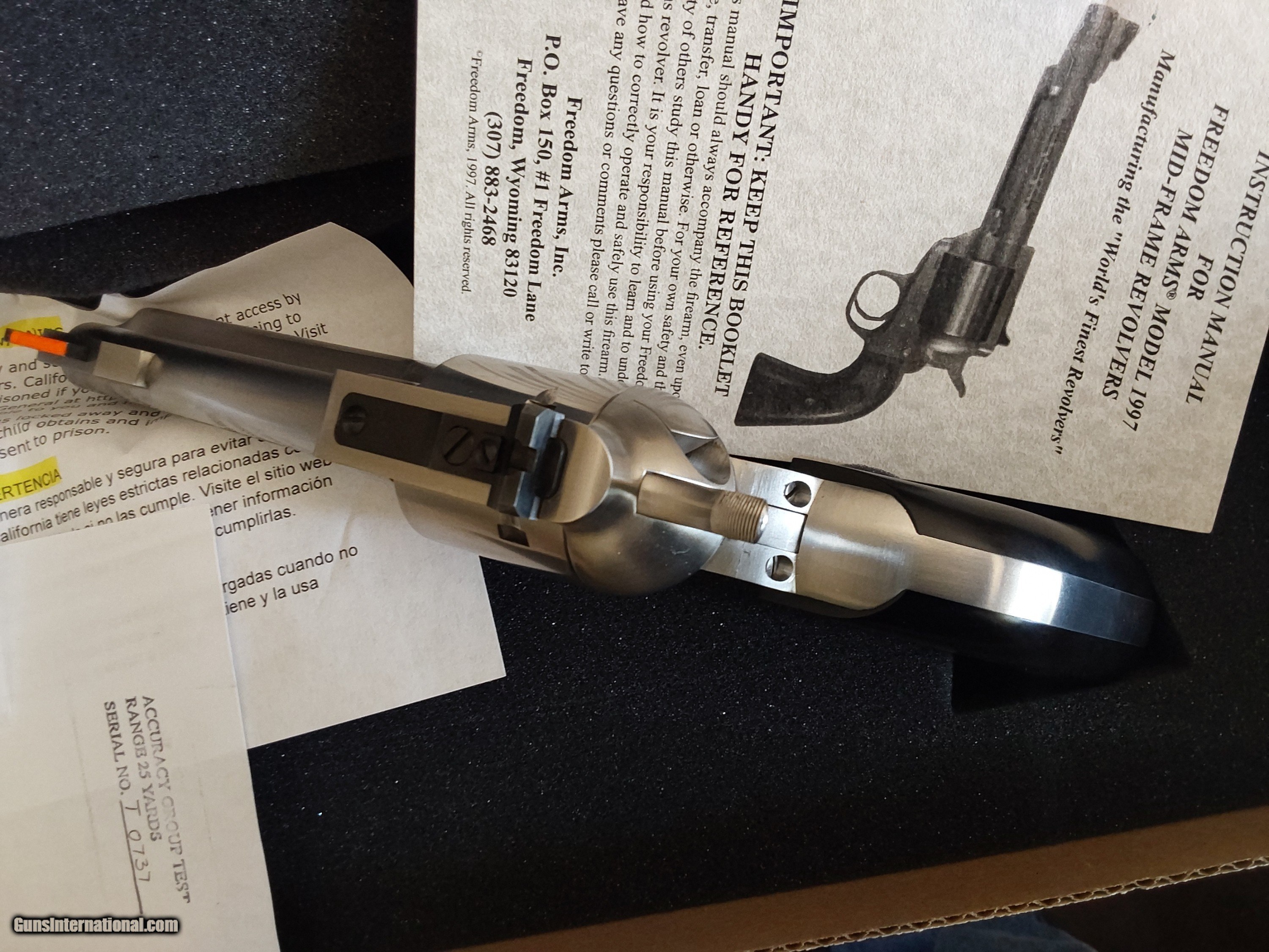 Description: As new, never fired, in box, Freedom Arms 97, .44 special. Health issues force sale. 4.25 barrel, Round butt, black micarta grips, factory 3lbs trigger job, standard notch and blade adj. sight. Included is a secong set of bead express sights. Also included is a complete set of factory springs. SOLD Handgun Caliber: .44 Special Manufacturer: Freedom Arms Model: 97 Serial Number: T0737 Condition: New |