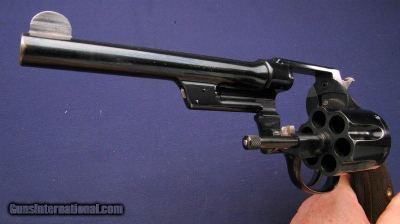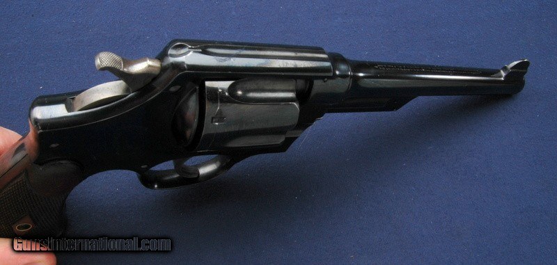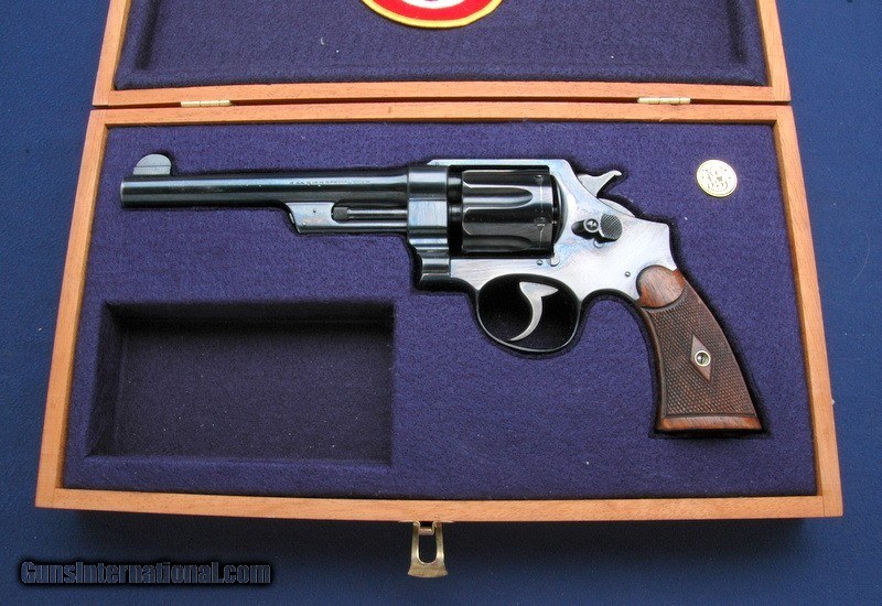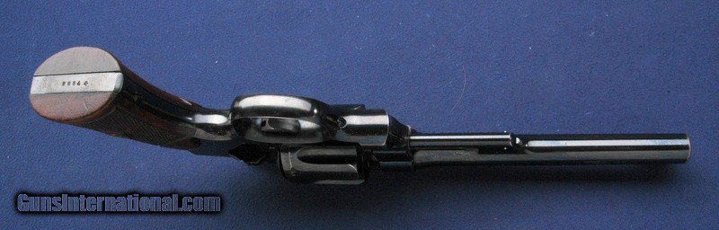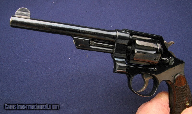 Description: Here is a very nice 1909 S&W Triplelock chambered in .44 Spl. It has the original 6.5" barrel, with a minty bore and original front sight. Fixed rear, all numbers match, tight lock up, fully functional. Star stamp on butt after serial number indicates S&W factory re blue. Grips are high excellent and are not numbered. This is really a very nice Triplelock, and there are so few of them around that this rates consideration, even as a factory re blue. It comes in a custom fitted case with a cut out for a standard 50 round box of ammunition. $55 shipping to the lower 48, 3% surcharge for using a CC. If you choose to pay with a personal check, we will hold the item for up to 10 days to make sure that it clears. Please expedite such pymts as we will hold an item on your word for 5 days. SOLD |