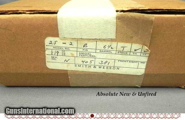 Description: #N405381, S&W Model 25-2 1955 Target Model, 45 ACP, 6 1/2" Bbl., Blue finish, Wood case with correct outer sleeve, Paperwork, Bought new about 1977 and put away, It is absolute new and unfired and was a one owner gun the last 40 years. SOLD |