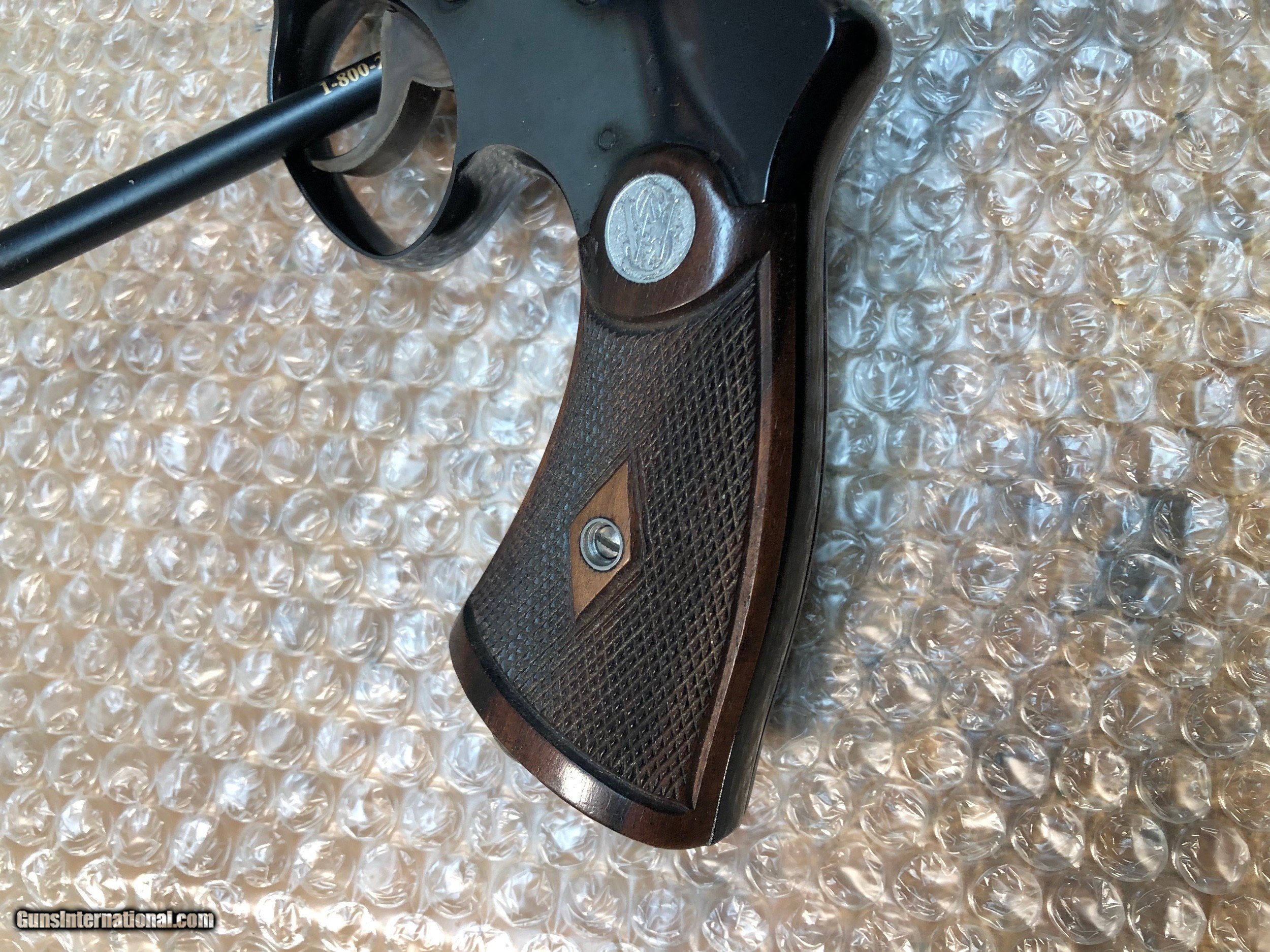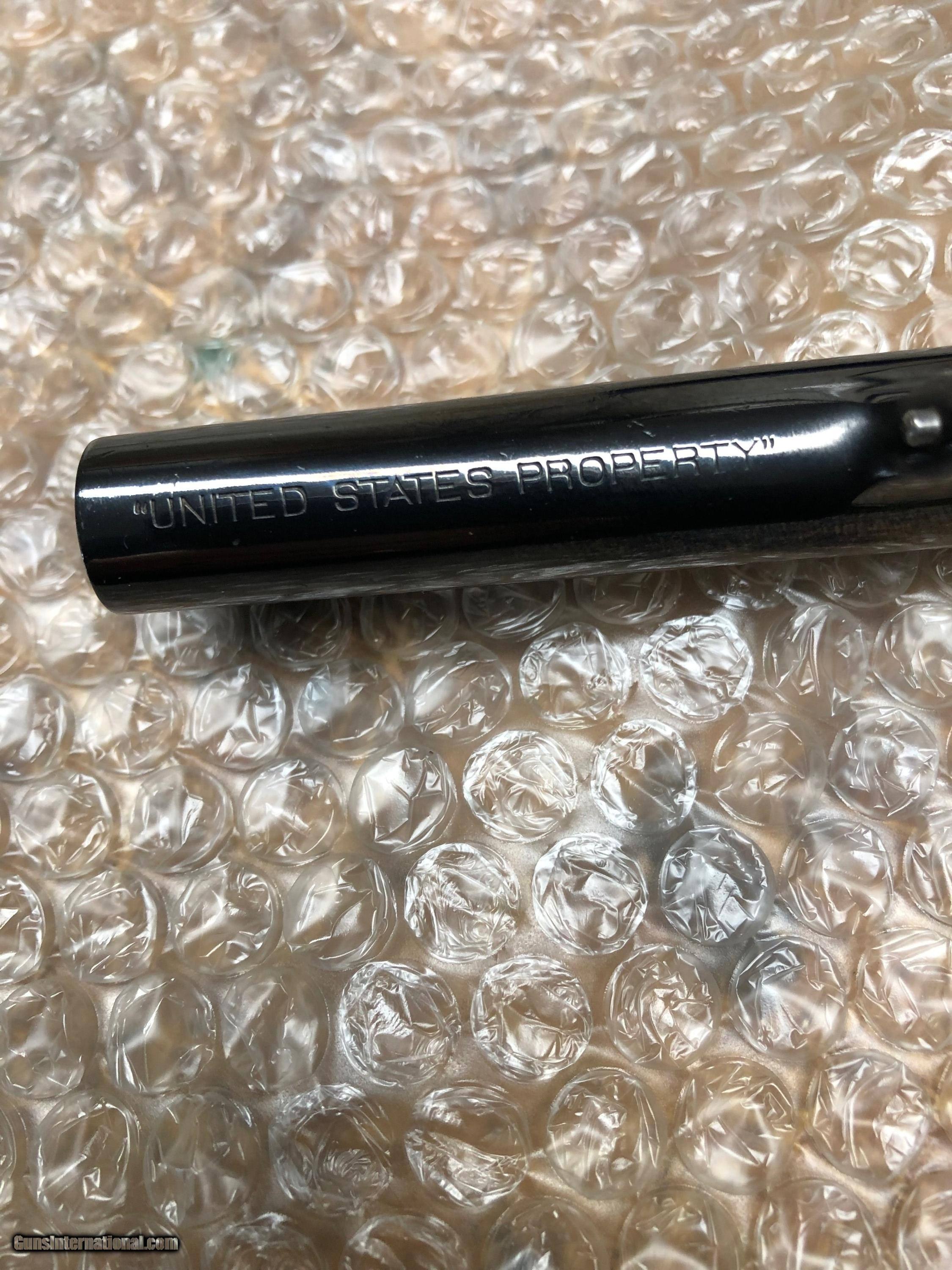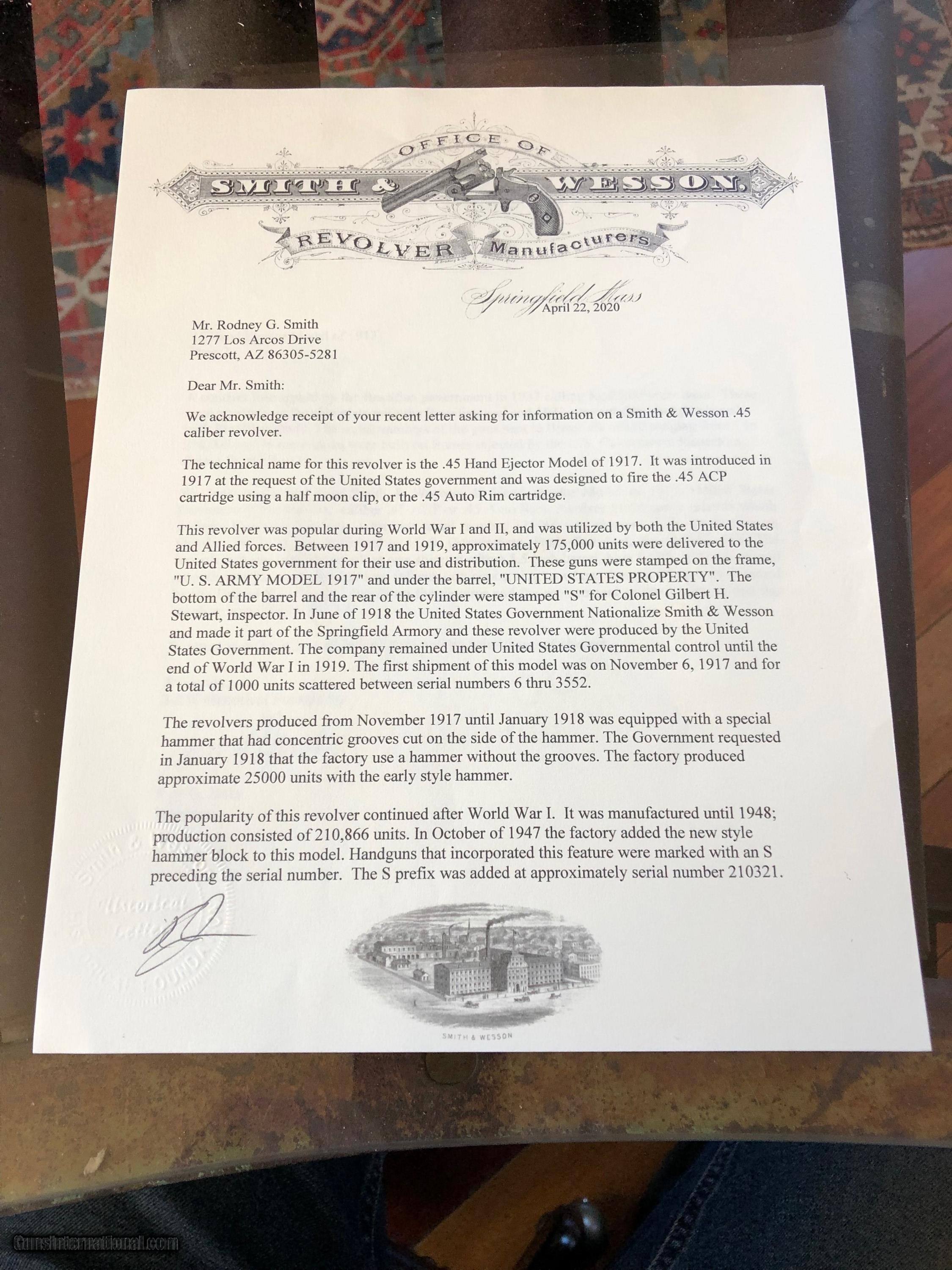 Description: This 1917 began life as a military model shipped to Bush Terminal in Springfield Mass (Smith letter included). In January 1964 it was refinished completely by Smith (letter speculates in the thirties but 1.64 and Diamond S are on frame under grip). Apparently, the restoration was to commercial specs, so the gun got checkered grips, high polish blue, and an S&W trademark on the side plate. The result is a 1917 in commercial finish with every marking Smith ever out on this model, commercial or military. Wood, metal, and case colors on hammer and trigger are 98%. Bore and breech face appear unfired. Remarkable specimen. Price includes shipping. SOLD Curio/Relic: Yes |
