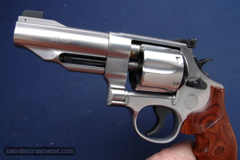 Description: Very nice used S&W 625-8 chambered in .45acp. Comes in a fitted presentation case as shown, along with the factory box. It has been fitted with custom grips, and the original red/white/blue laminates are in the box. Millet rear sight and sweet trigger job. Original parts in box. comes with a stack of moon clips, prob 8. Needs a solid cleaning, but it's a great gun with a great trigger. $55 shipping to the lower 48, 3% surcharge for using a CC. If you choose to pay with a personal check, we will hold the item for up to 10 days to make sure that it clears. Please expedite such pymts as we will hold an item on your word for 5 days. SOLD |