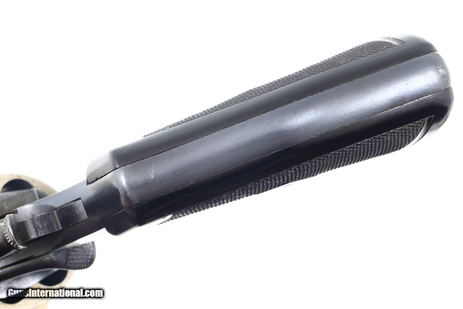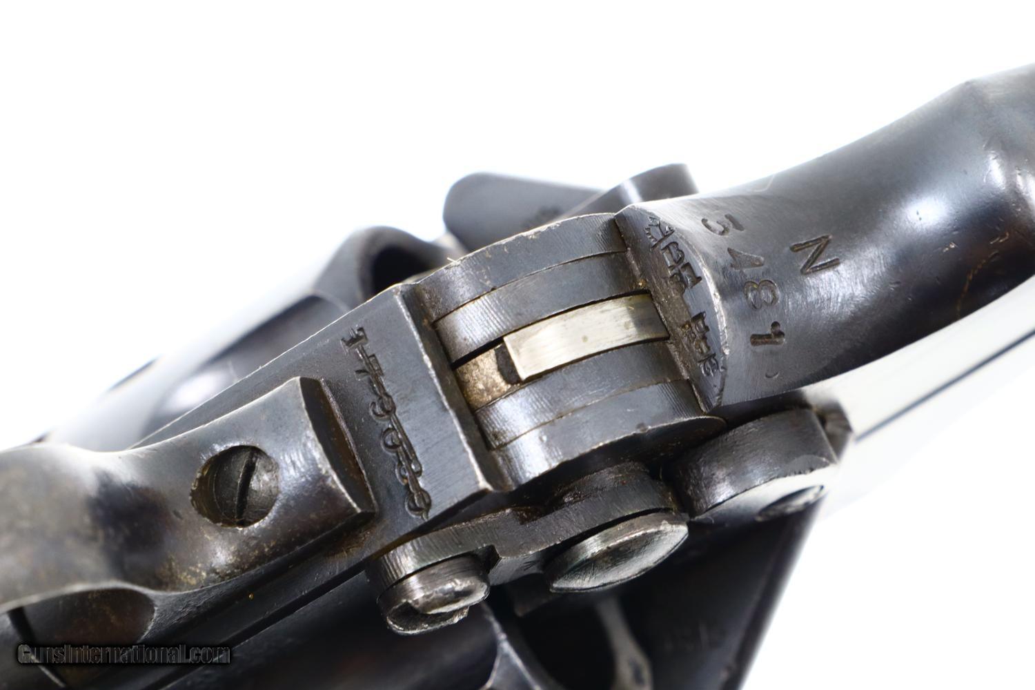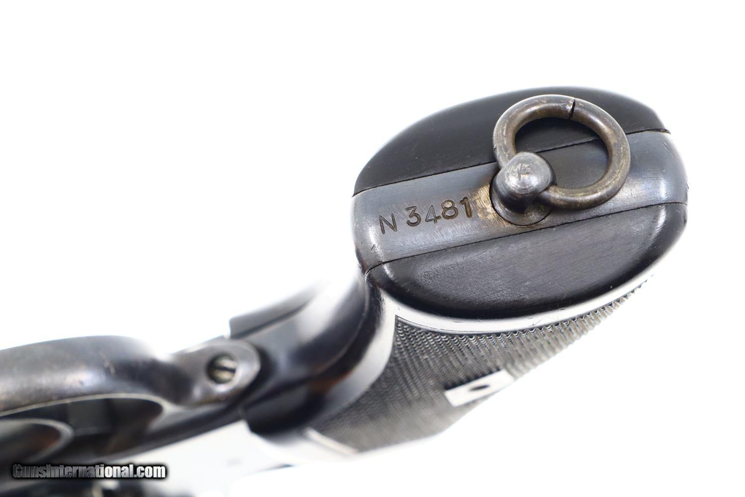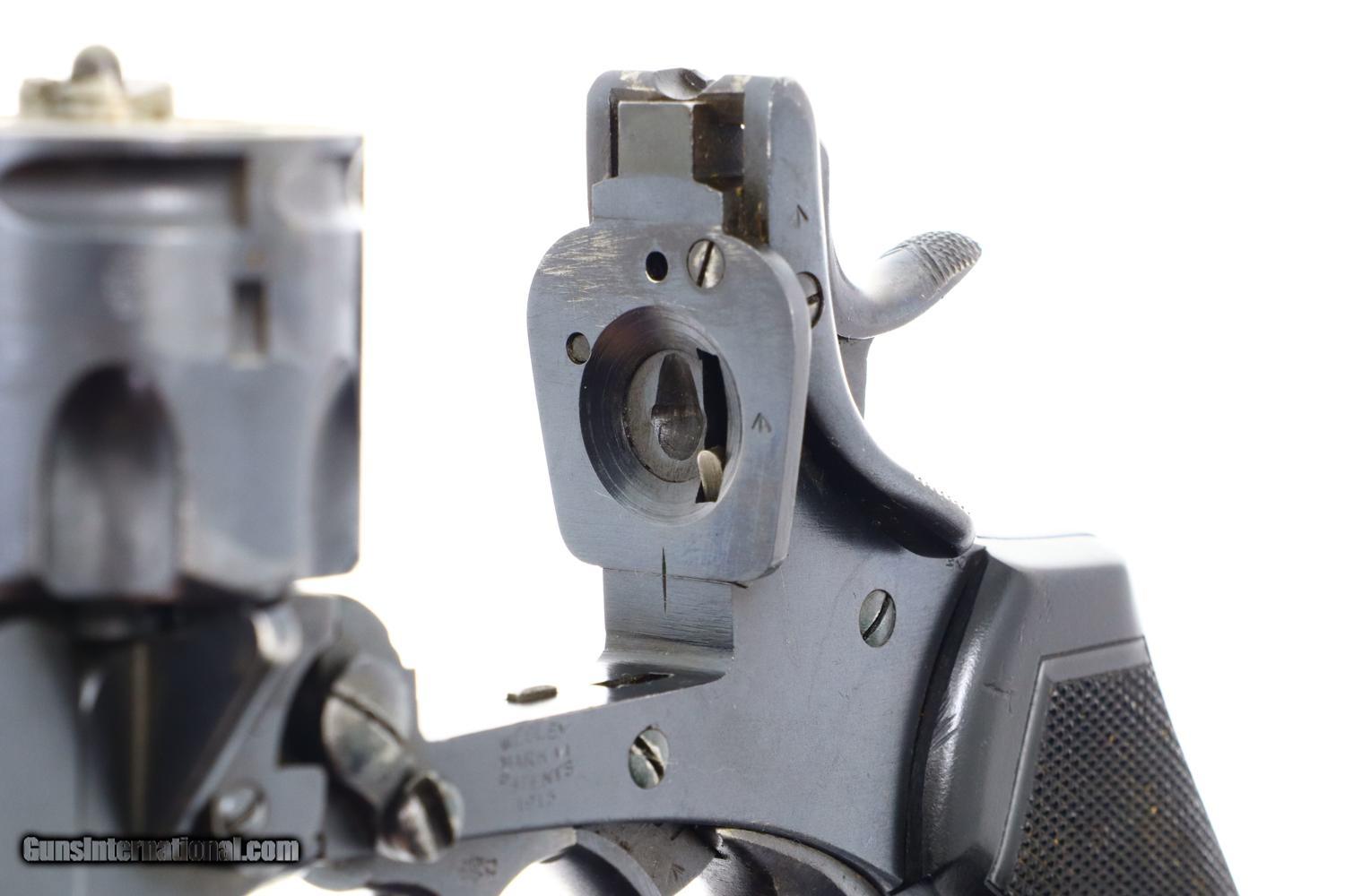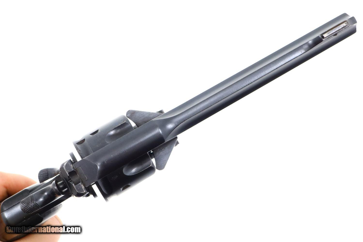 Description: Synopsis: Webley Mark VI, British Military WWI, Holster, N3481, FB01127 Description: Large and immediately recognizable Webley Mark VI revolver from WWI, this example manufactured in 1915, later reworked to allow chambering of the .45 ACP cartridge/half moon clips. In the course of reworking, the gun was renumbered now to matched to N3481 that appears on the bottom of the barrel lug, on cylinder (partially shaved off), right side of trigger guard, and bottom of frame. Markings are otherwise standard to include the Mark VI reference on the left side of the top strap and the Webley patent reference on the left side of the frame. Usual scattered British proofs. Fitted with original bakelite grips and rotatable lanyard ring. Complete with original WWII khaki belt holster dated 42 and original British proofed cleaning rod. Condition: VG+ as arsenal reworked, now with 90-95% of the reworked finish, minimal sharp edge wear, oxidative etching on bottom of trigger guard as carefully photographed. Mirror bore. Perfect manual mechanics. EXC holster and cleaning rod. A very nice ensemble originally made in 1915, then reworked to a more popular caliber, complete with WWII Military holster and accepted cleaning rod. ~~Insured shipping fee of $55; most packages shipped using FedEx 2nd Day.~~ SOLD Curio/Relic: Yes Manufacturer: Webley Serial Number: N3481 Caliber Info: .45 ACP |