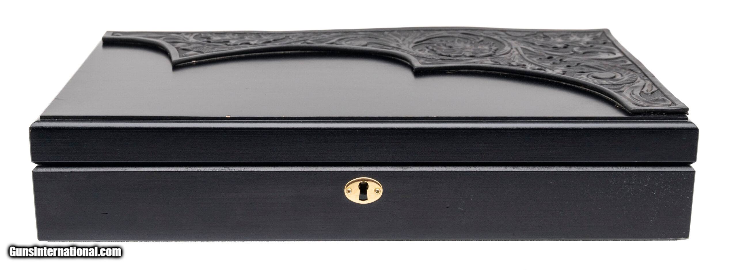 Description: "SN: J87741, Commemorative Single Action Army made by Taylors & Co in partnership with America Remembers in 2011. Featuring a 7.5" barrel, with checkered black grips, blued finish with a case hardened frame, gold accent pieces and gold engraving it is numbered 004 of 300 on the butt. Overall in very good condition, comes with a custom display case with hand tooled leather accent piece on the lid. Dallas Location Price: $1,500.00 Contact Seller |
