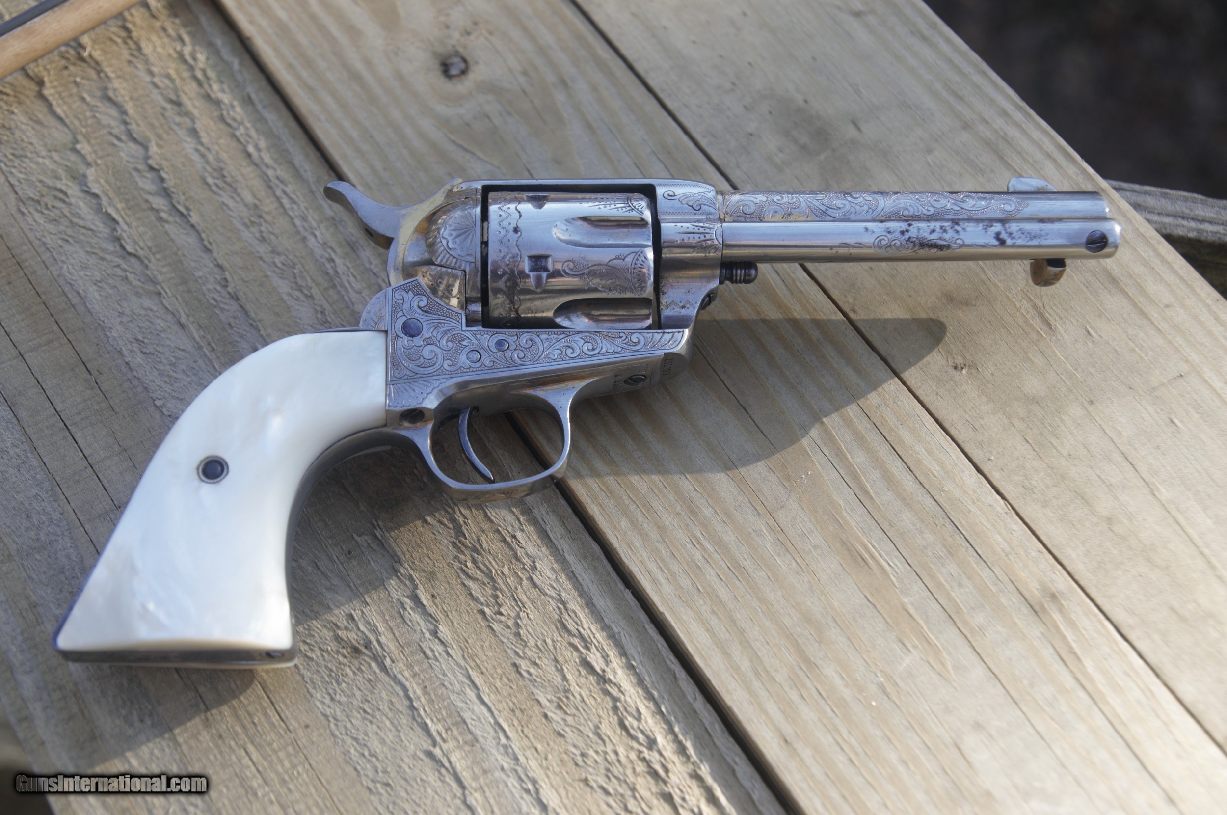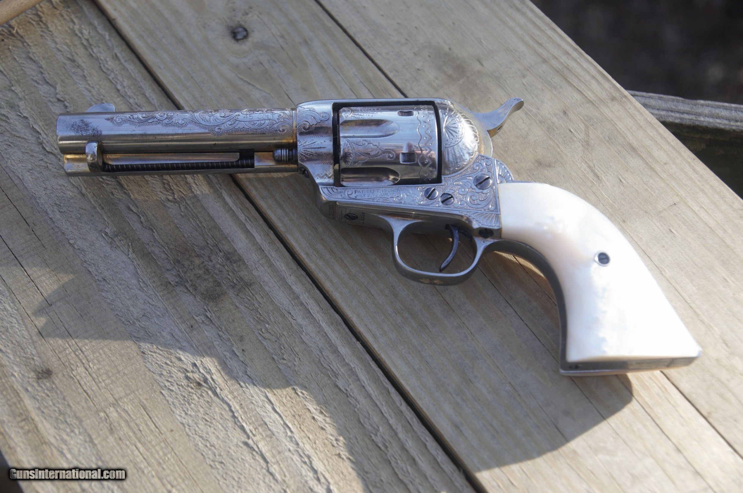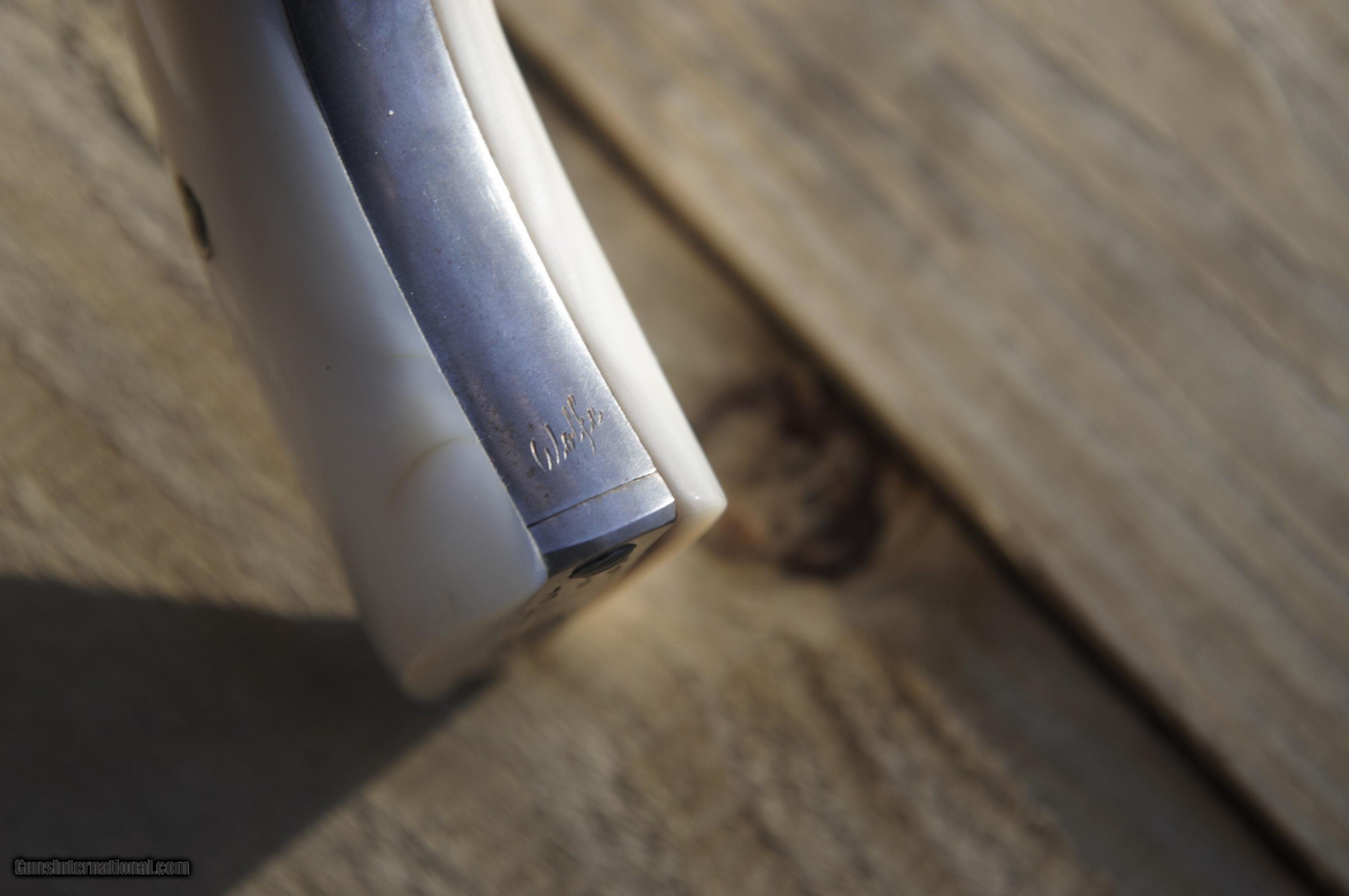 Description: The Cash price is, $8500.00 for this gun plus s.h. &i. Cash only on this weapon, I will consider reasonable cash offers. This 45 cal.Colt SAA pistol, matching serial numbers except gate and on frame, these match each other, was manufactured in 1895 and then shipped to a store in El Paso, Texas, Engraved by a guy named Wolfe, his name is engraved on the front gripstrap, it was then nickled and gold washed. some gold wash is still present on various areas of the gun. In very good condition, the pistol has some slight rust speckling on the cylinder and barrel area, this should clean up nicely. Mother of pearl grips, the action cycles and locks up tight in two positions, and fires. Bore is clean. A very rare item. Does not require an FFL for transfer, can and will ship direct. Please enail me when ordering though you are welcome to call as well. $35.00 SH&I in the lower 48 states. Thanks, Mark SOLD Curio/Relic: Yes Handgun Caliber: .45 Colt Model: Single Action Army |