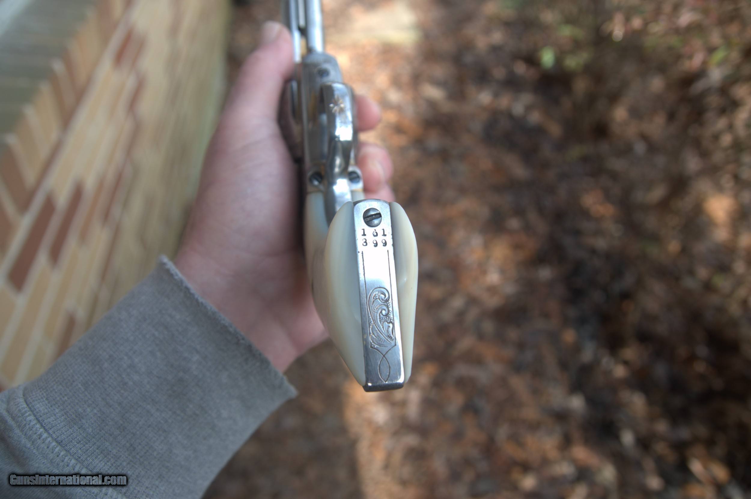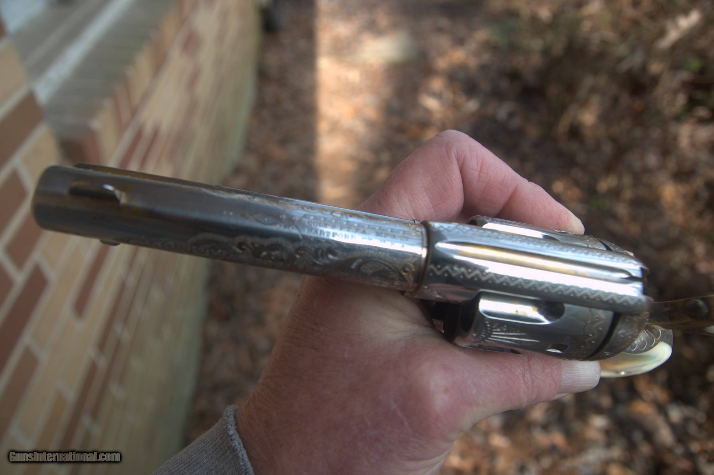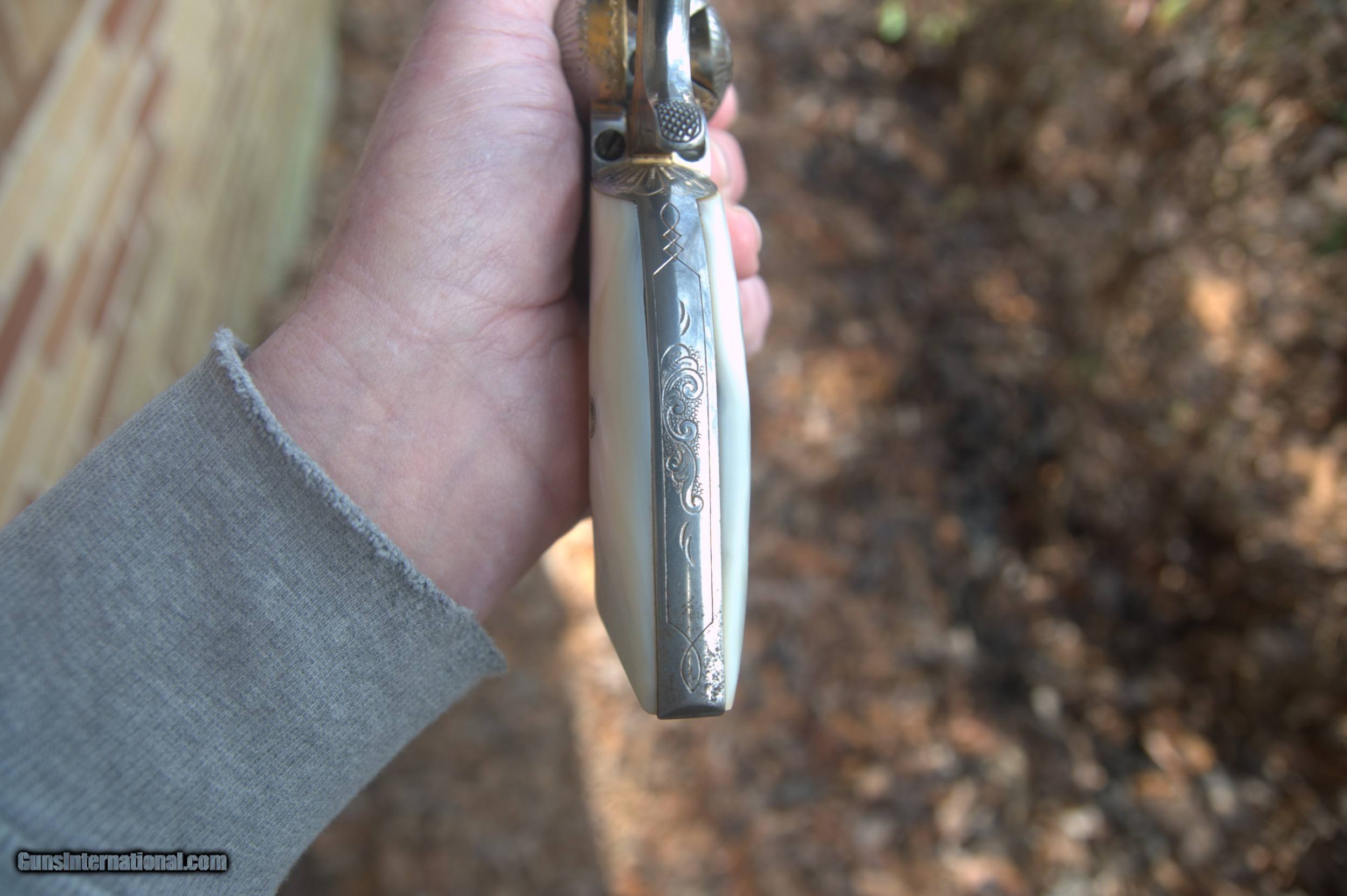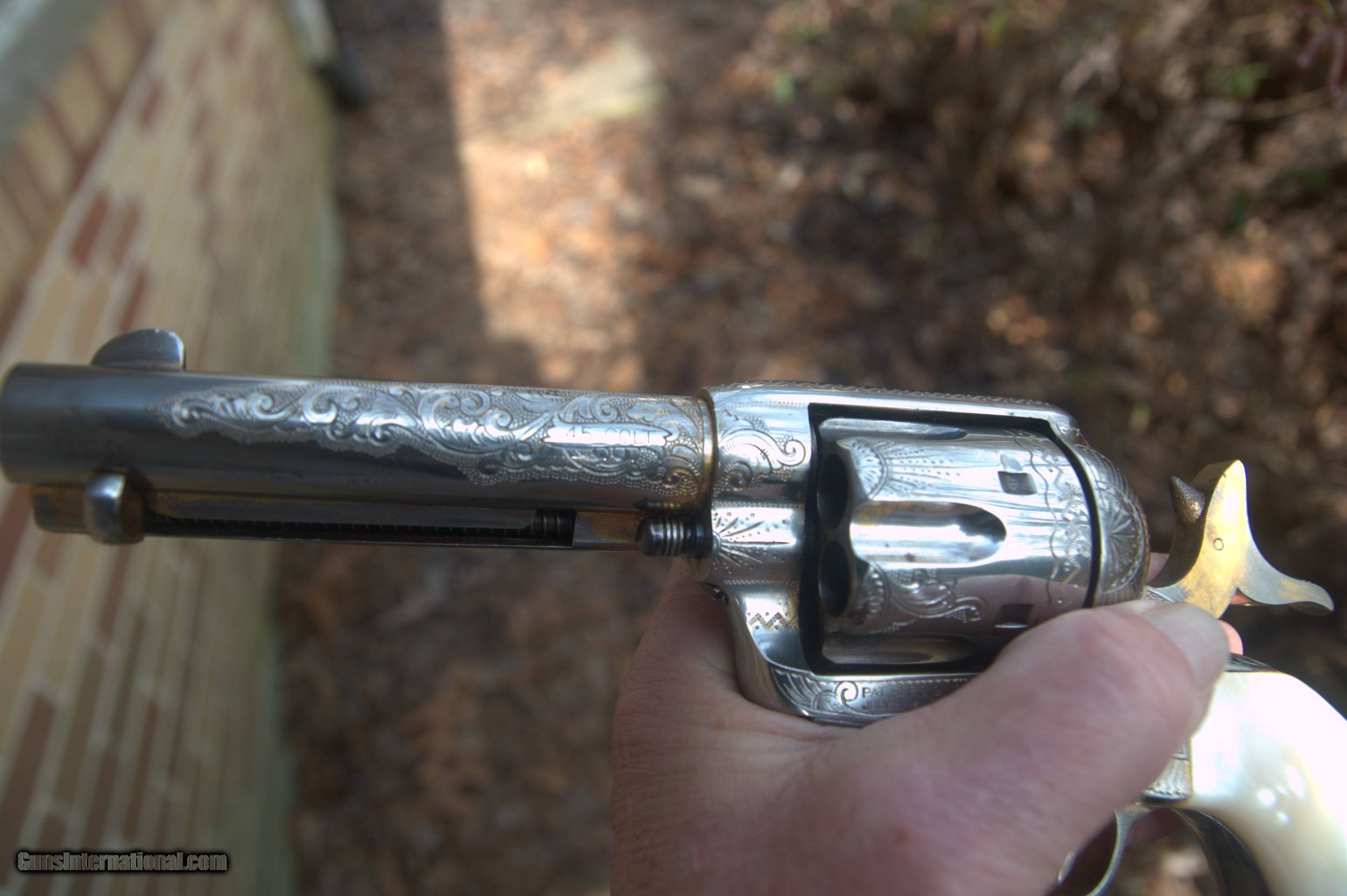 Description: The Cash price is, $8500.00 for this gun plus s.h. &i. Cash only on this weapon, I will consider reasonable cash offers. This 45 cal.Colt SAA pistol, matching serial numbers except gate and on frame, these match each other, was manufactured in 1895 and then shipped to a store in El Paso, Texas, Engraved by a guy named Wolfe, his name is engraved on the front gripstrap, it was then nickled and gold washed. some gold wash is still present on various areas of the gun. In very good condition, the pistol has some slight rust speckling on the cylinder and barrel area, this should clean up nicely. Mother of pearl grips, the action cycles and locks up tight in two positions, and fires. Bore is clean. A very rare item. Does not require an FFL for transfer, can and will ship direct. Please enail me when ordering though you are welcome to call as well. $35.00 SH&I in the lower 48 states. Thanks, Mark SOLD Curio/Relic: Yes Handgun Caliber: .45 Colt Model: Single Action Army |