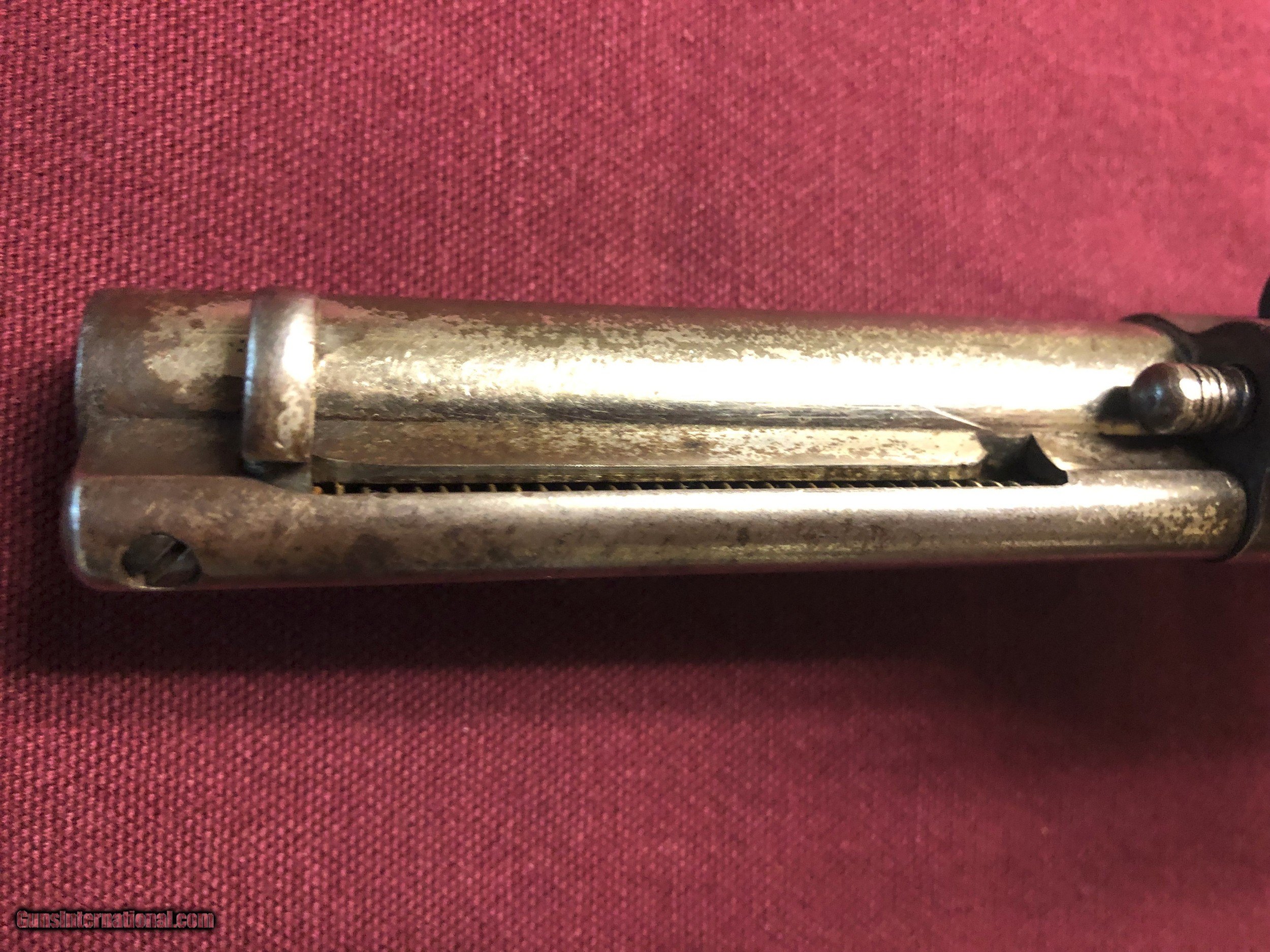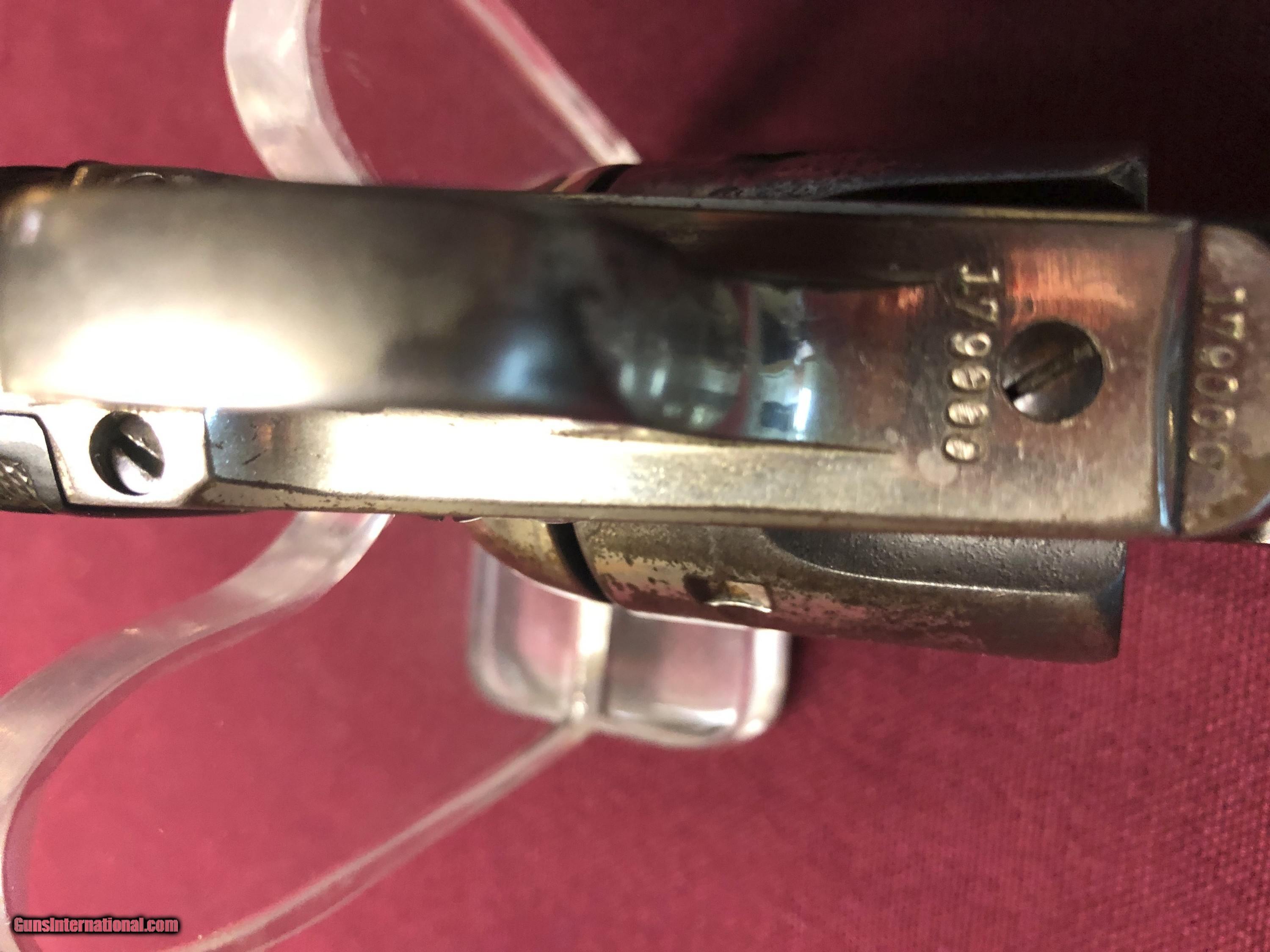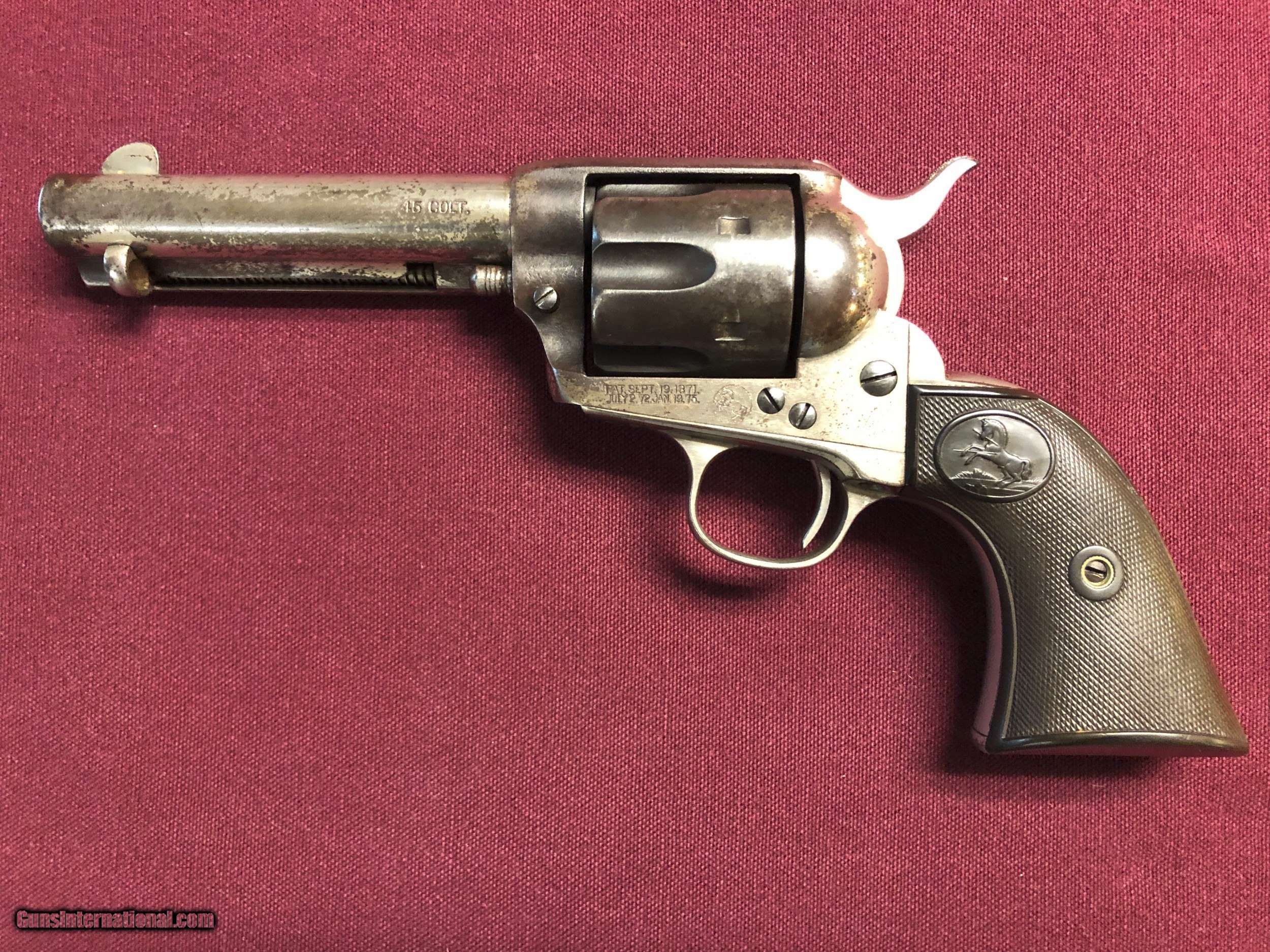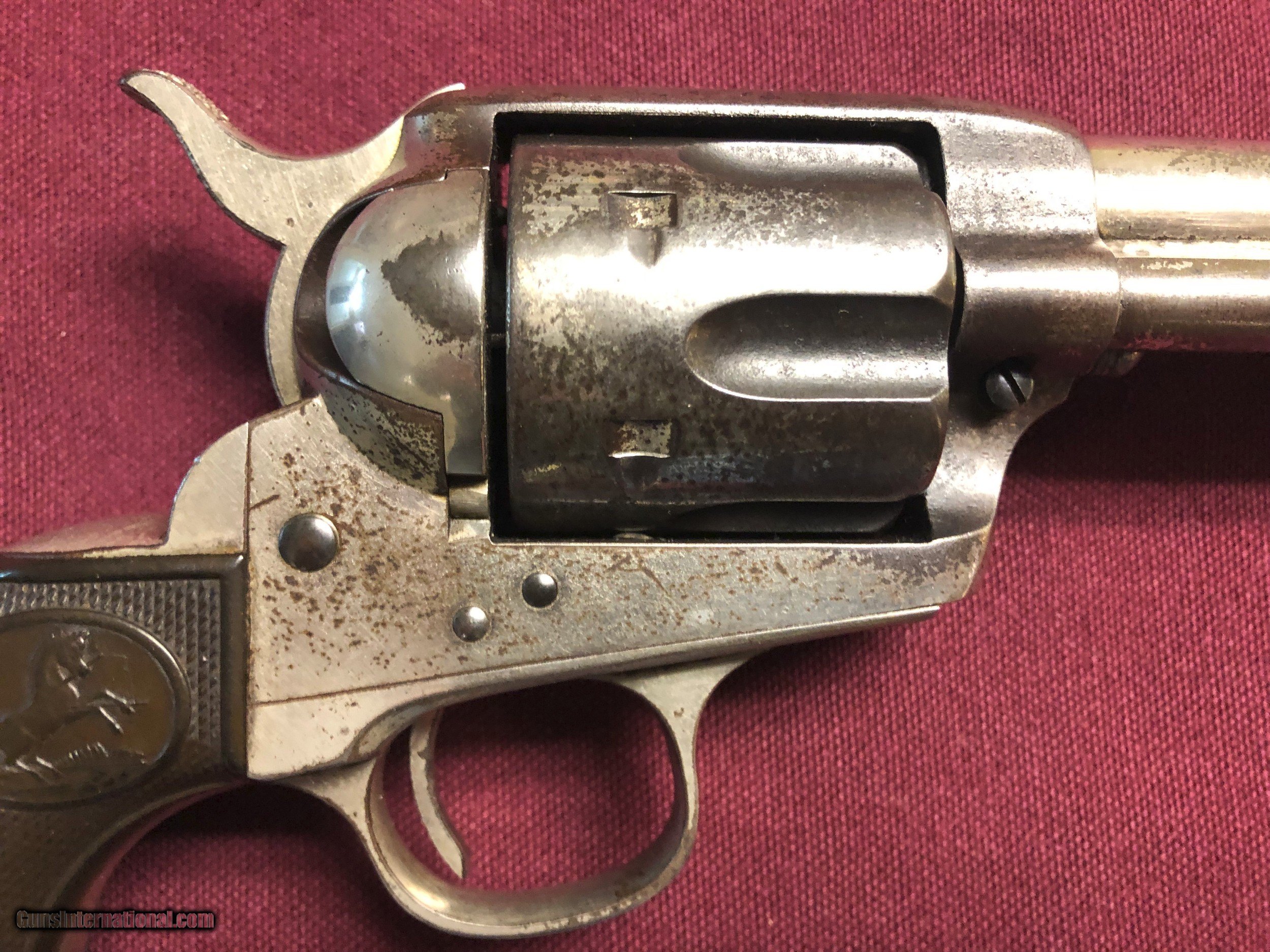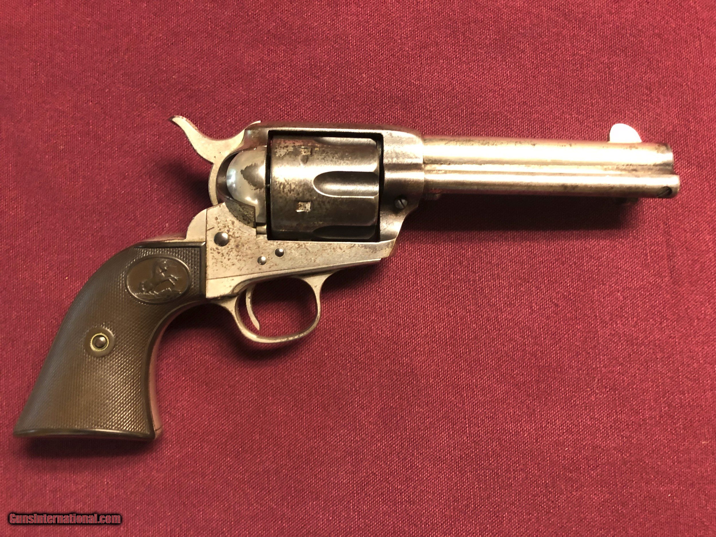 Description: 1898 COLT SAA 45 caliber in Nickel with 4 3/4 inch barrel. Factory grips are in excellent shape. no chips cracks or notches. On the left side of the muzzel there is a flat spot. The finish is all factory, this gun has not been messed with. There is lots of finish as the pictures show, this is just a very nice piece that needs a new home. Shipping $50.00 lower 48 Cashiers Check. No FFL required. I have a couple other 1st Generations listed if you haven't seen them, take a look. SOLD |
