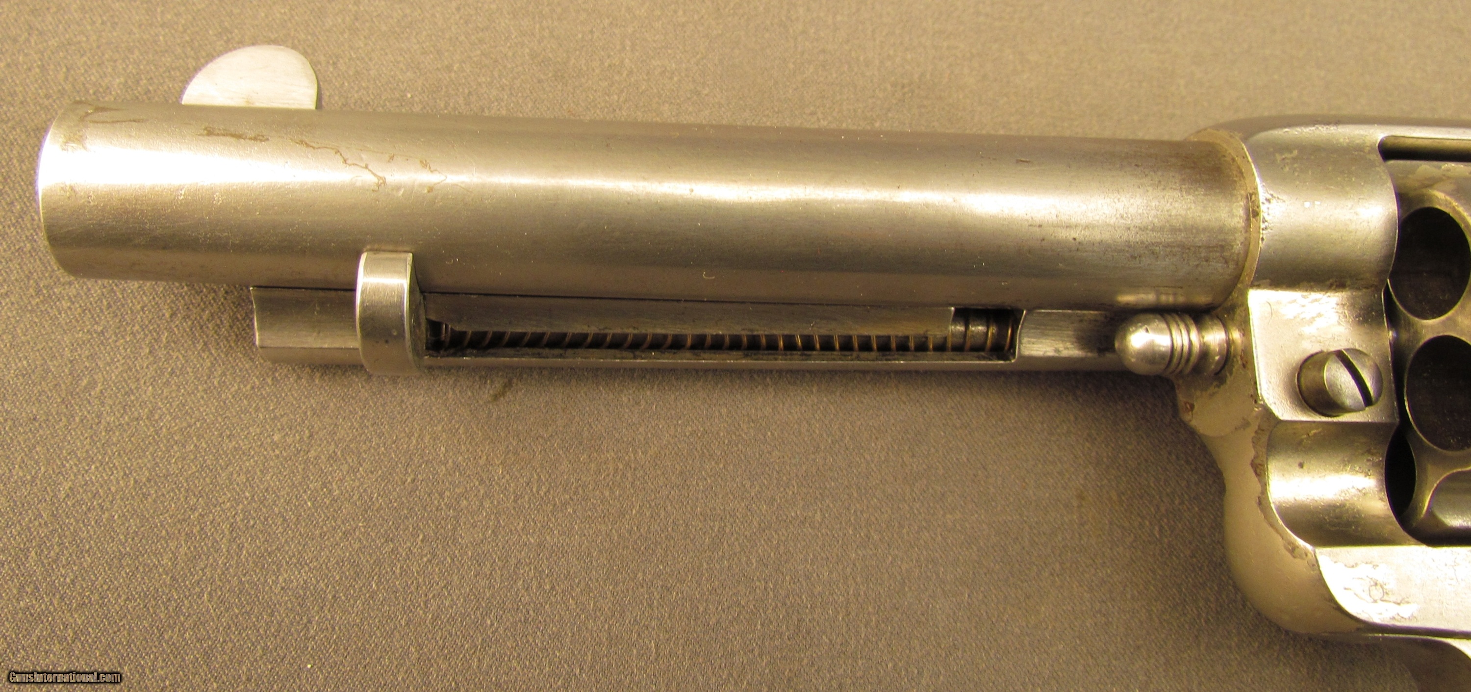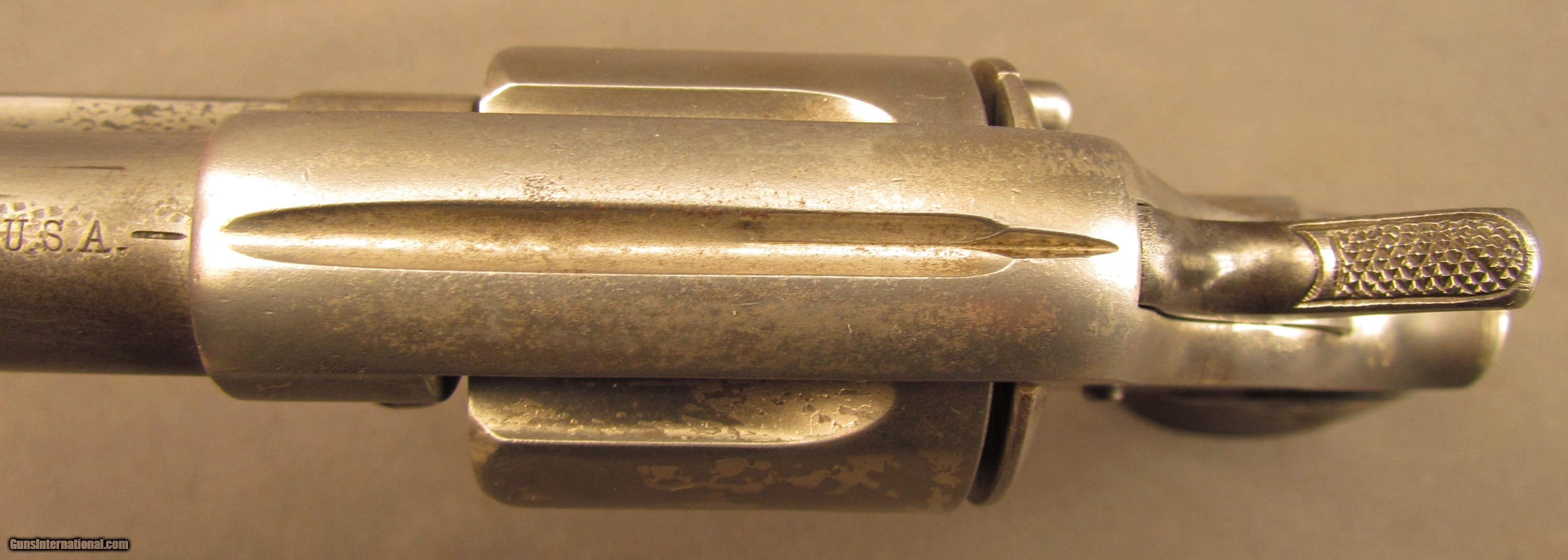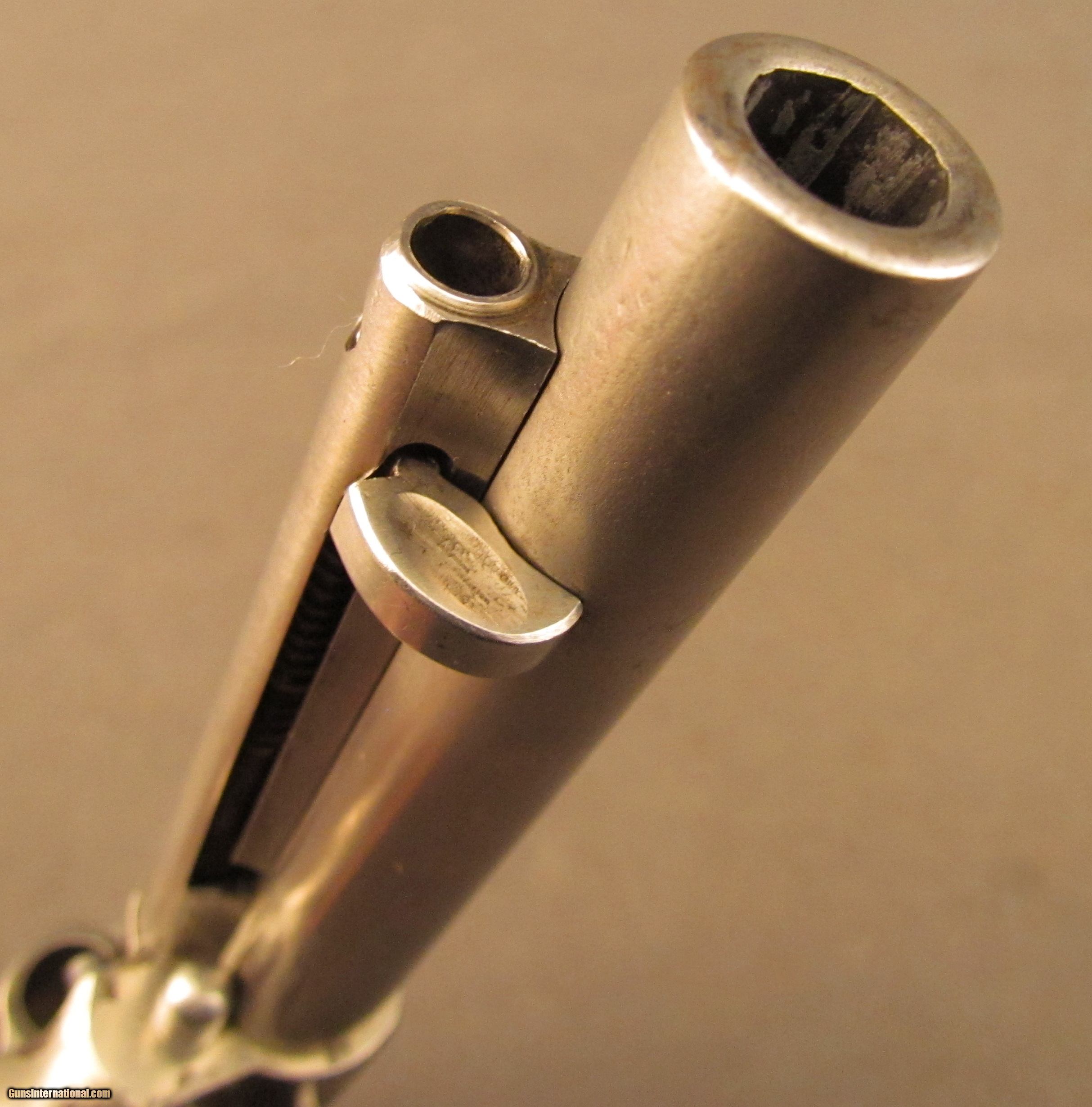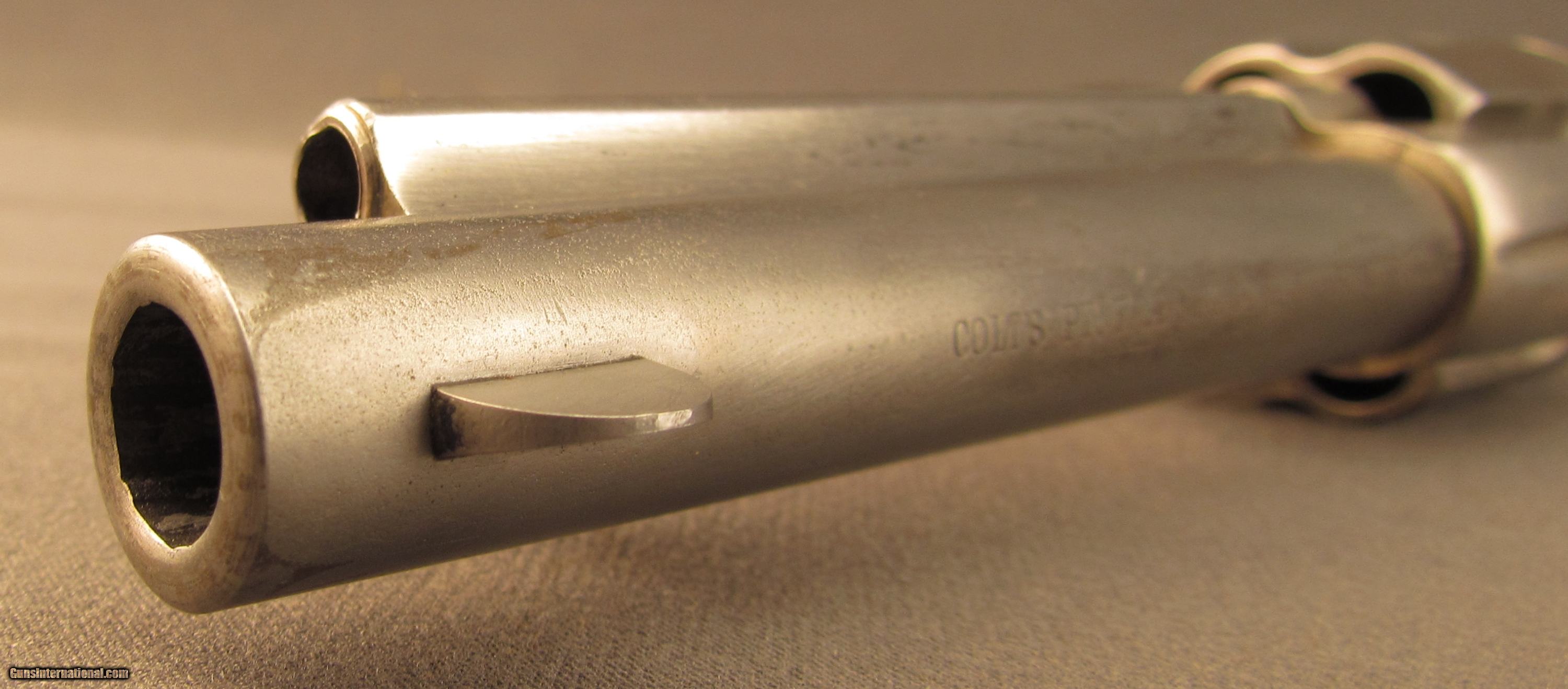 Description: Serial #12698, .45 Colt, 5 1/2" barrel with a fine, bright bore that has some freckling and mild pinprick pitting within the grooves. This is a very nice, 1884-made revolver that has about 40-45% of the original nickel finish remaining, mostly on protected areas, with the balance of the metal having flaked to a bright, pewter gray patina. A few further surface scratches and small peen marks are also present on the top of the barrel. The hammer and trigger likewise have faint traces of original bright fire blue remaining on some of the protected areas. The checkered hard rubber grips are intact, and in very good shape with light surface wear and some mild flattening of the points along both panels. The mechanism is fully functional both in single and double action, and the lock-up is still tight. This is a handsome, antique Colt 1878 that is in very good-near fine condition. Antique SOLD Antique: Yes Manufacturer: Colt Model: 1878 Serial Number: 12698 Caliber Info: .45LC Gauge Info: .45LC |