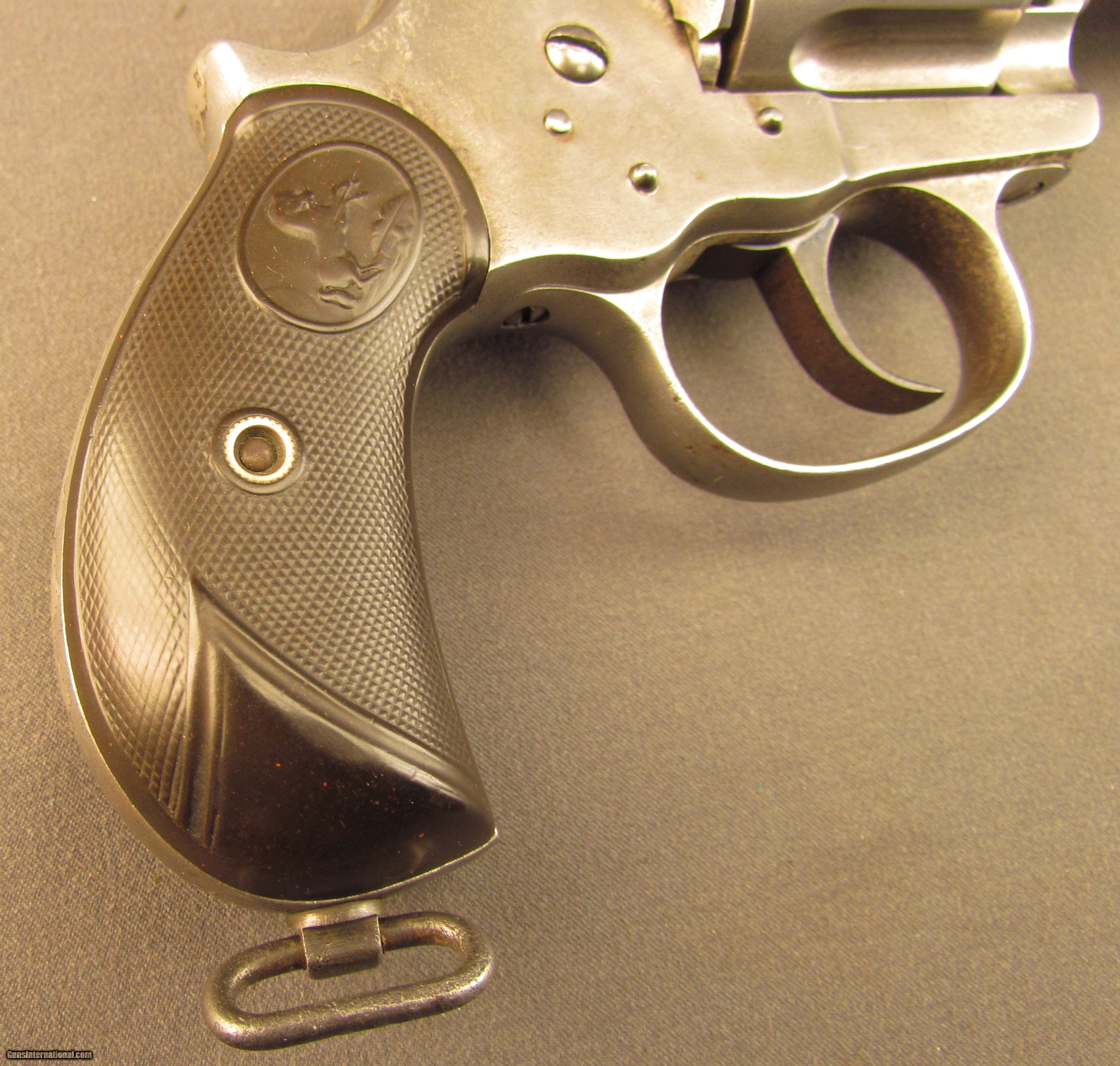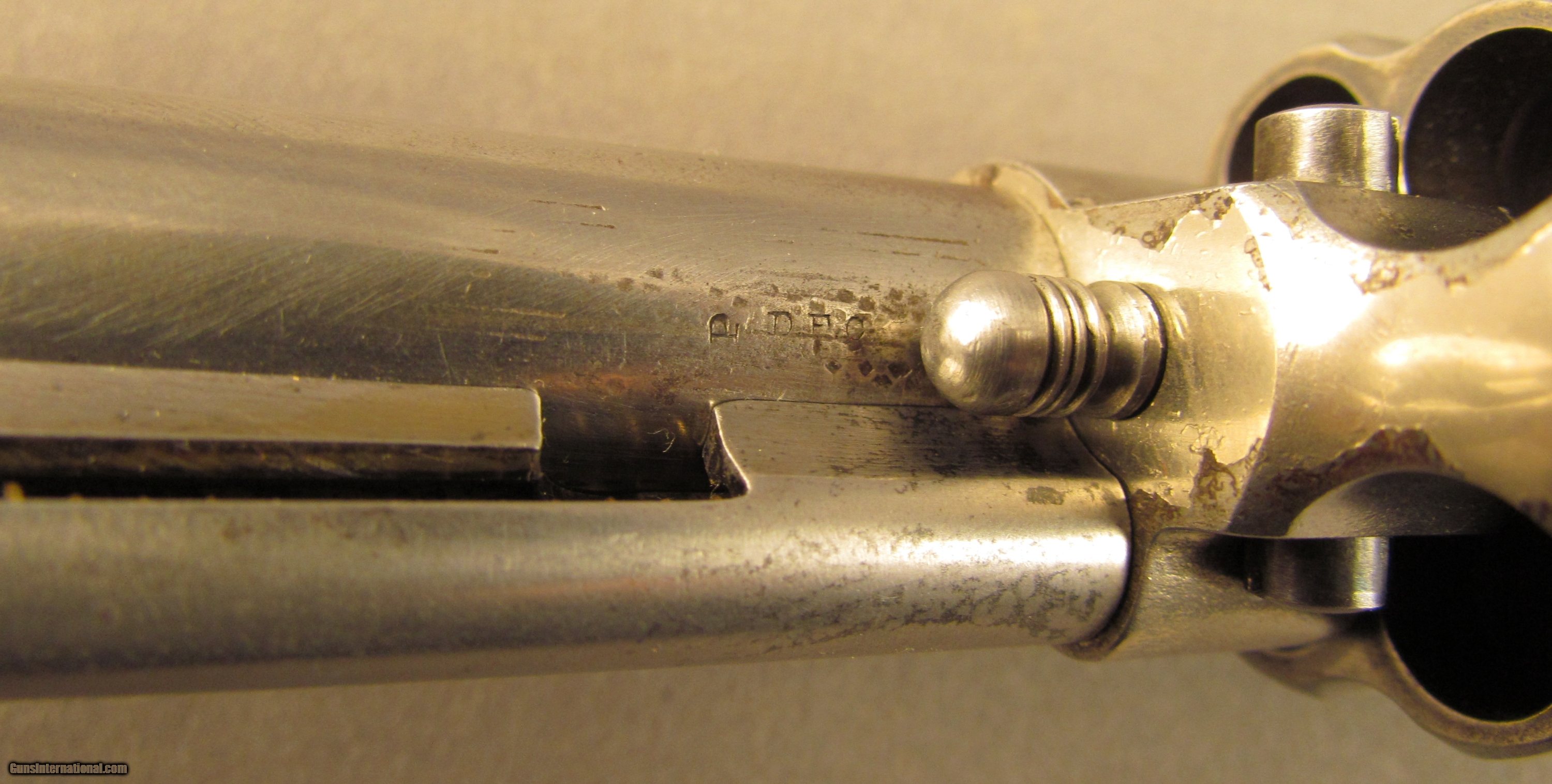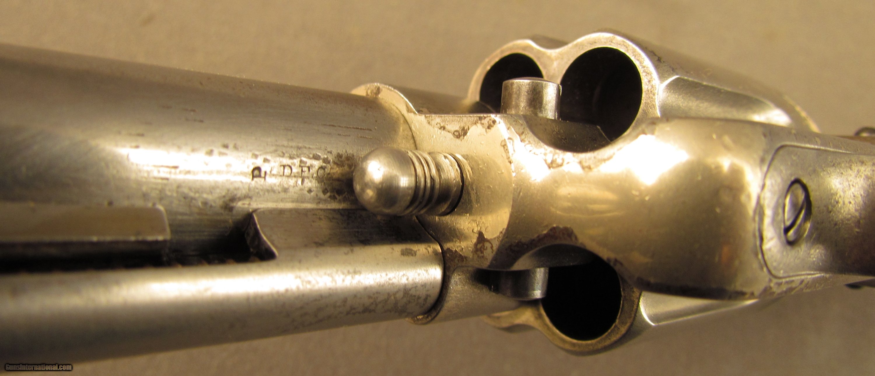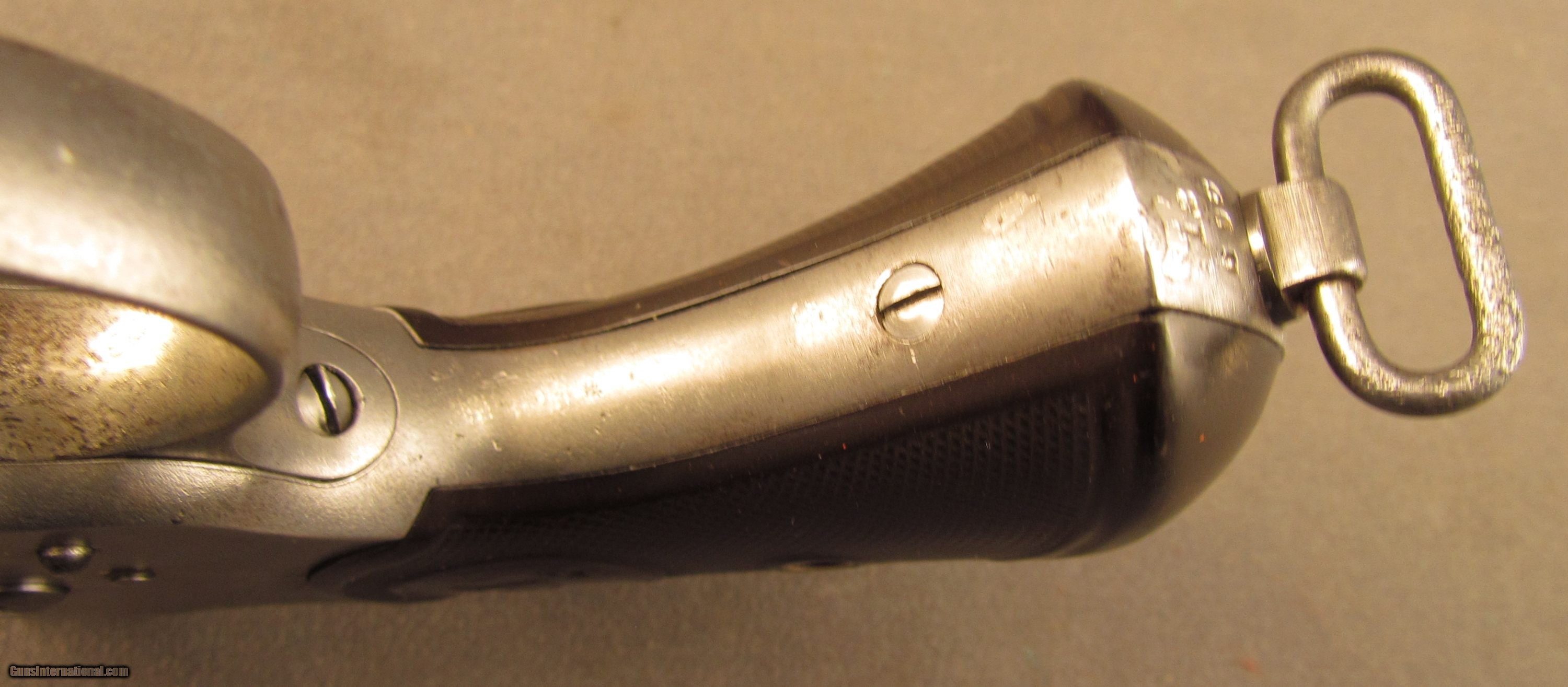 Description: Serial #12698, .45 Colt, 5 1/2" barrel with a fine, bright bore that has some freckling and mild pinprick pitting within the grooves. This is a very nice, 1884-made revolver that has about 40-45% of the original nickel finish remaining, mostly on protected areas, with the balance of the metal having flaked to a bright, pewter gray patina. A few further surface scratches and small peen marks are also present on the top of the barrel. The hammer and trigger likewise have faint traces of original bright fire blue remaining on some of the protected areas. The checkered hard rubber grips are intact, and in very good shape with light surface wear and some mild flattening of the points along both panels. The mechanism is fully functional both in single and double action, and the lock-up is still tight. This is a handsome, antique Colt 1878 that is in very good-near fine condition. Antique SOLD Antique: Yes Manufacturer: Colt Model: 1878 Serial Number: 12698 Caliber Info: .45LC Gauge Info: .45LC |