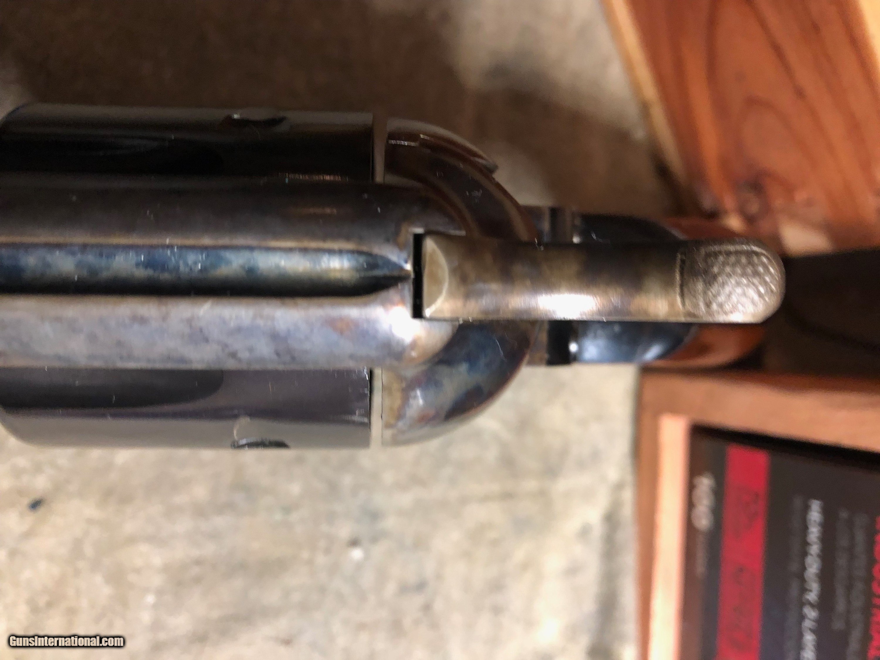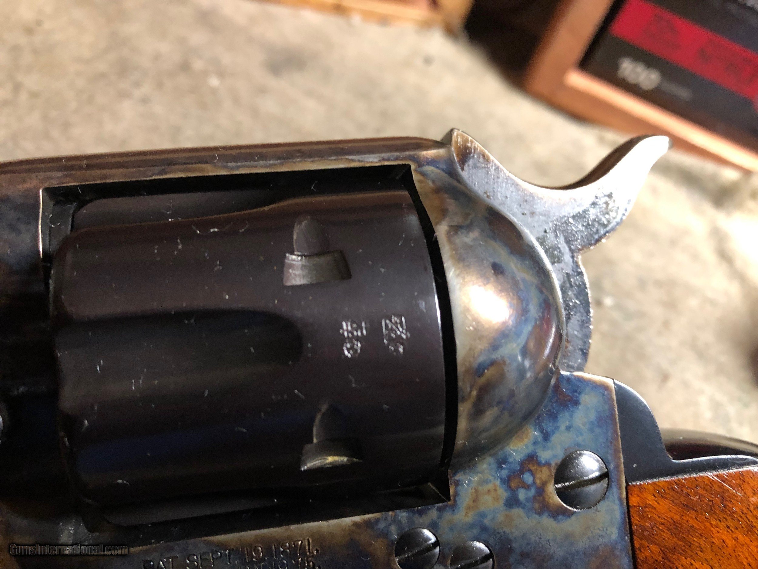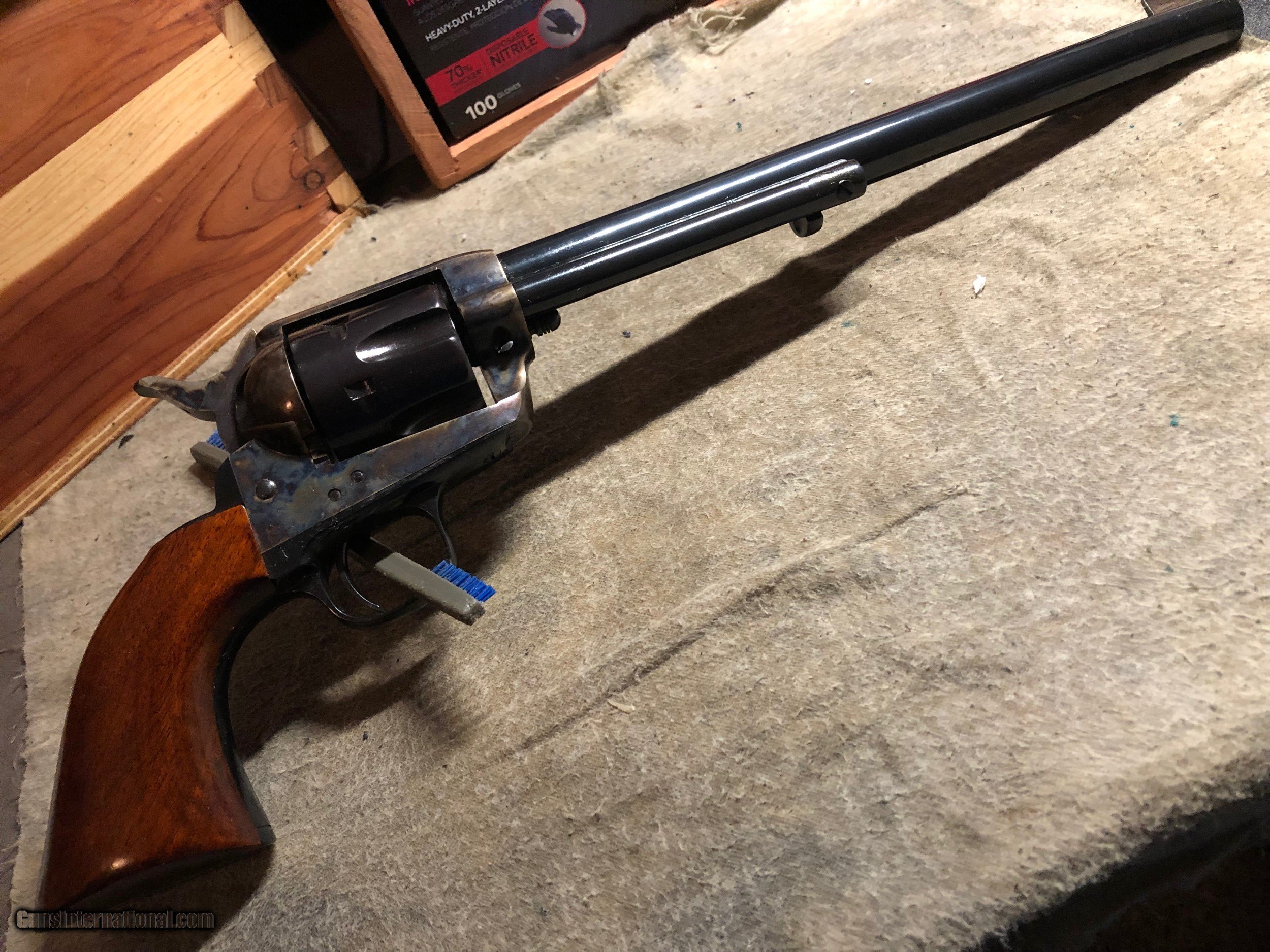 Description: I have a like new Armi San Marcos 45 Colt. This beautiful pistol has a 10" barrel with a bright bore and deep, rich bluing. It sports sharply defined case-hardened receiver with beautitul rose wood grips. It is a great imitation of the old original Colt SSA. Unfortunately, no box. SOLD Handgun Caliber: .45 Colt Manufacturer: Armi San Marcos Model: EMF-SA Serial Number: SA16658 Barrel Length: 10 Chambers: 6 Condition: Like New Metal Condition: Perfect Wood Condition: Perfect Bore Condition: Bright & Shiny Action: Revolver Finish: Blued-Case Hardened Sights: Fixed |