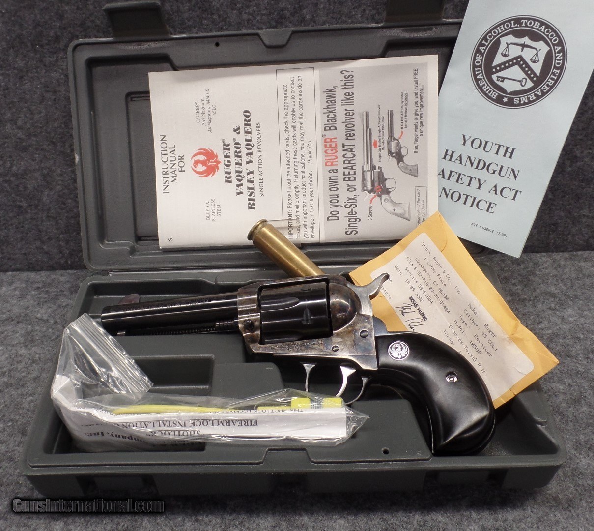 Description: Vaquero Birds Head 45 Colt. Factory test fired 2002 Nice high grade example, barely a turn line, no marks or bumps on the grip or cylinder frames. 4 5/8 barrel. I doubt a box of ammo run through this one. 45LC With box. You won't be disappointed. $750 shipped from my FFL to yours. SOLD Handgun Caliber: .45 Colt Manufacturer: RUGER |