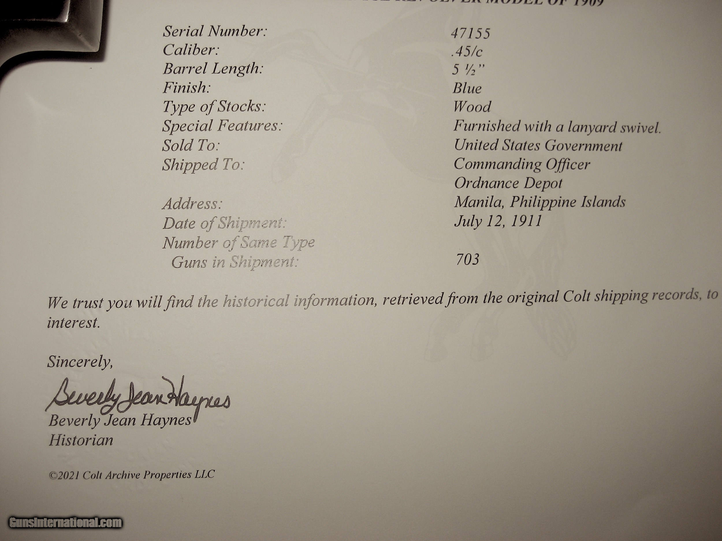 Description: Colt Model 1909 .45 Colt Revolver - 1911 Philippines Insurrection Shipment/ Supplied with official Colt Archives letter. Colt 1909 .45 Colt Revolver - 1909 Philippines insurrection from historically significant shipment to replace US military sidearms from .38c to .45c caliber.